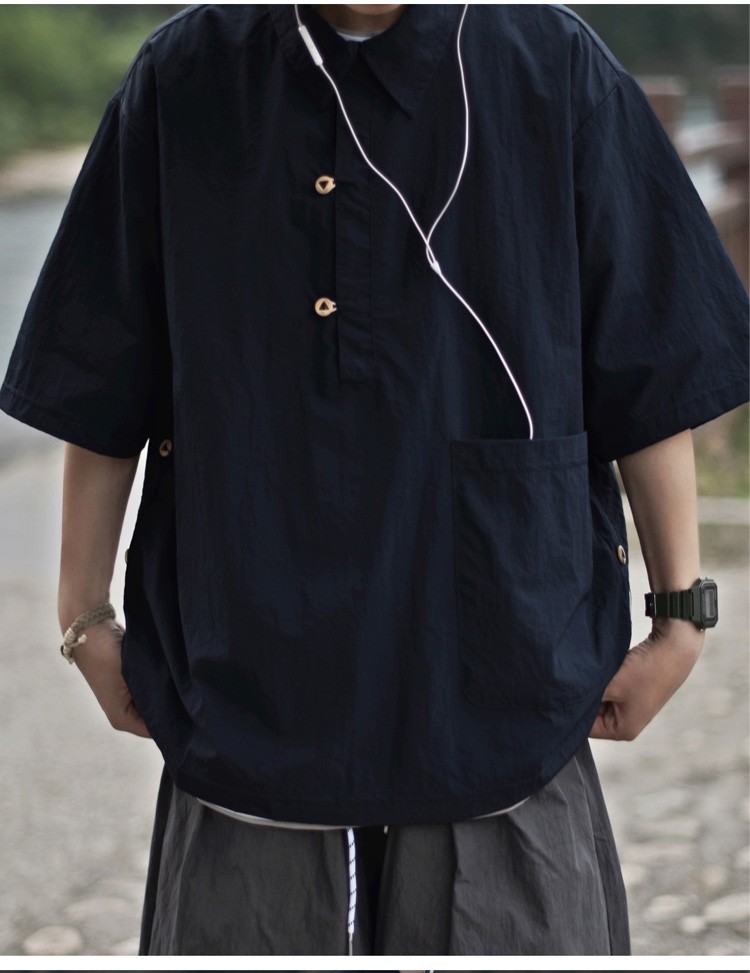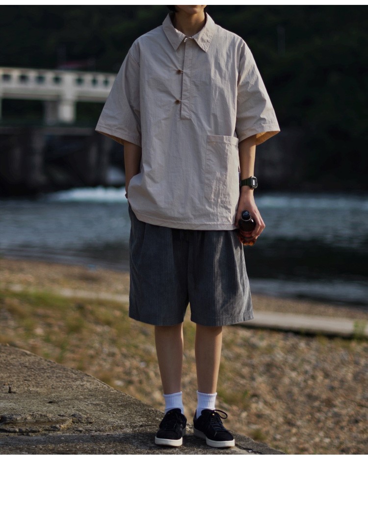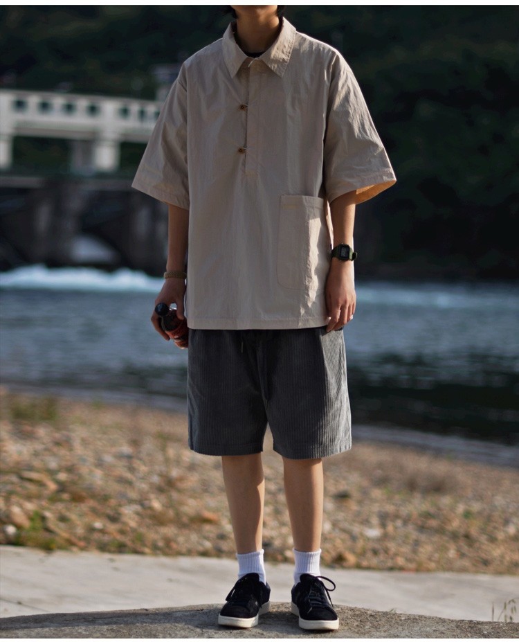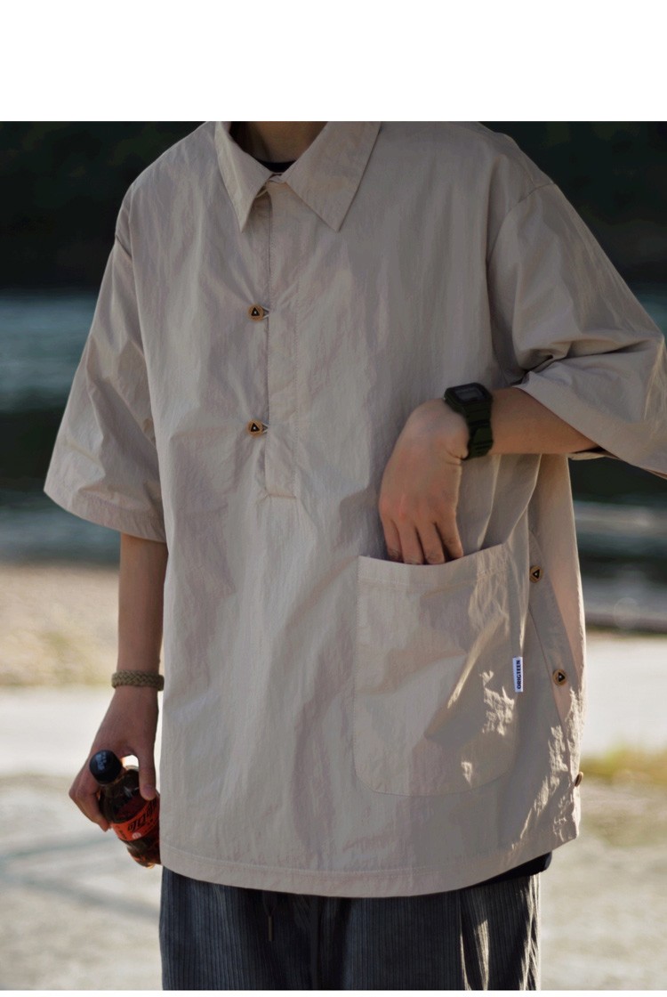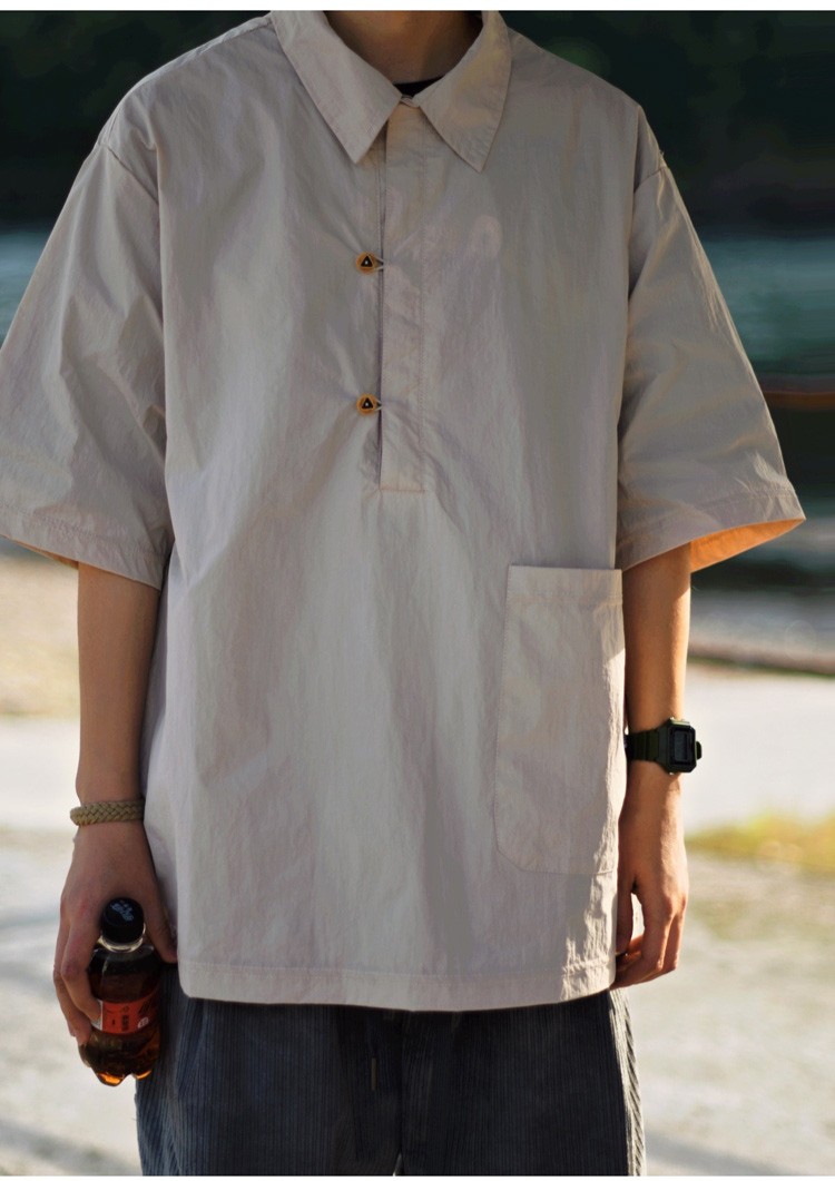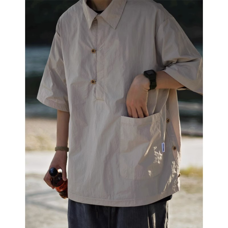 夏季日系純色戶外機能短袖polo衫男女輕薄口袋復古套頭半袖襯衫潮
