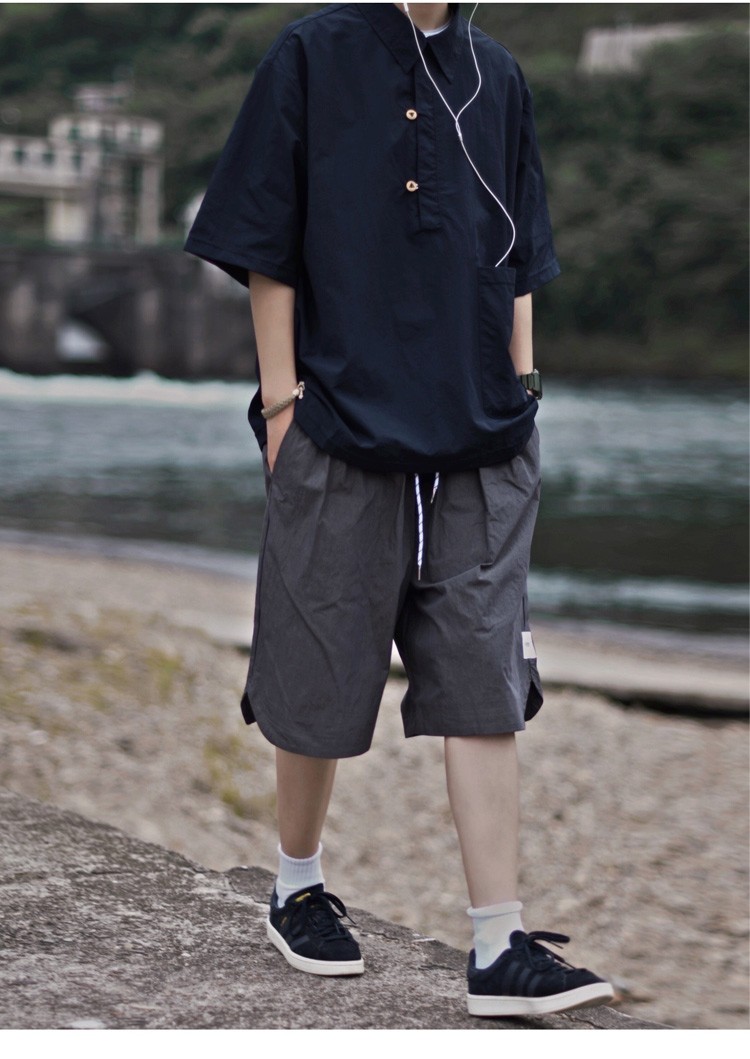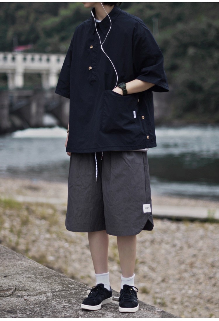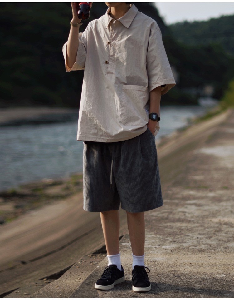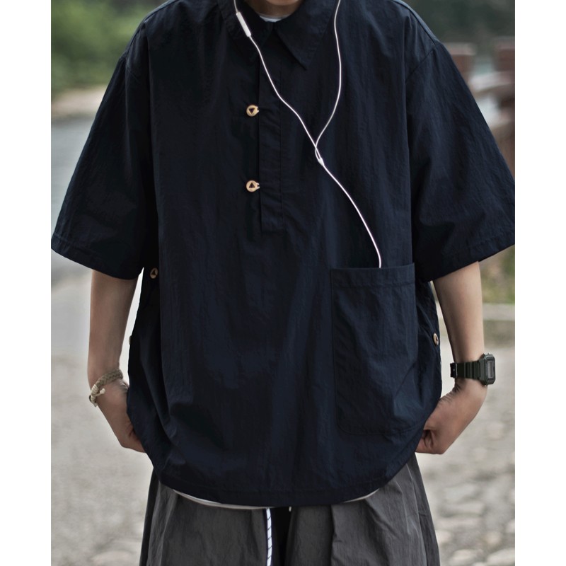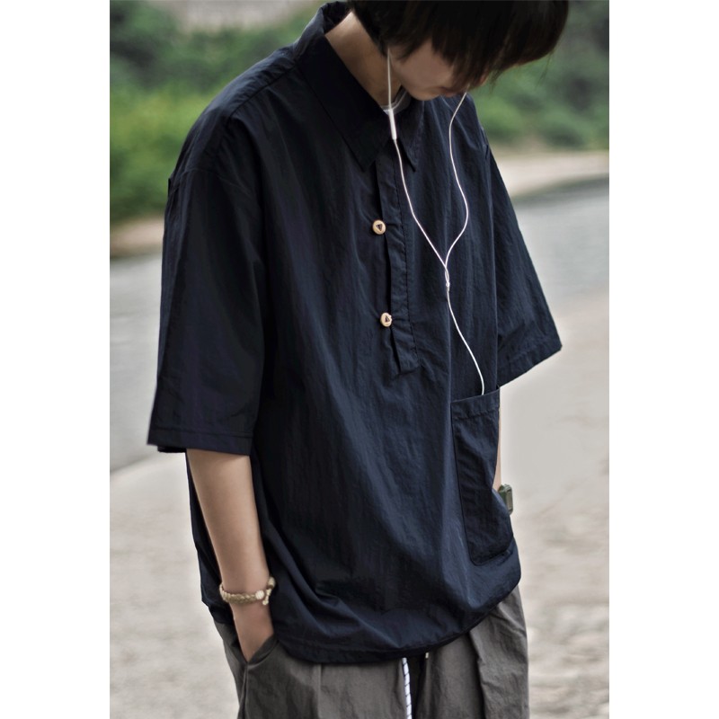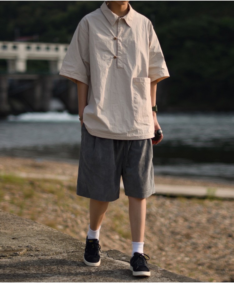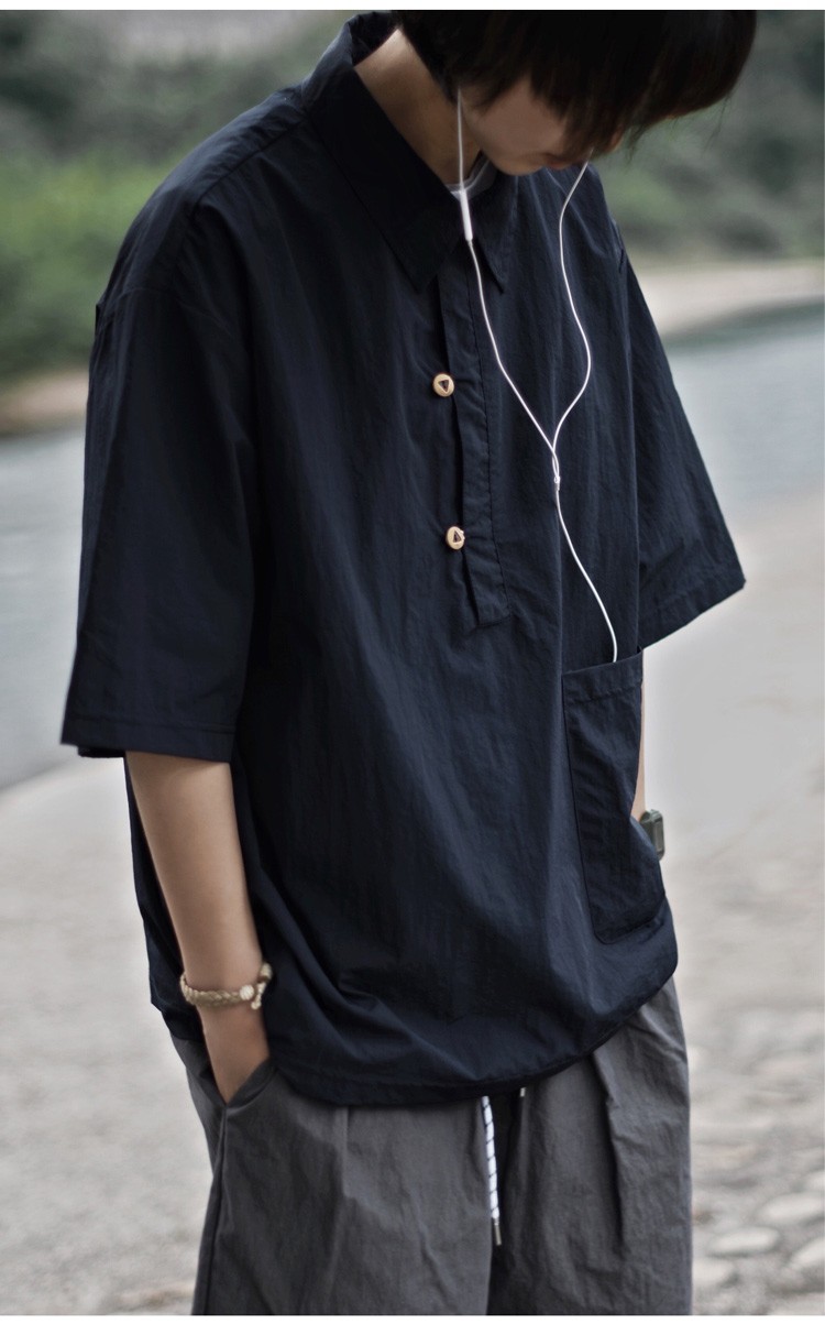夏季日系純色戶外機能短袖polo衫男女輕薄口袋復古套頭半袖襯衫潮