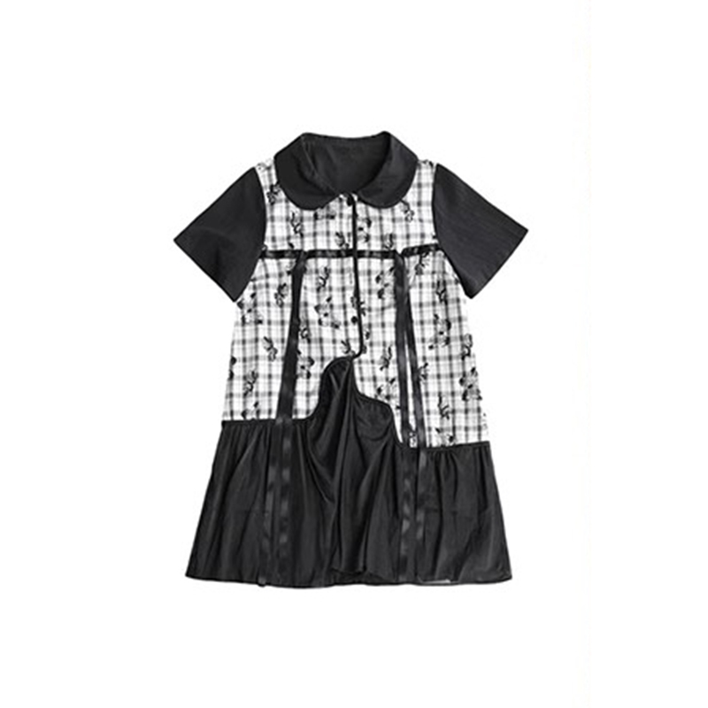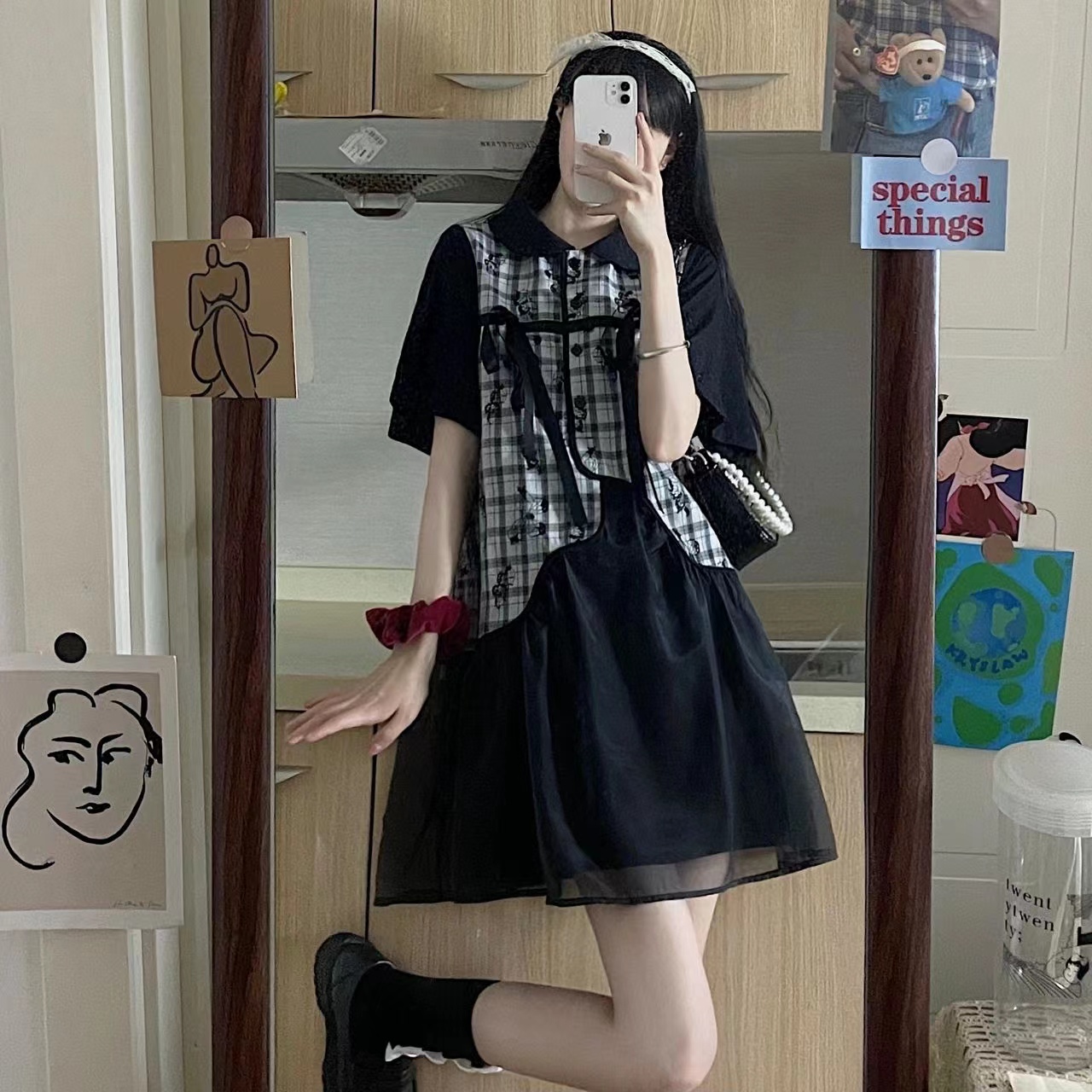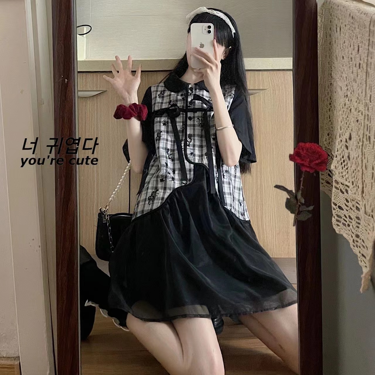 黑色法式復古格子娃娃領洋裝女夏季2023蝴蝶結網紗拼接短款裙子