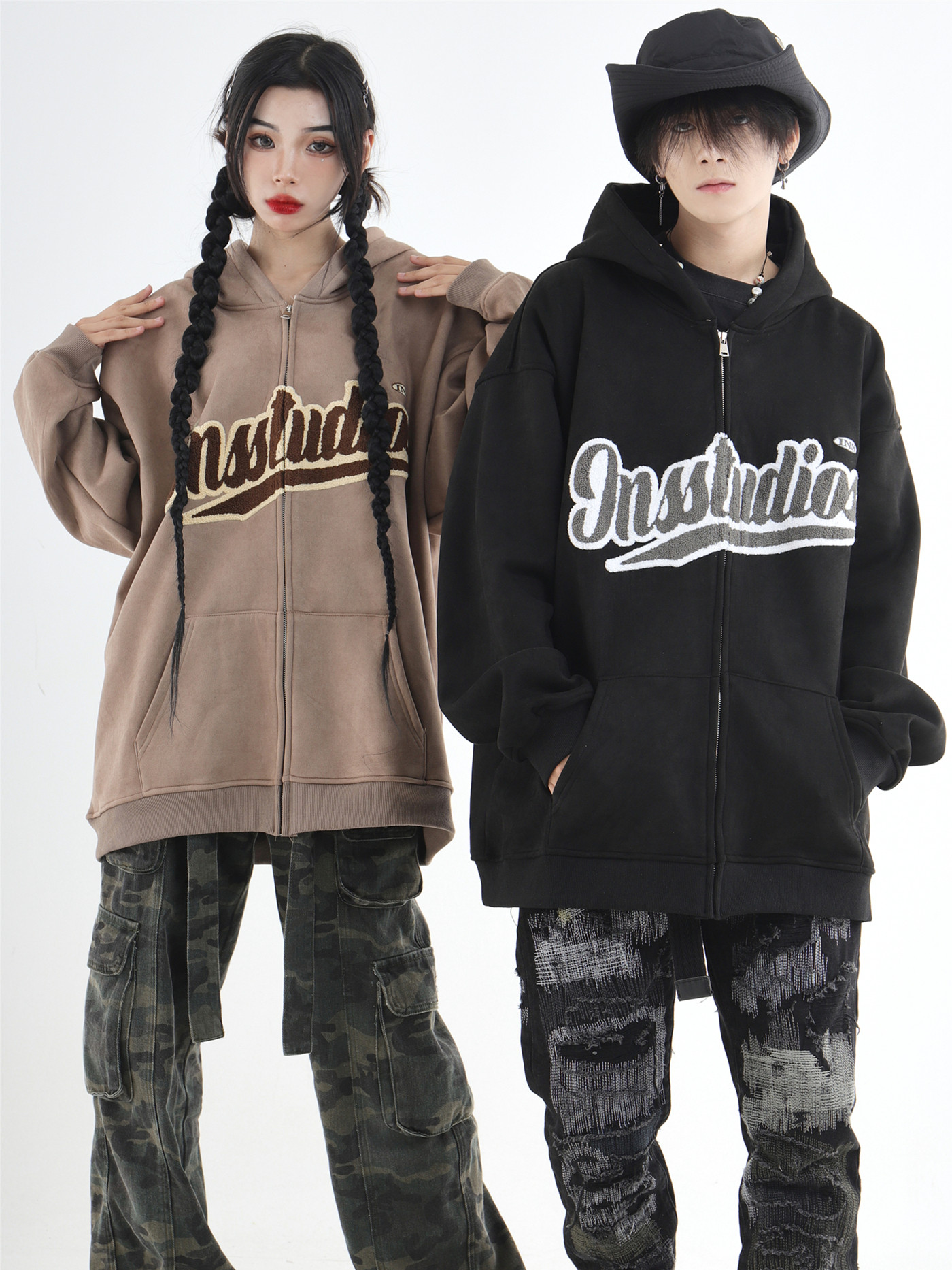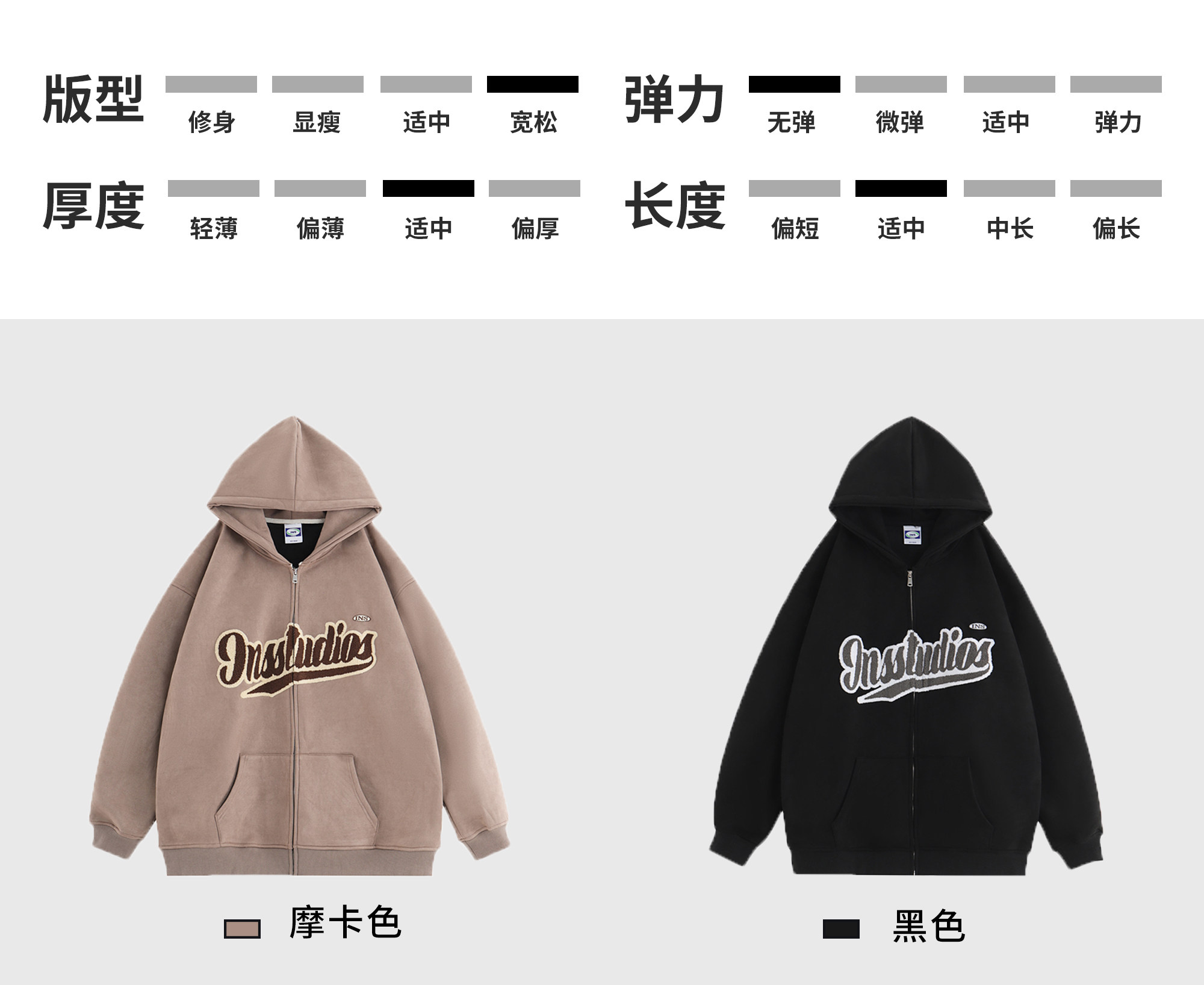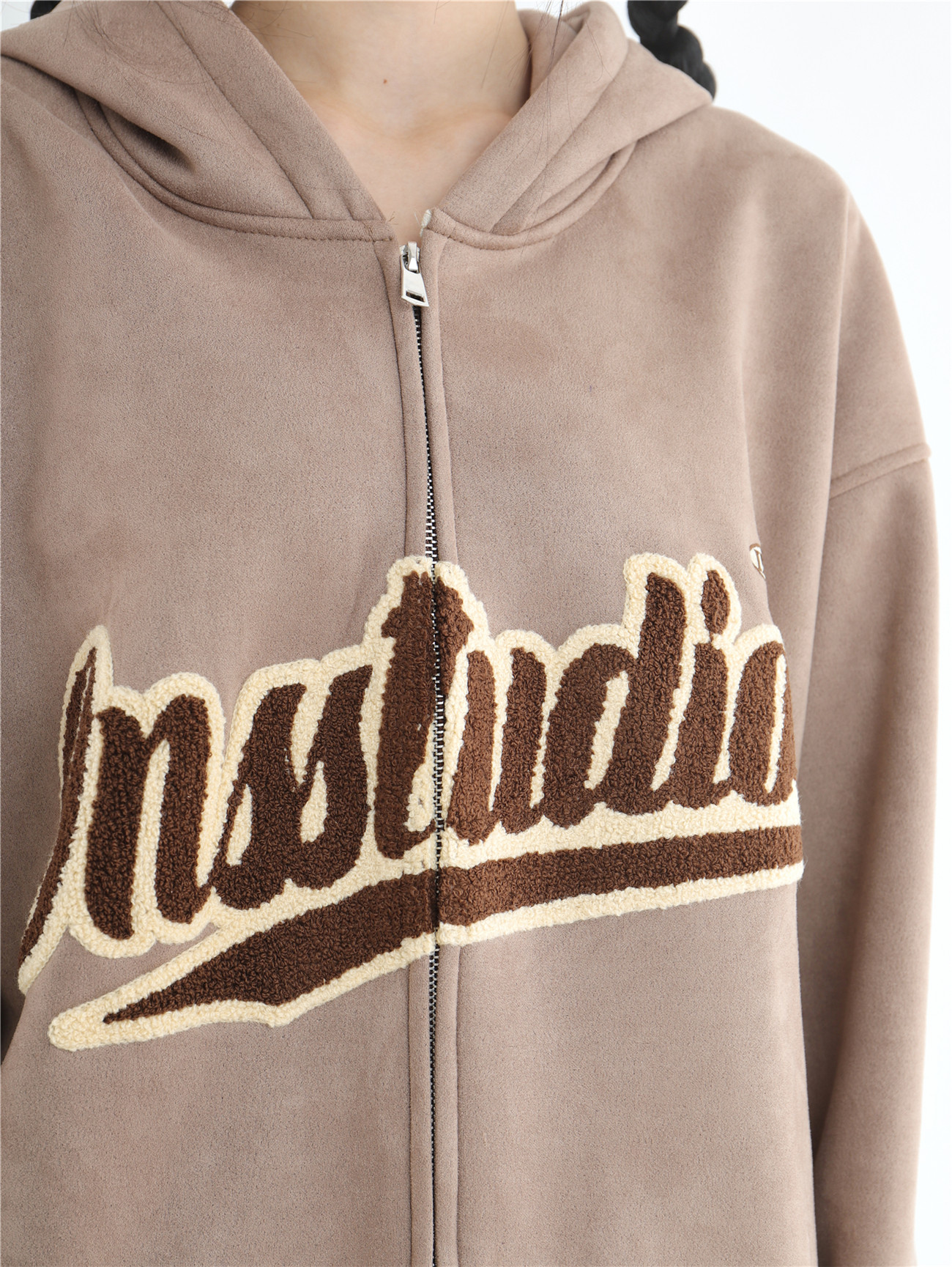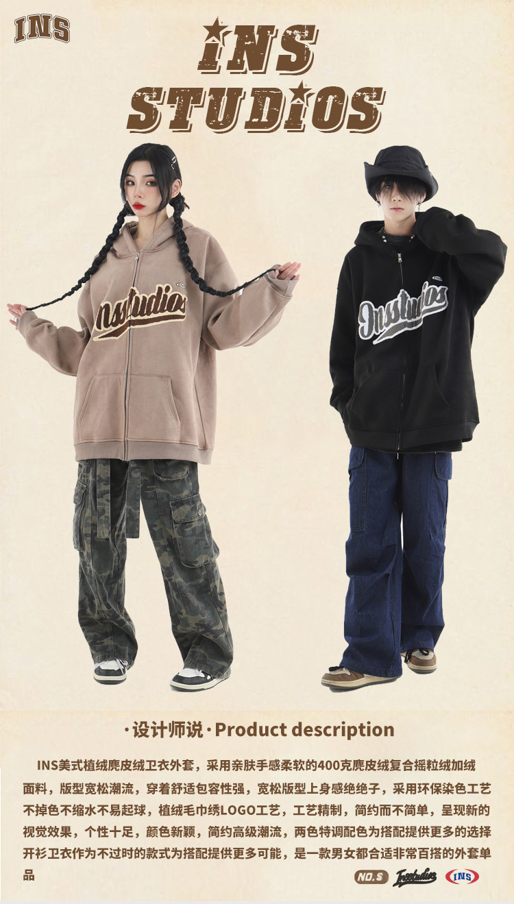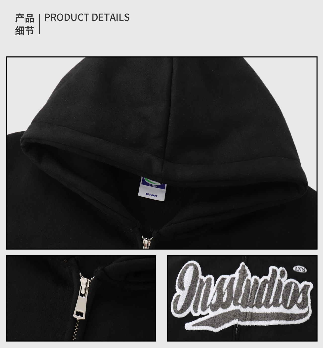 INSstudios 國潮情侶美式植絨毛巾繡LOGO麂皮絨衛衣加絨開衫外套