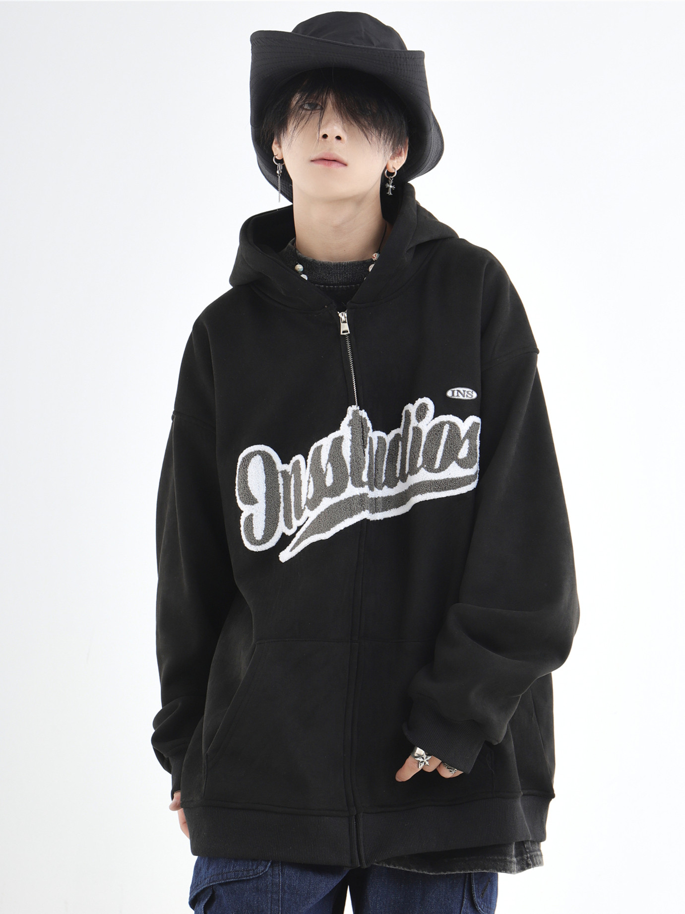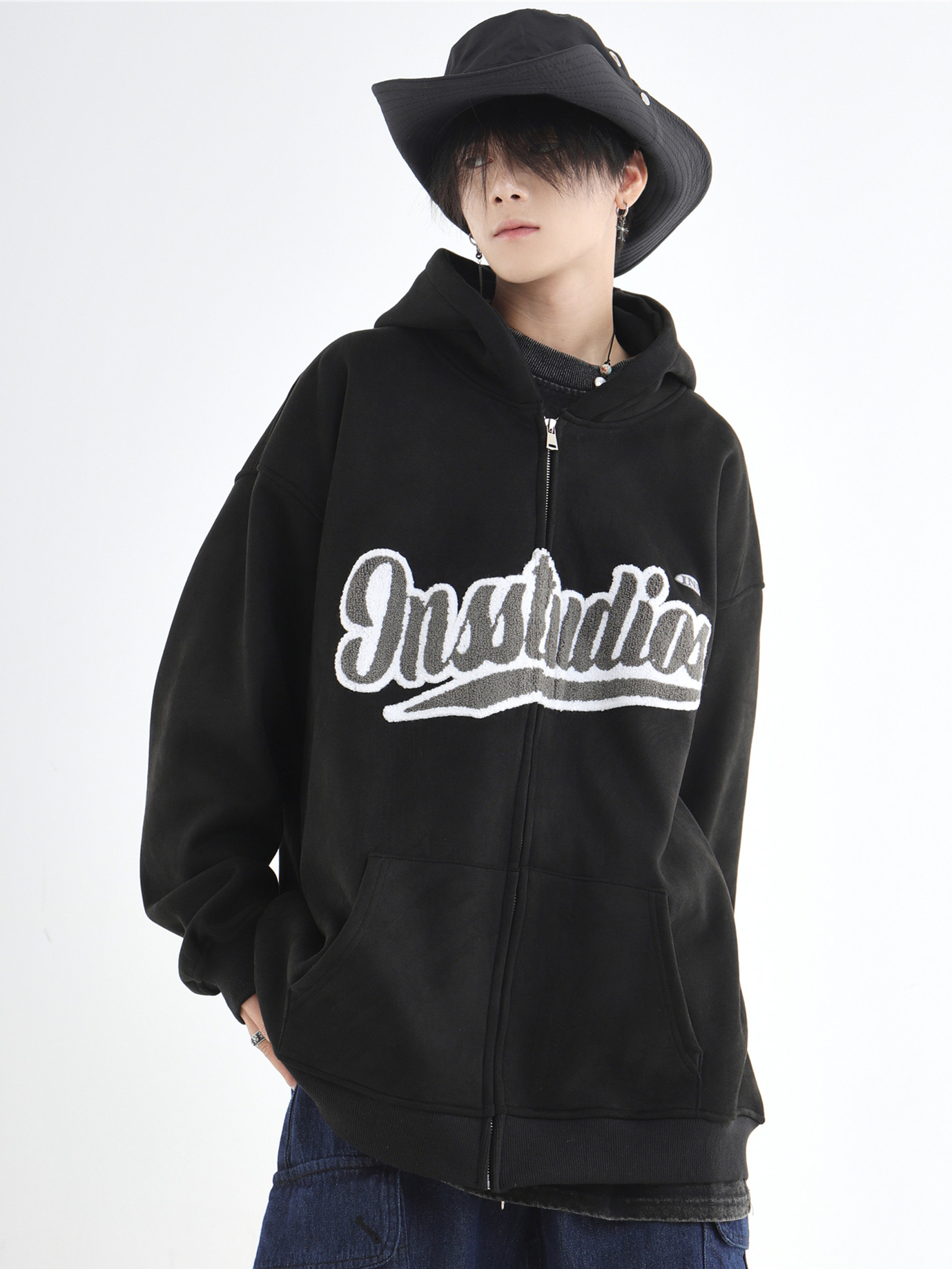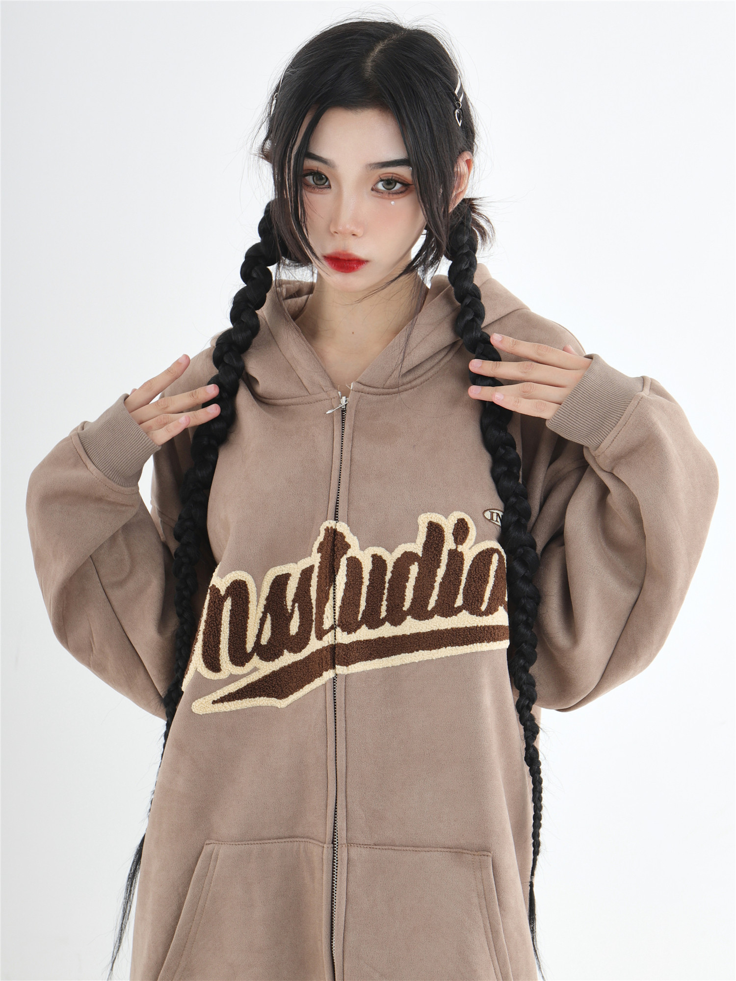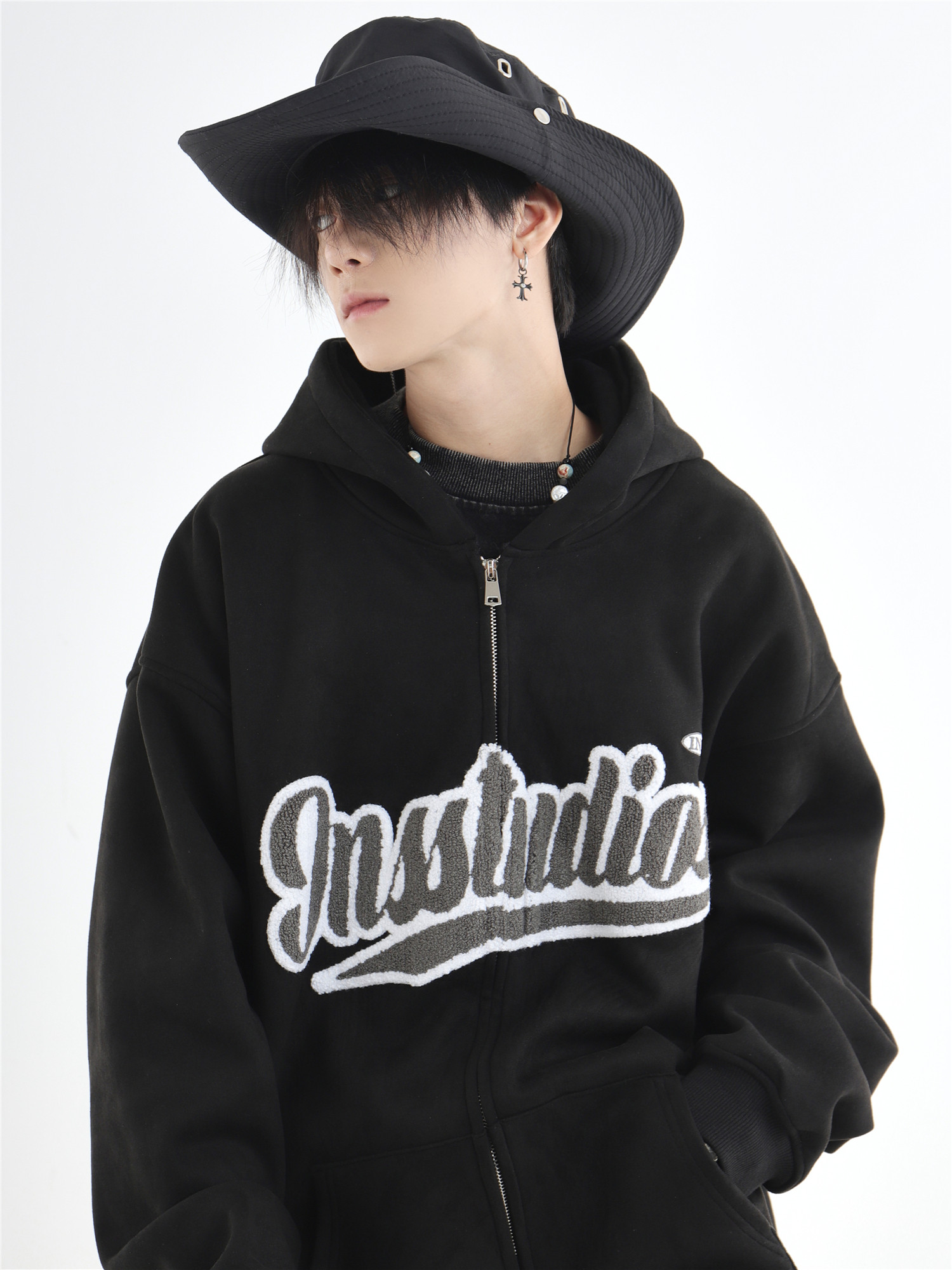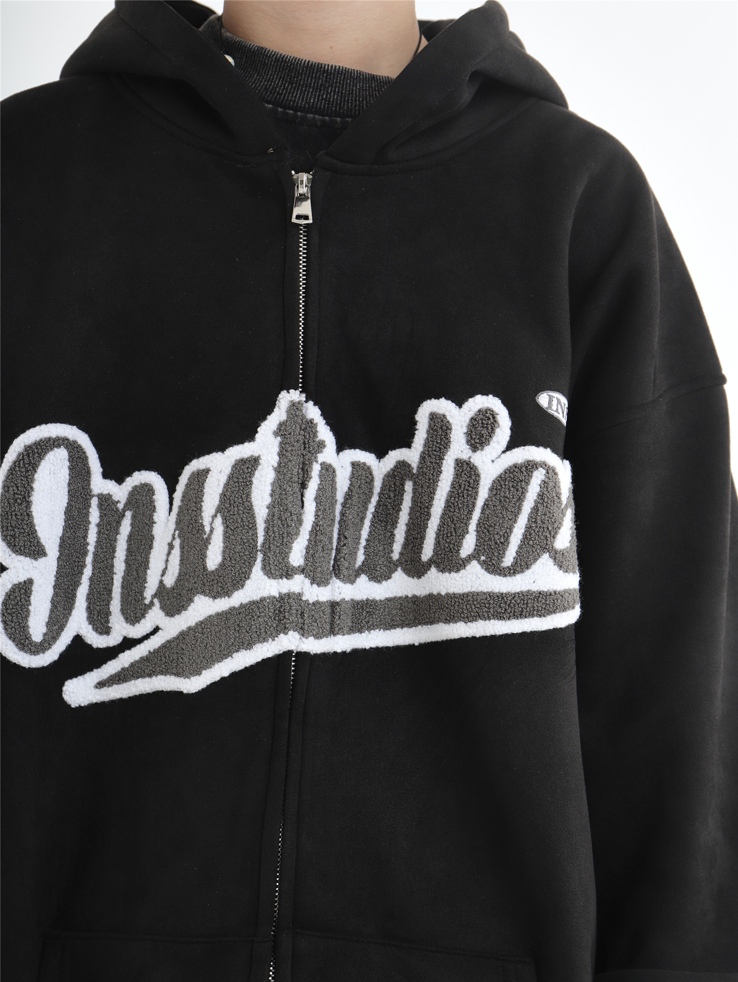 INSstudios 國潮情侶美式植絨毛巾繡LOGO麂皮絨衛衣加絨開衫外套