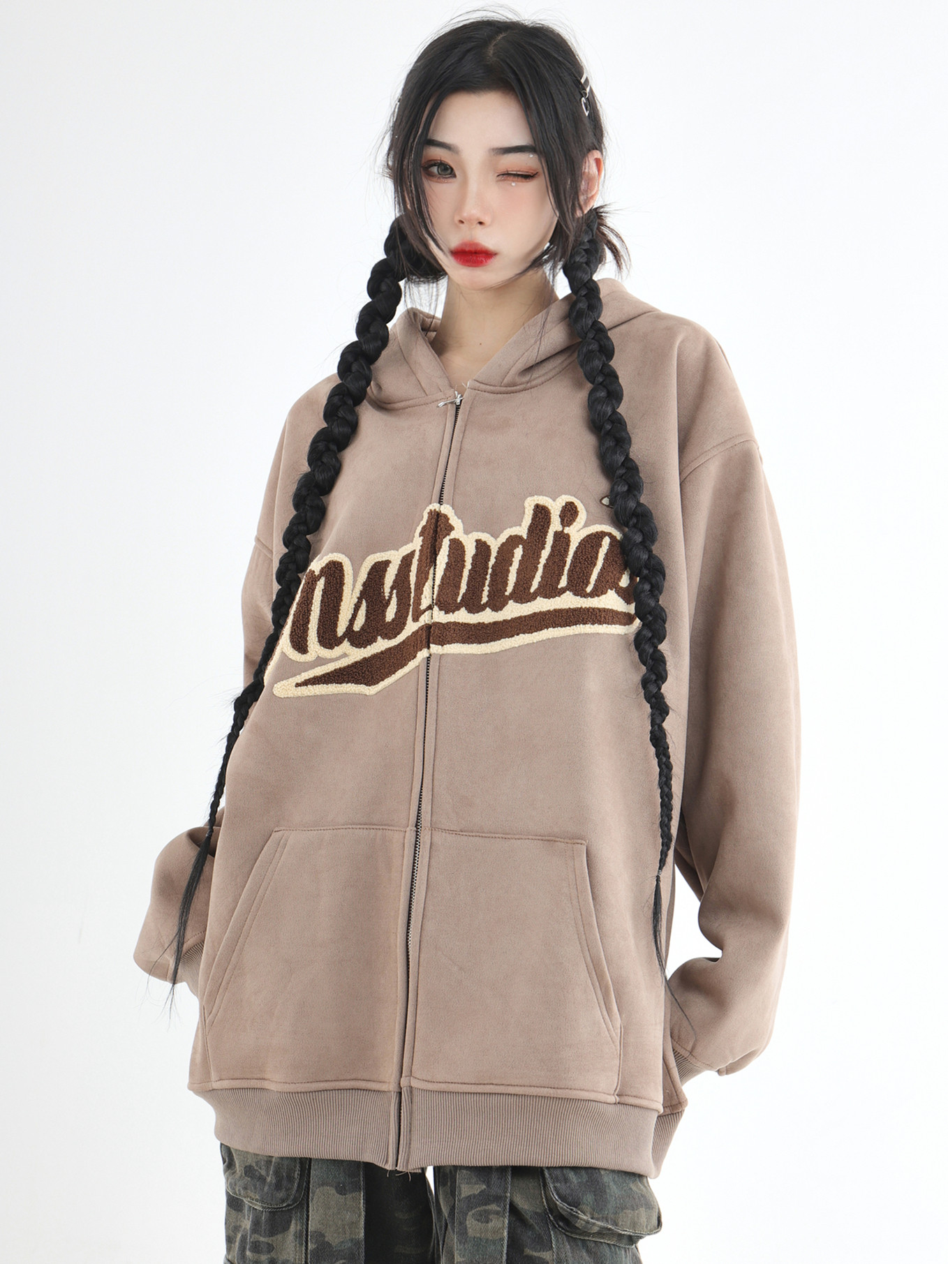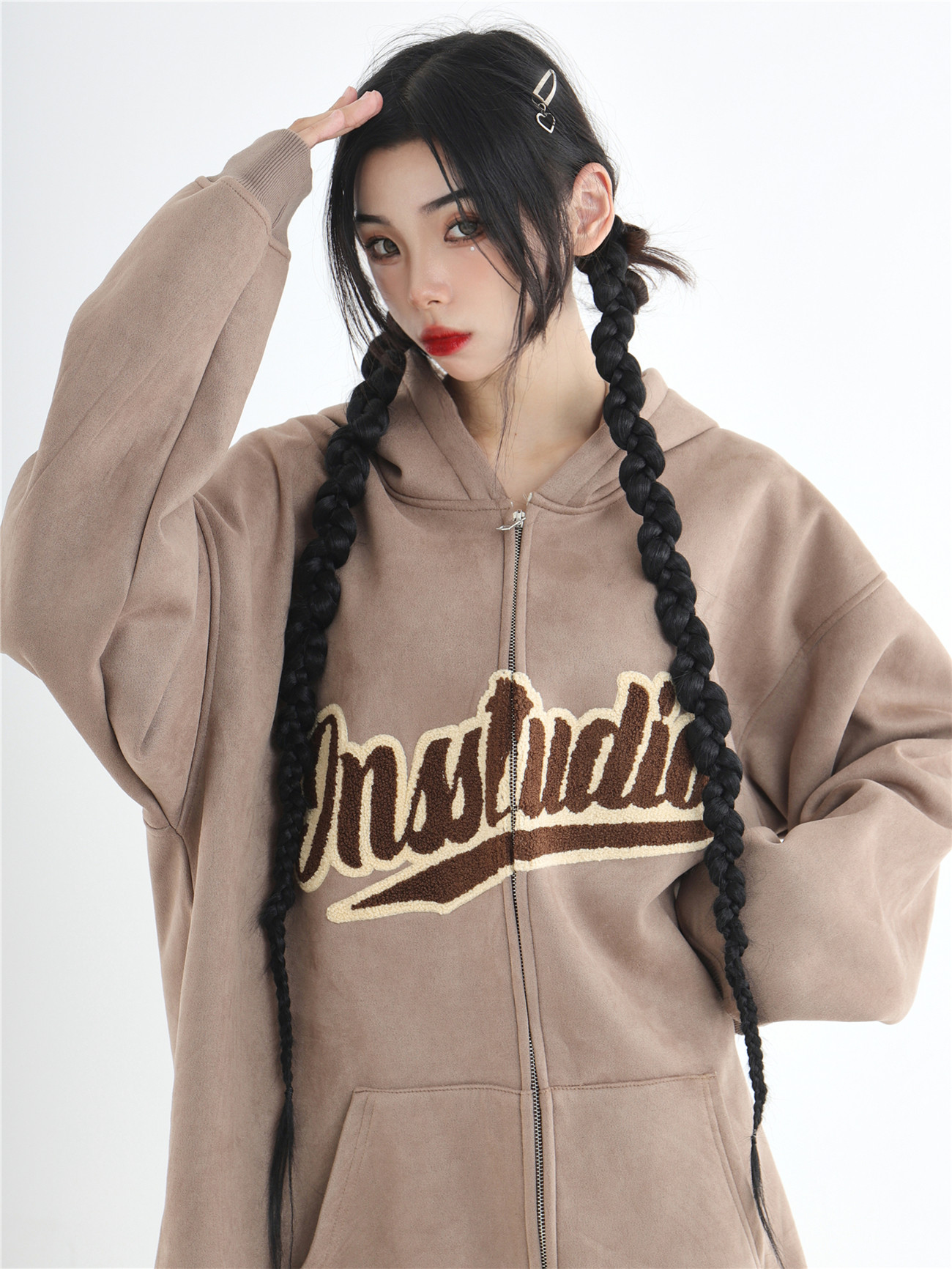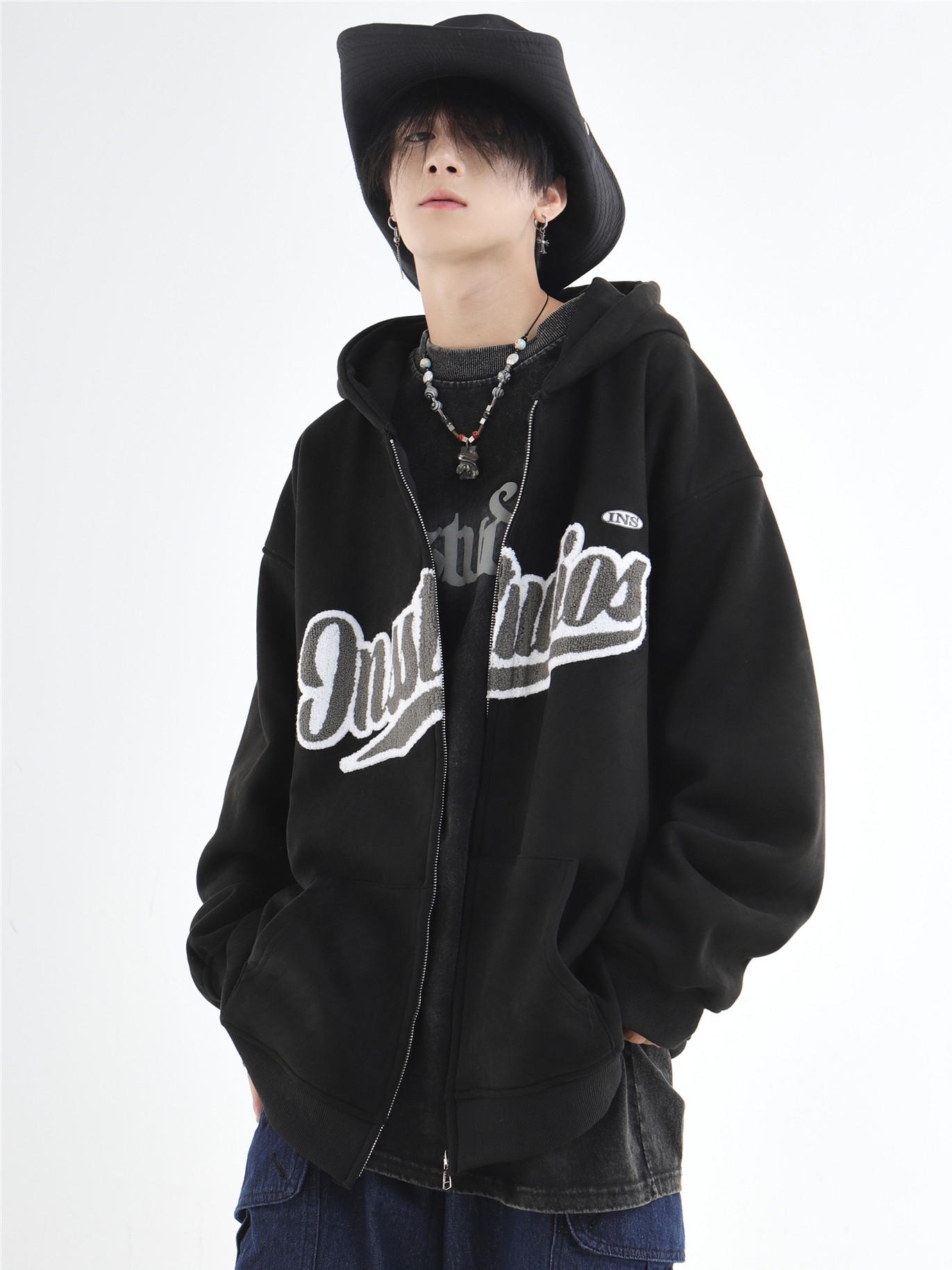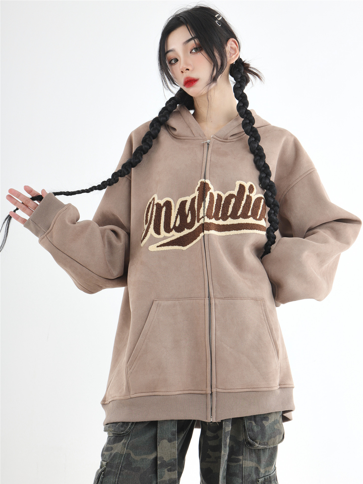INSstudios 國潮情侶美式植絨毛巾繡LOGO麂皮絨衛衣加絨開衫外套