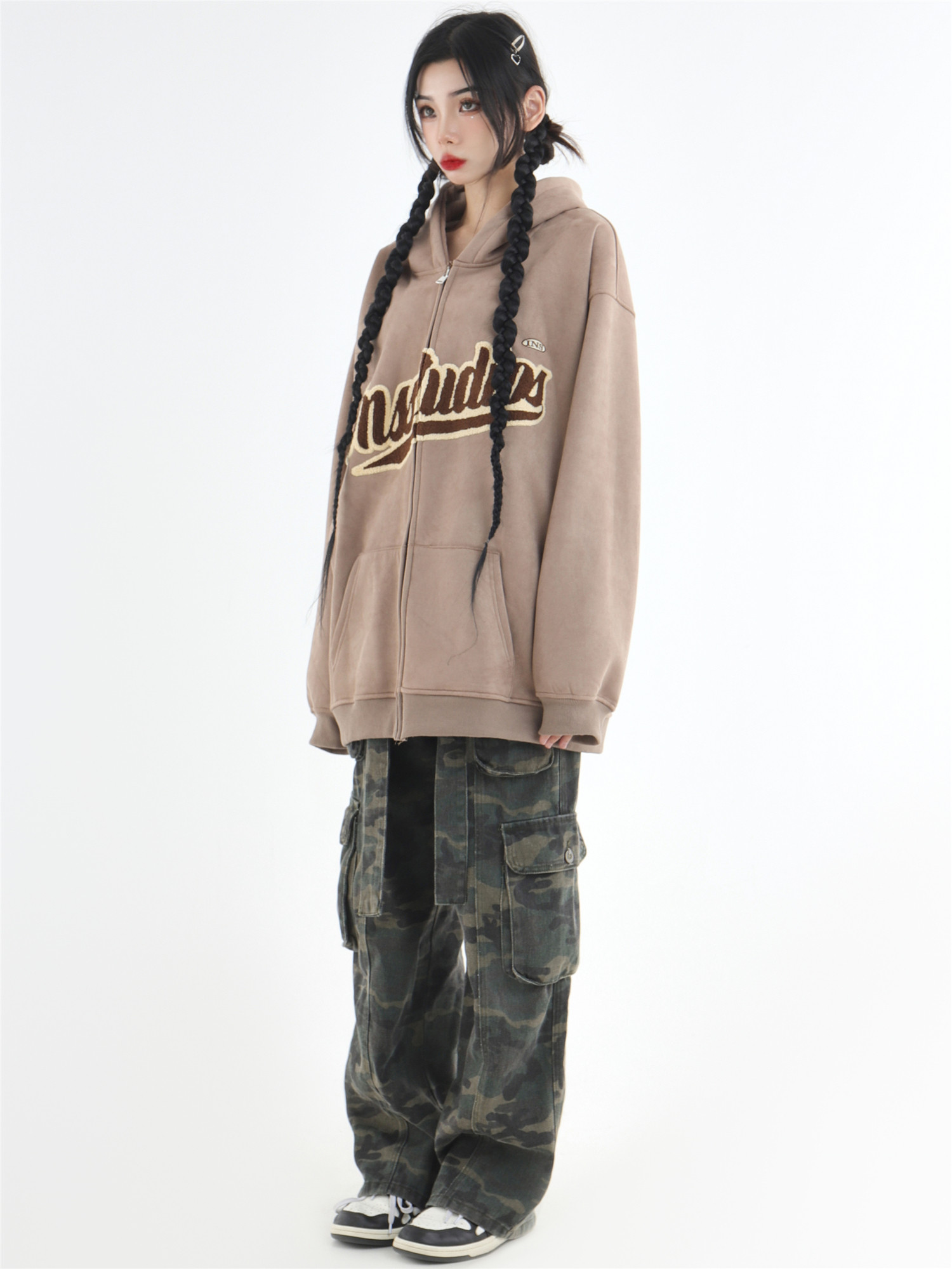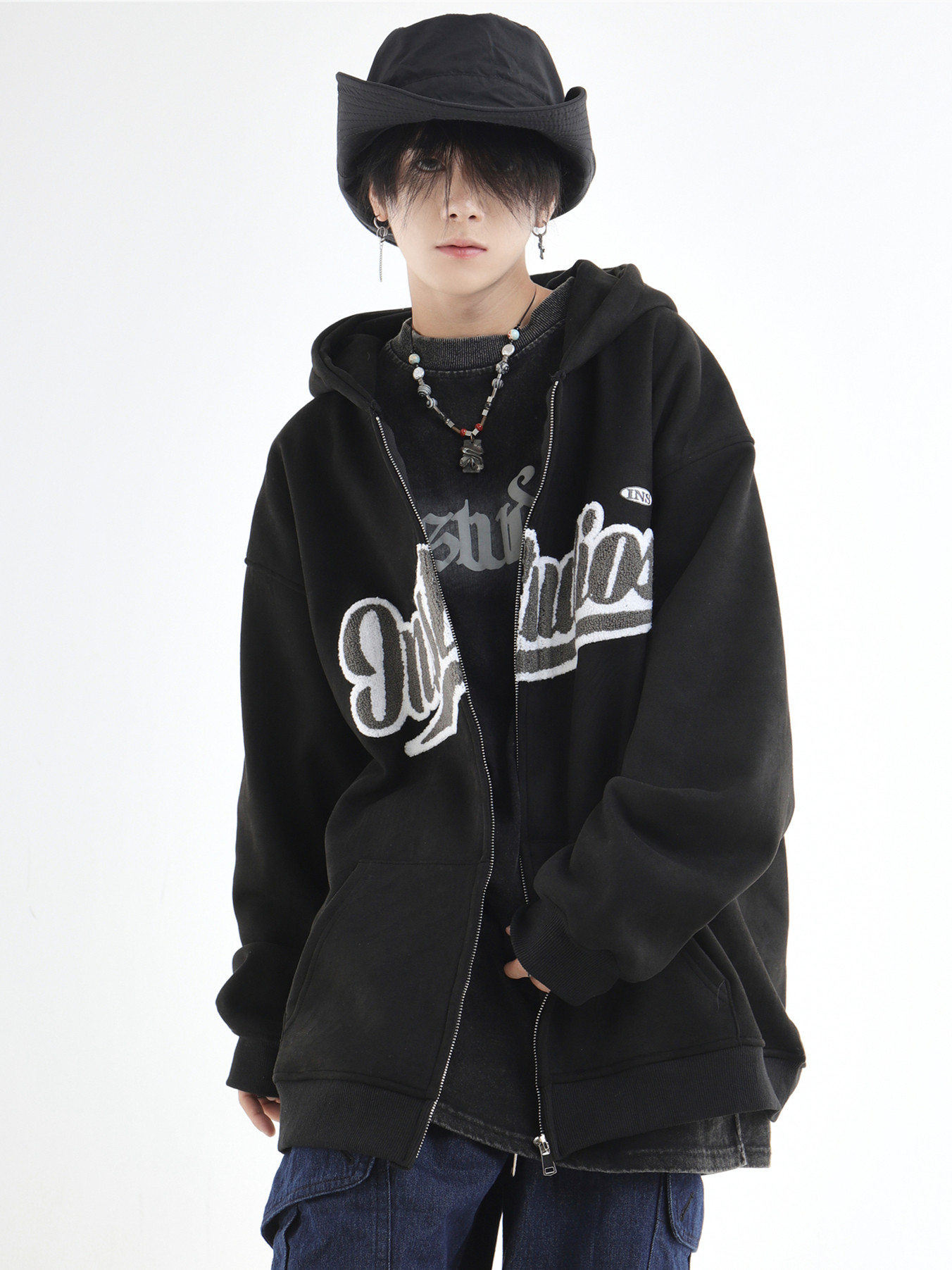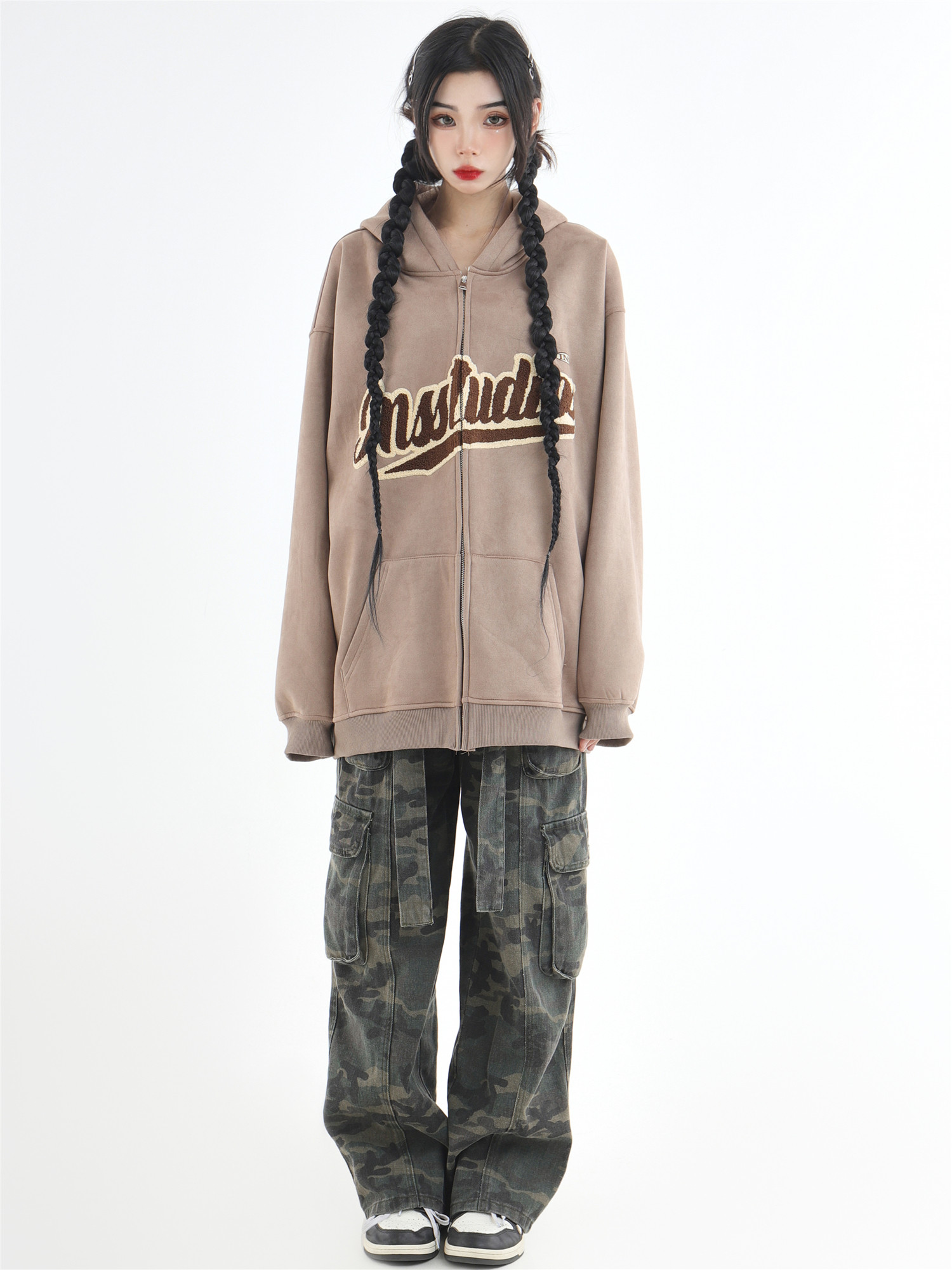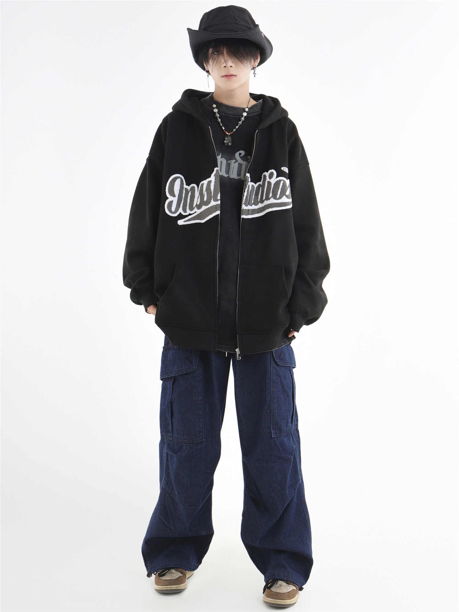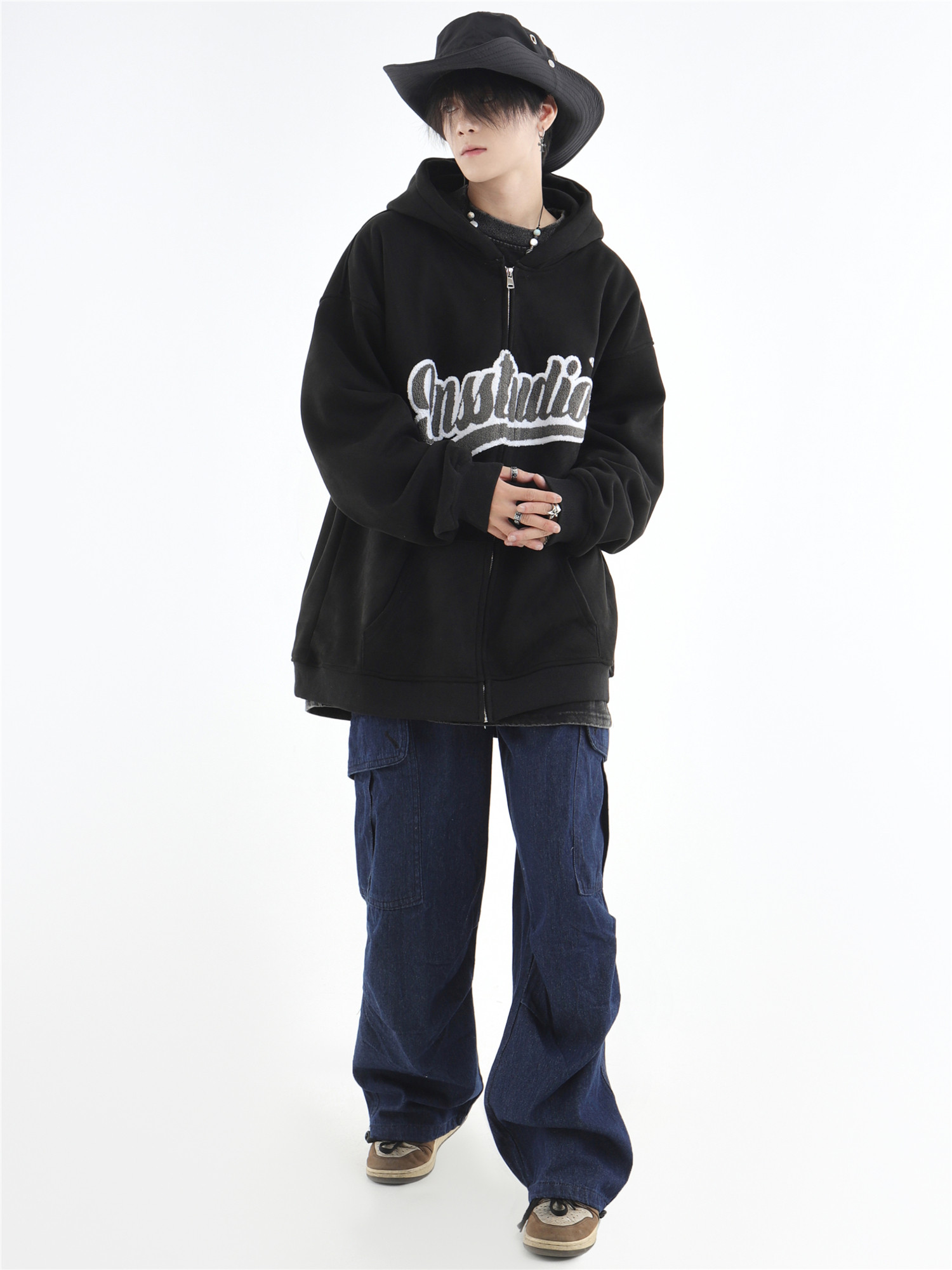 INSstudios 國潮情侶美式植絨毛巾繡LOGO麂皮絨衛衣加絨開衫外套