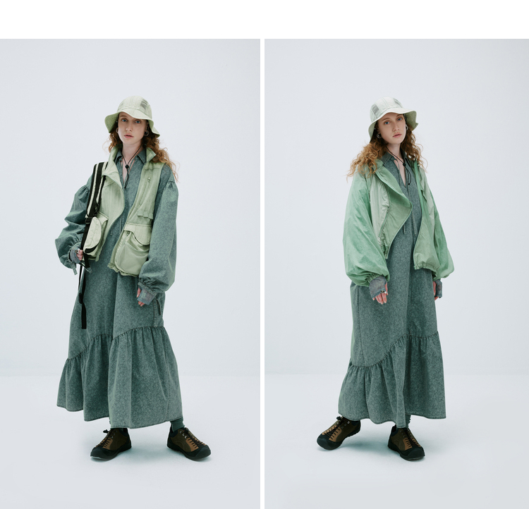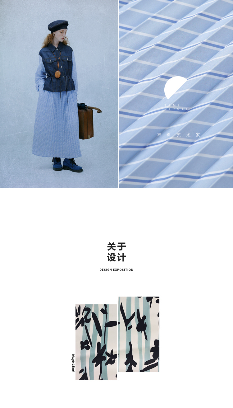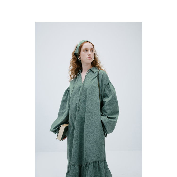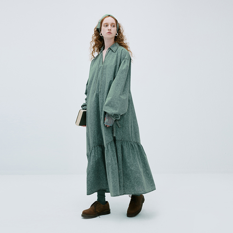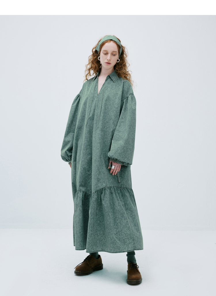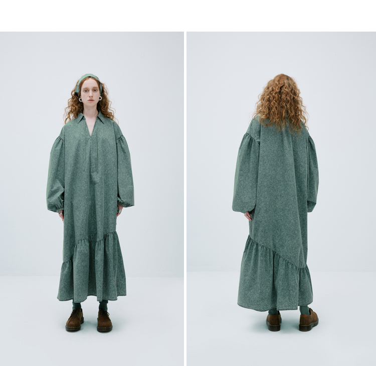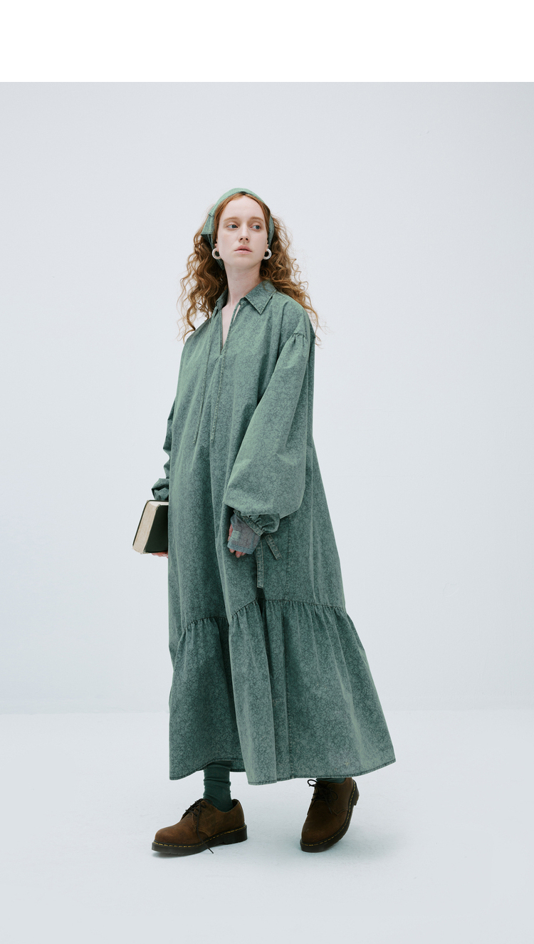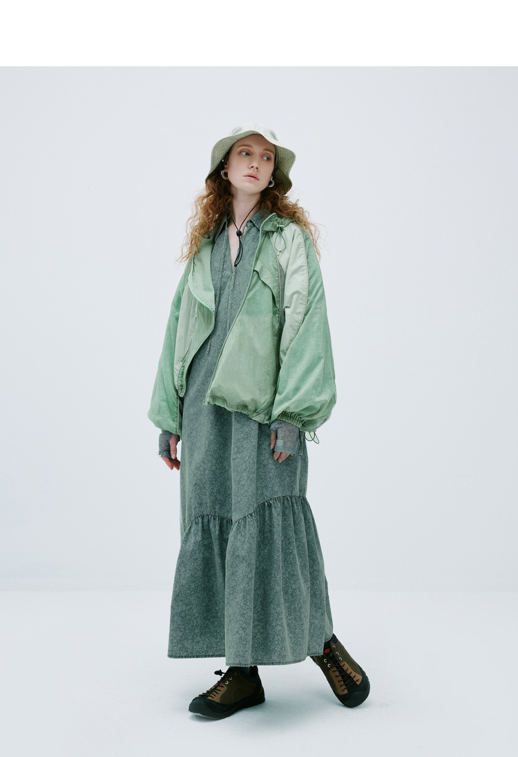 成衣水洗半圓原創設計2023春季新款印花洋裝軟糯親膚褶皺下擺