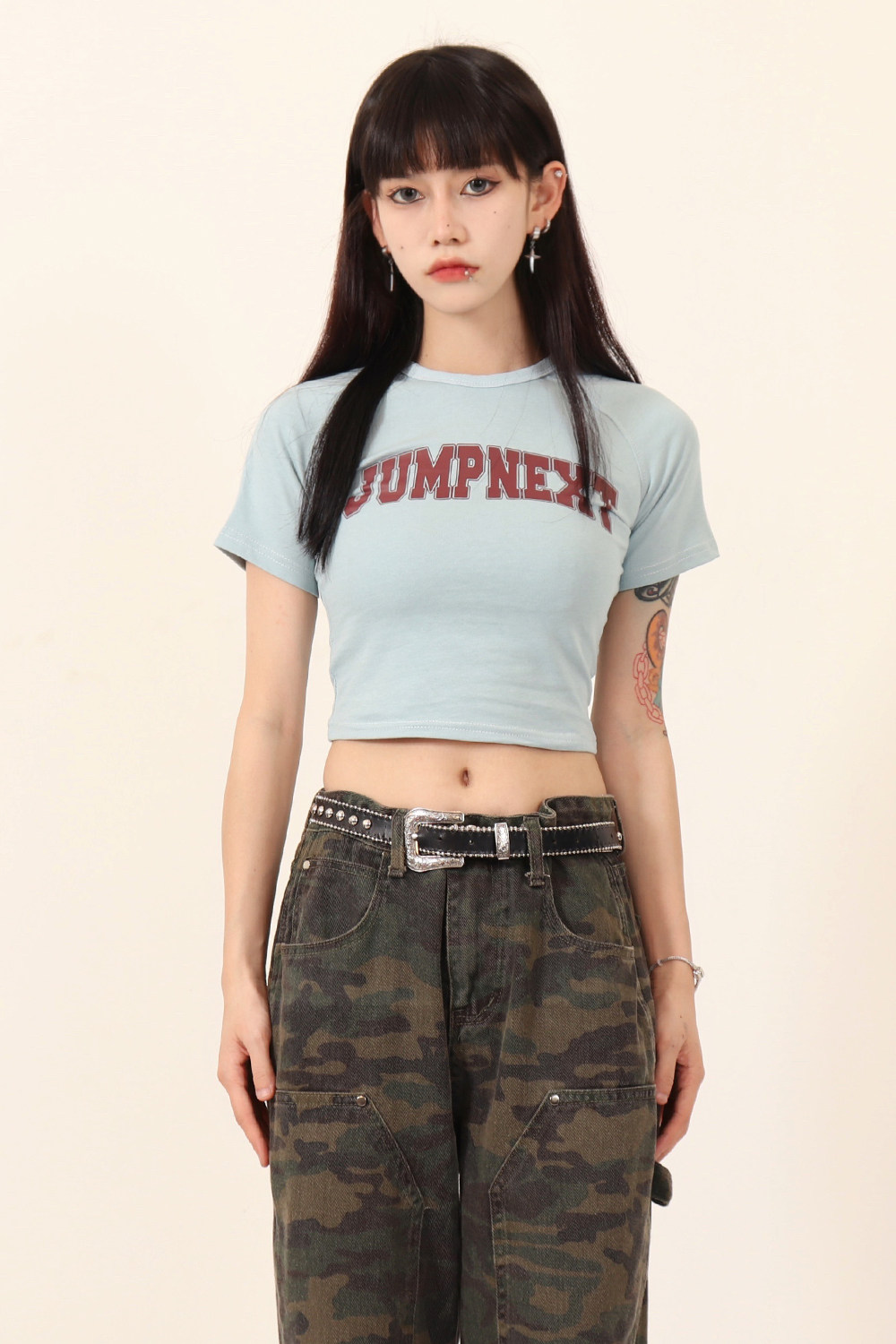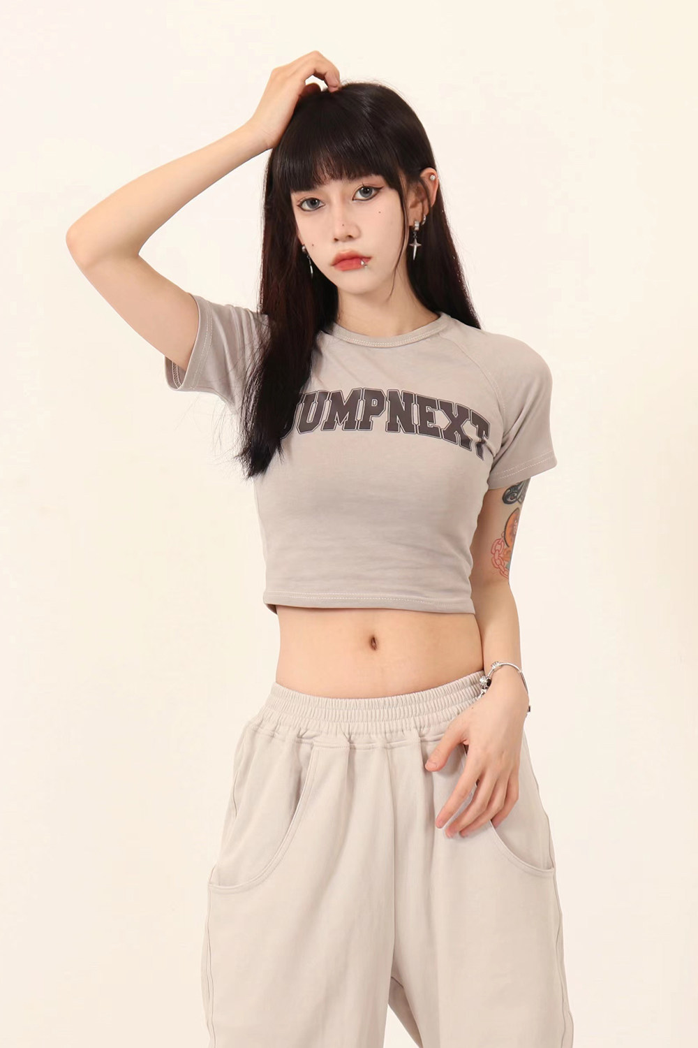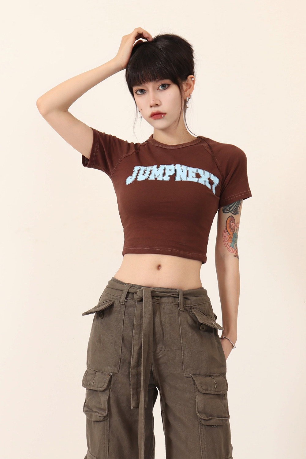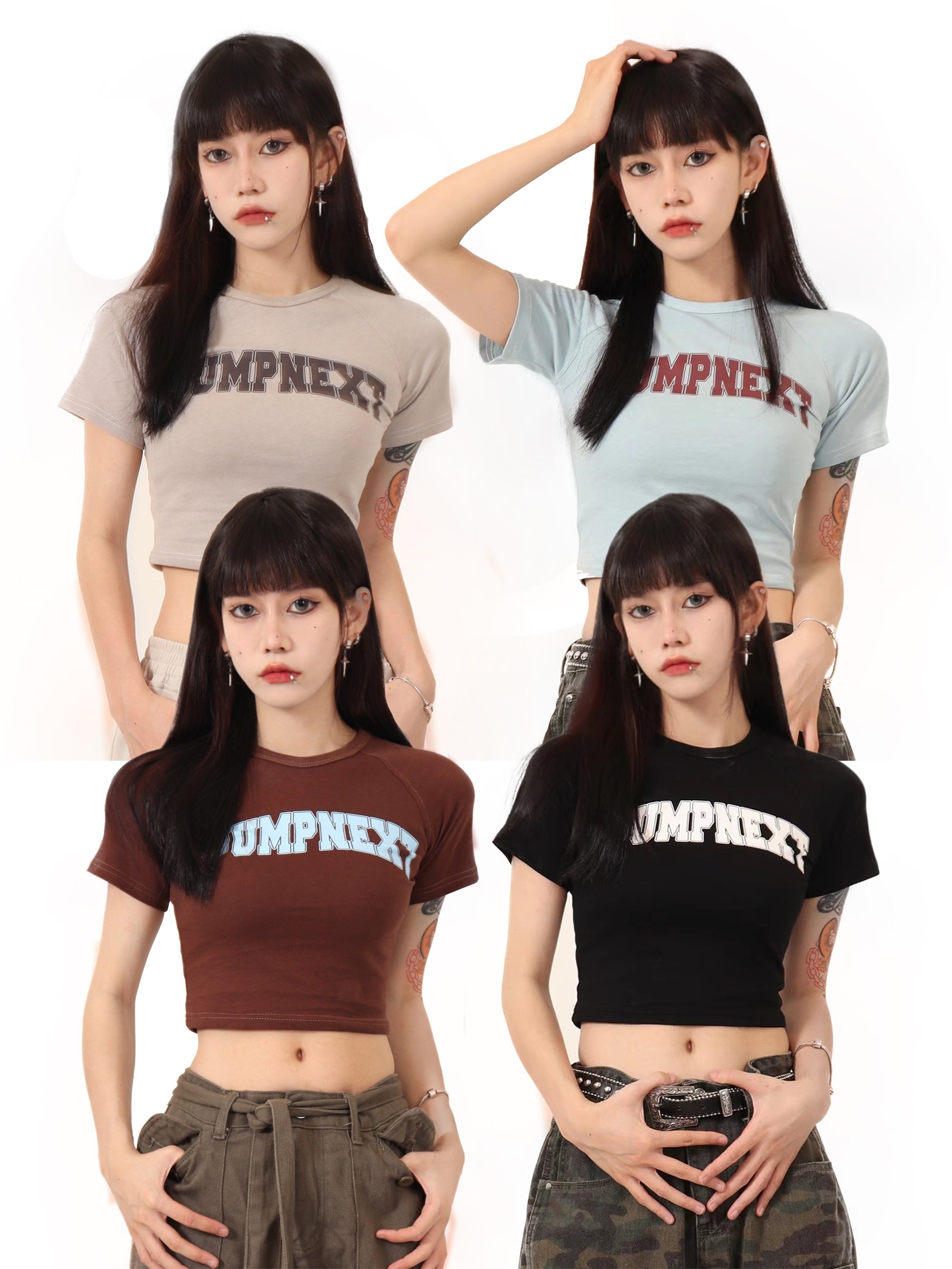 JUMPNEXT 設計感印花logo圓領短袖辣妹上衣露臍2022夏季短版t恤女