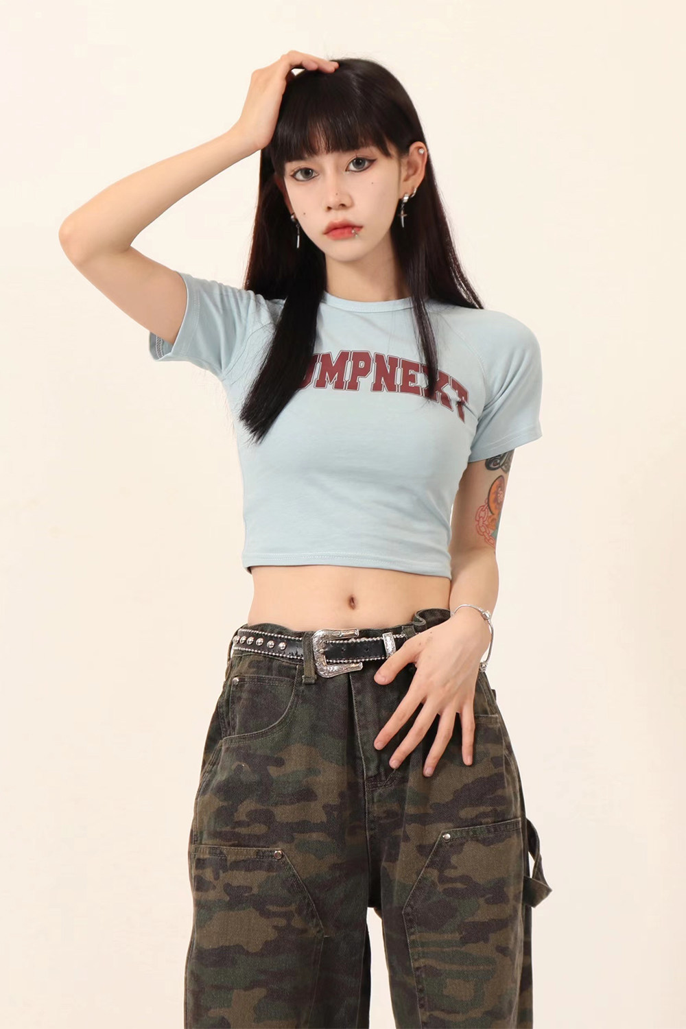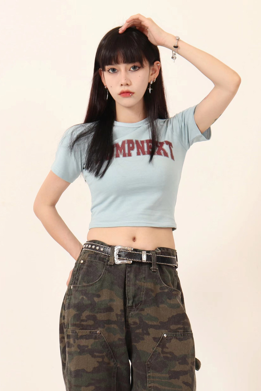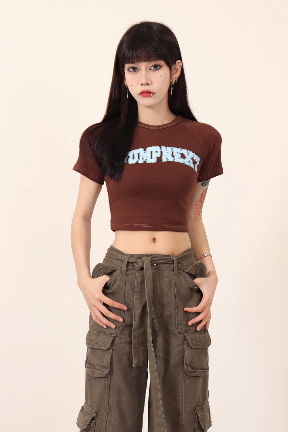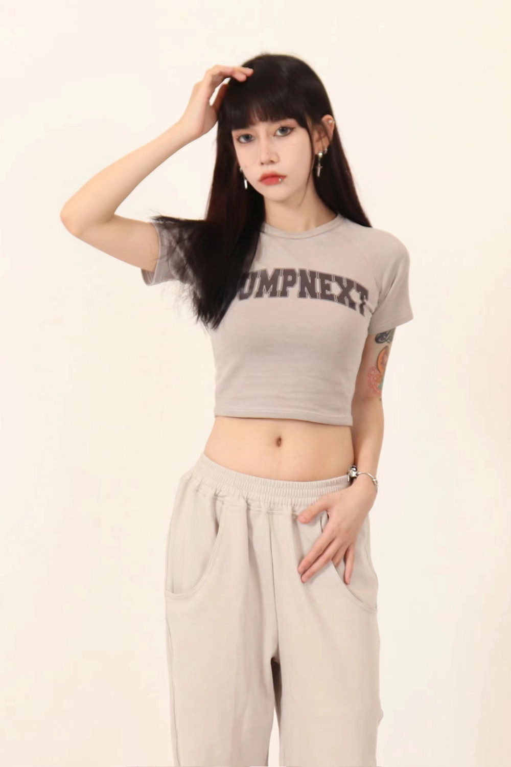 JUMPNEXT 設計感印花logo圓領短袖辣妹上衣露臍2022夏季短版t恤女