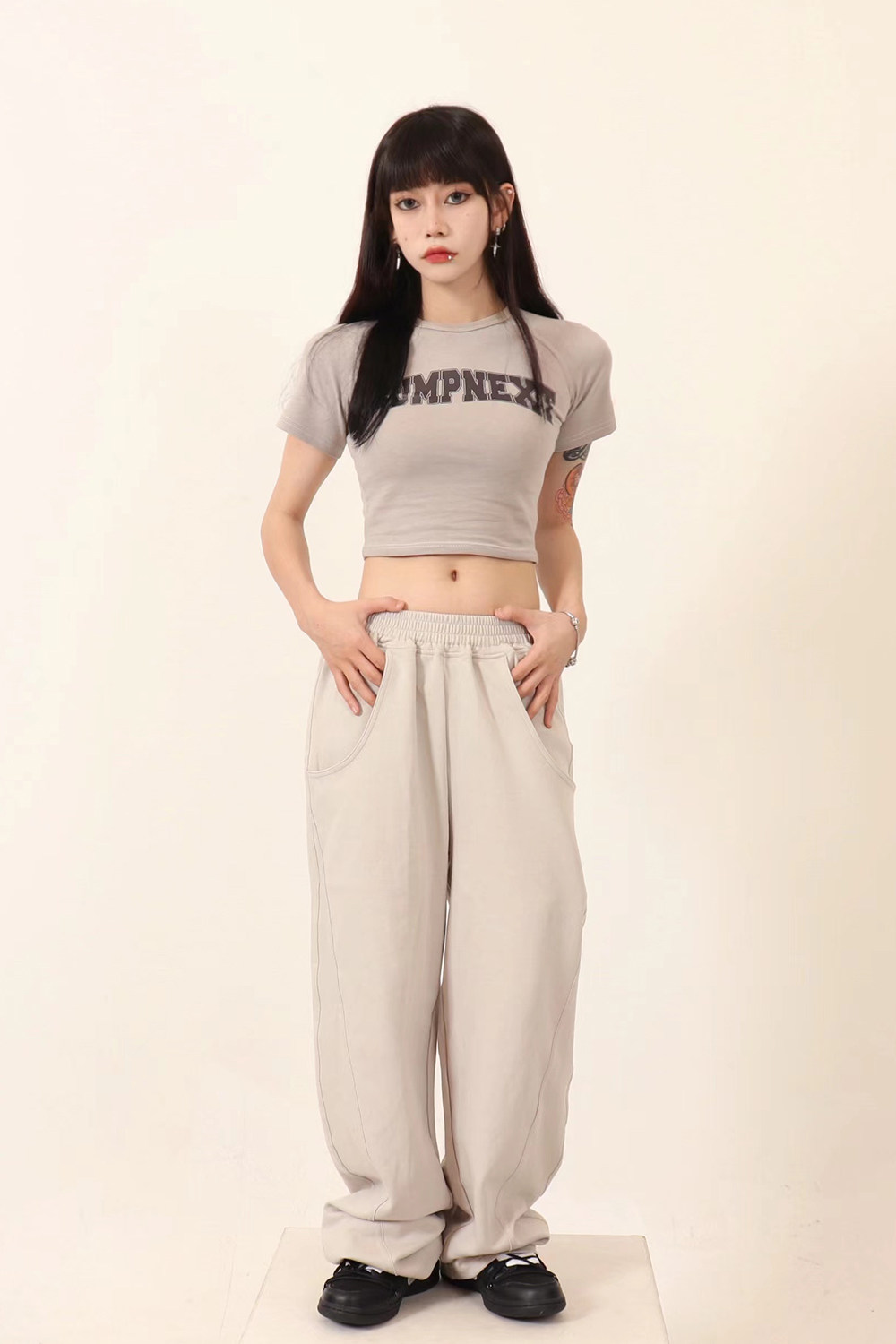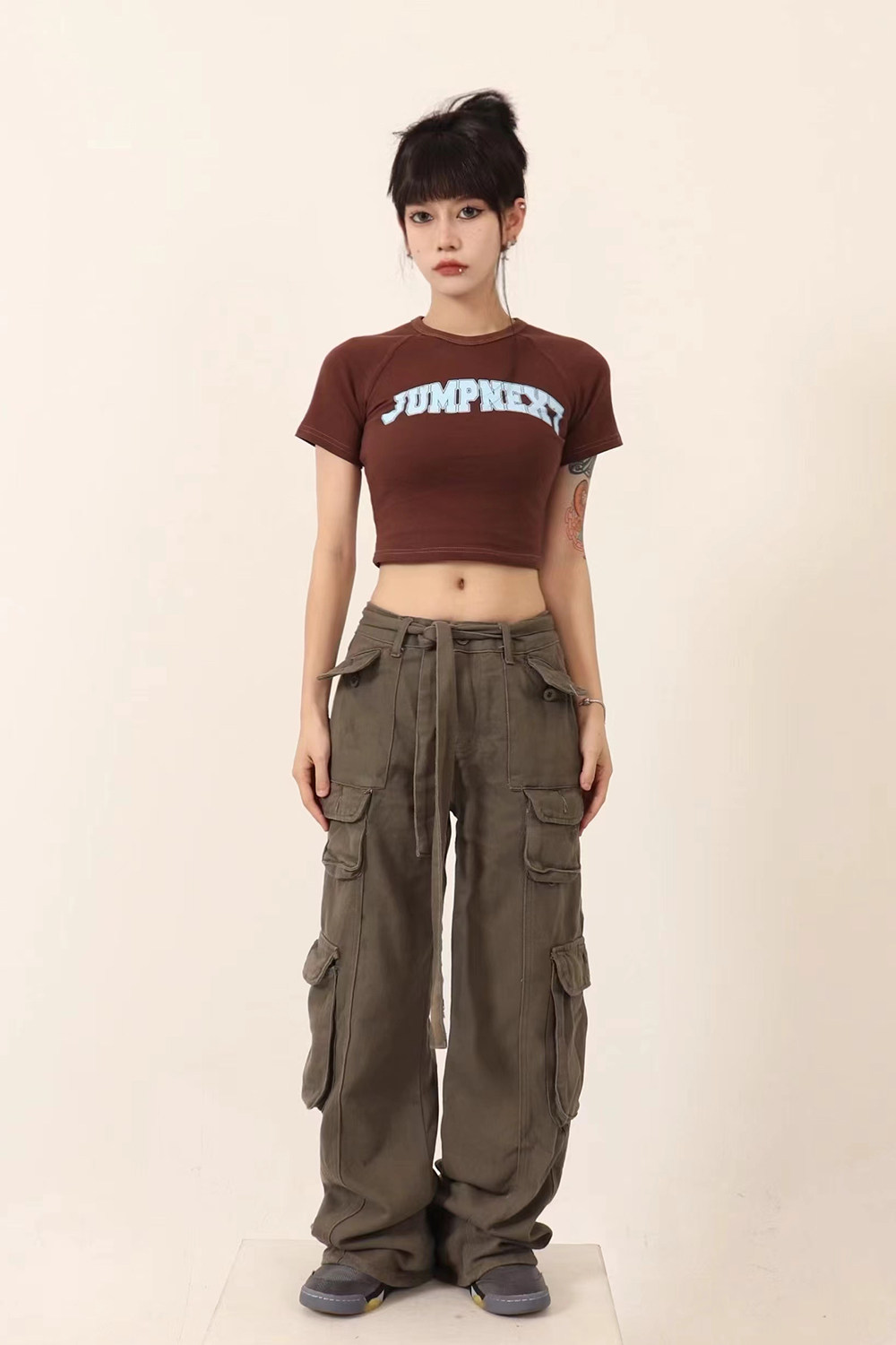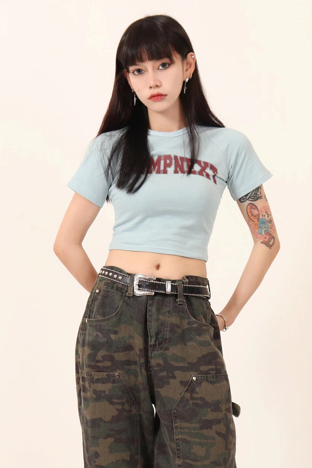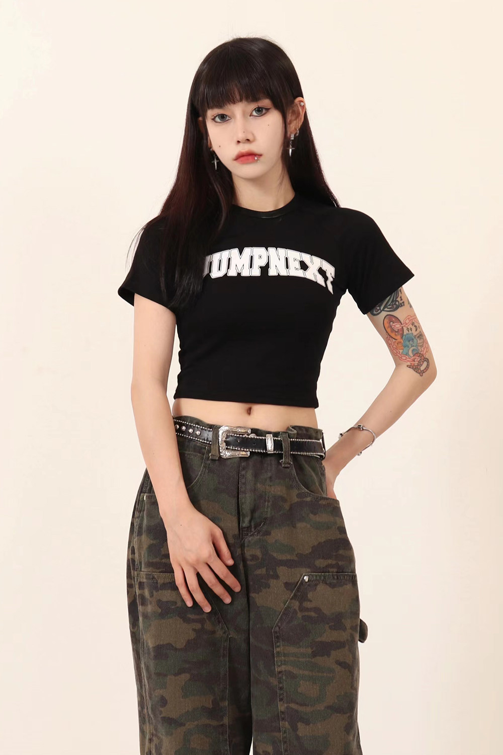 JUMPNEXT 設計感印花logo圓領短袖辣妹上衣露臍2022夏季短版t恤女