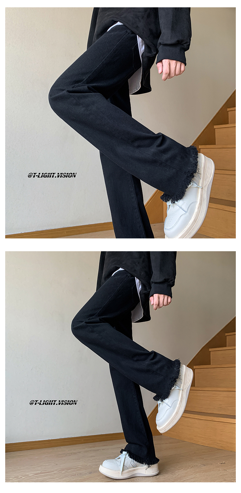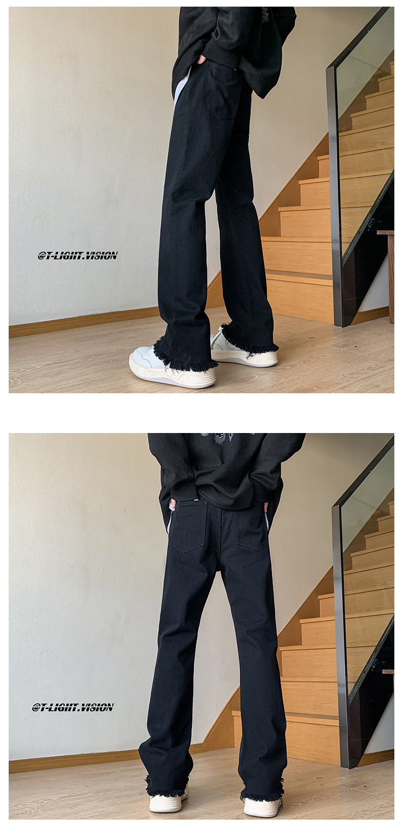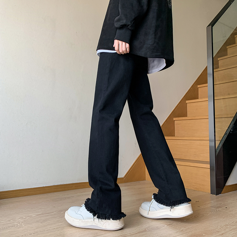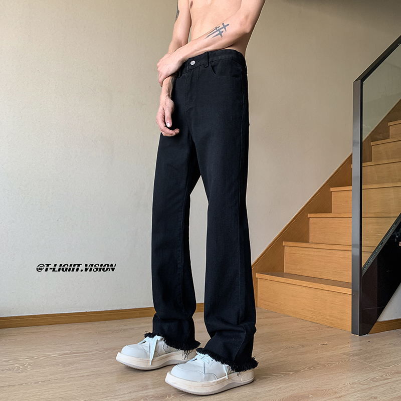 歐美hiphop褲子設計感純黑色毛邊牛仔褲美式高街vibe修身微喇叭褲潮