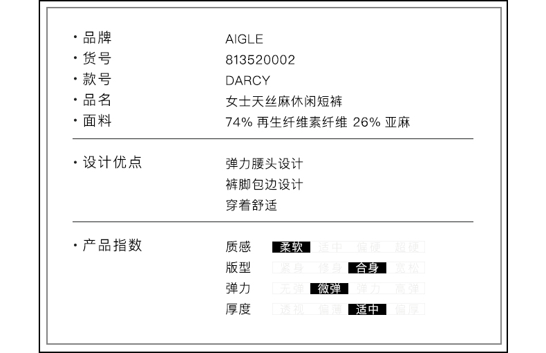 AIGLE艾高夏款女士柔軟天絲輕薄時尚舒適戶外休閒經典短褲褲裝