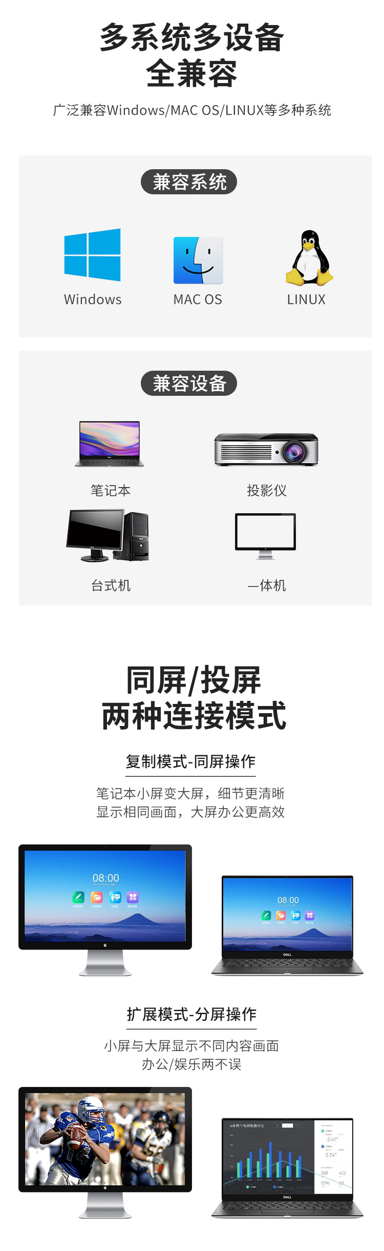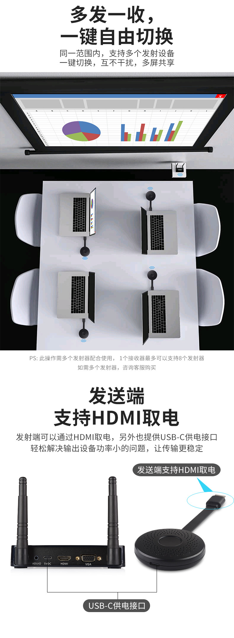 可以支持手机,电脑,平板,高清展台,摄像机等信号源设备无线传输HDMI高清视频到电视机,投影机等显示设备;可以支持8发1收,可以支持50米无线传输,免除工程布线的烦恼。可以出中性机,支持OEM