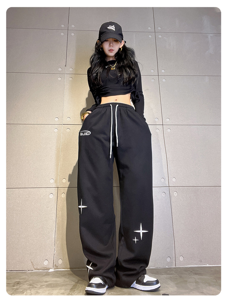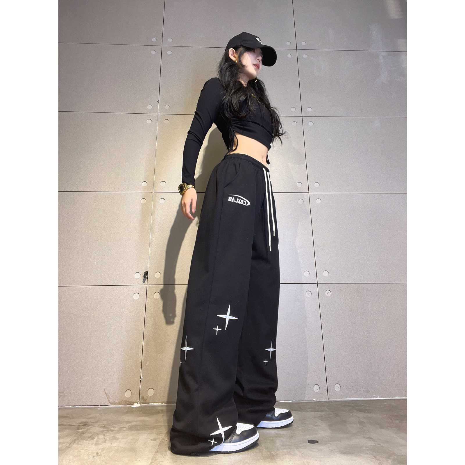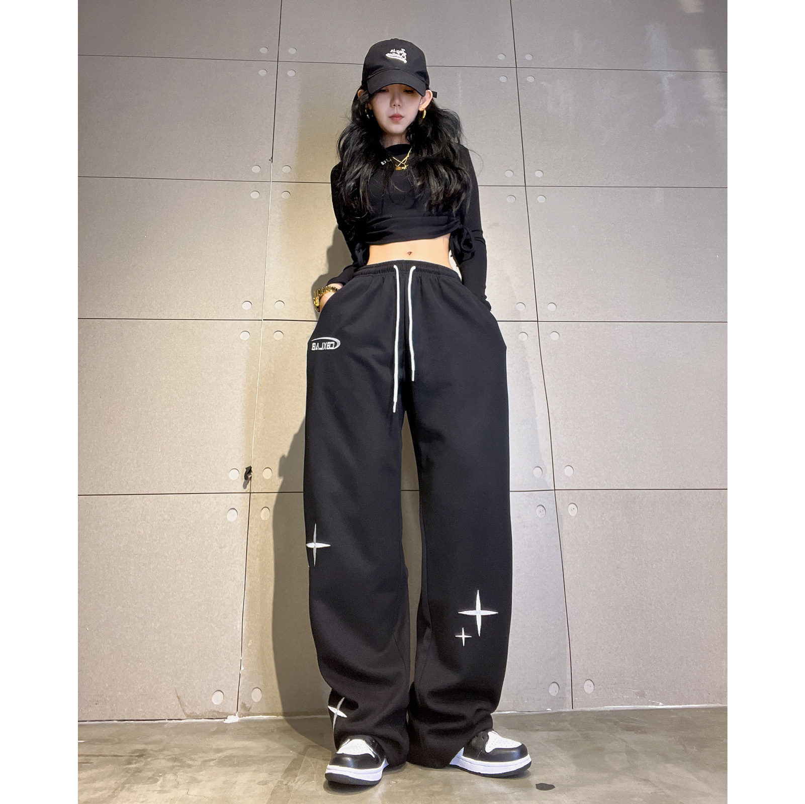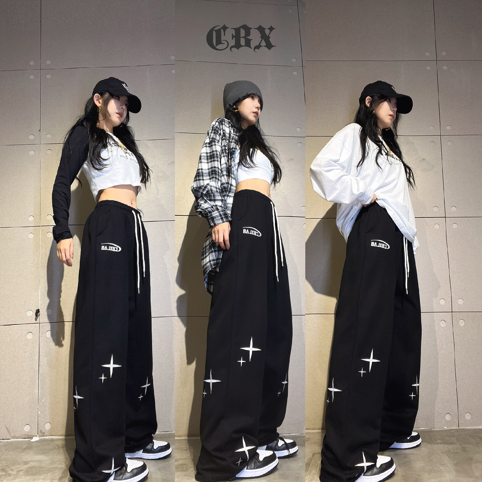 CBX原創潮牌黑色刺繡嘻哈直筒運動褲女jazz街舞ins跳舞爵士褲子潮