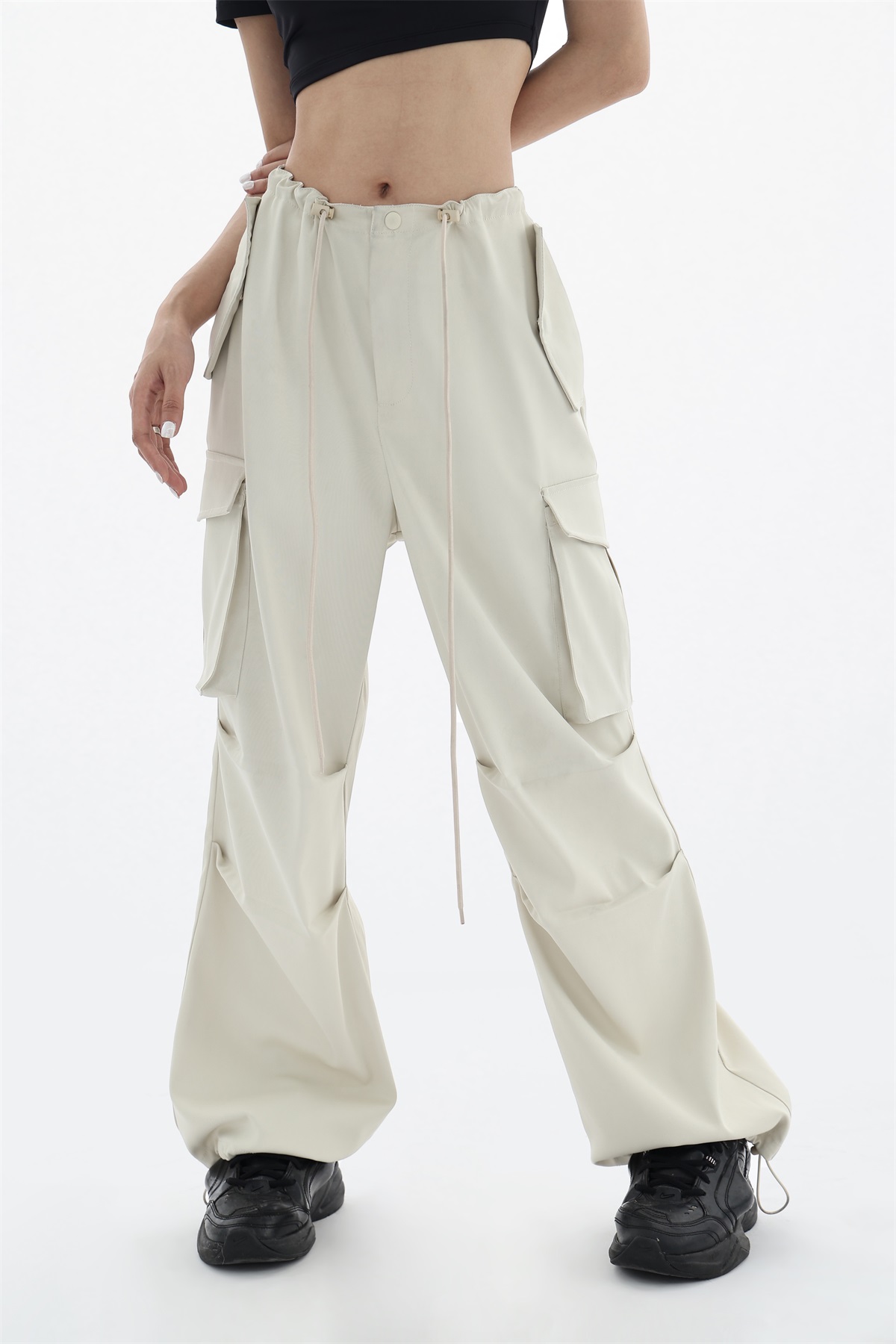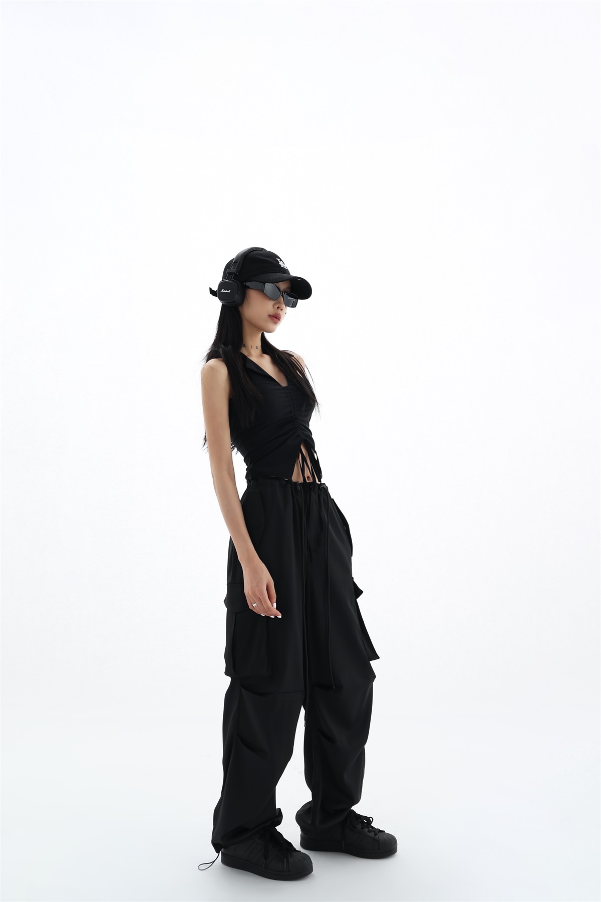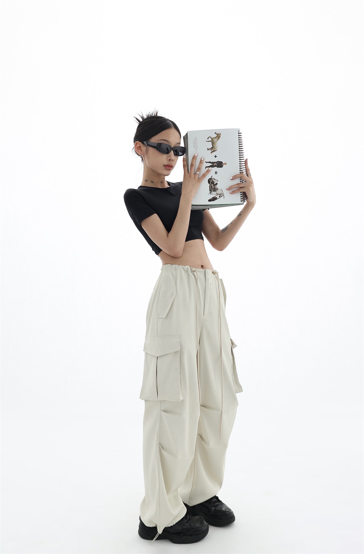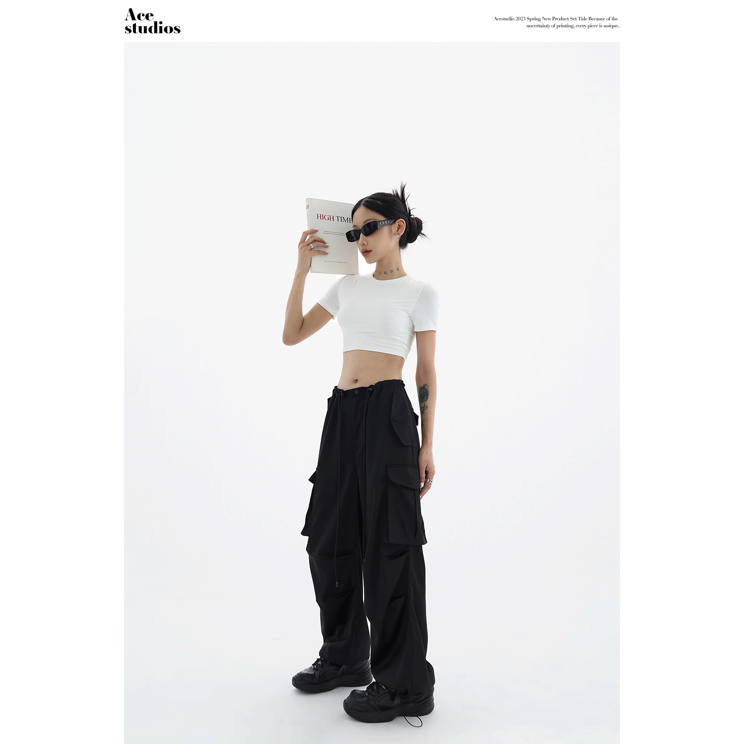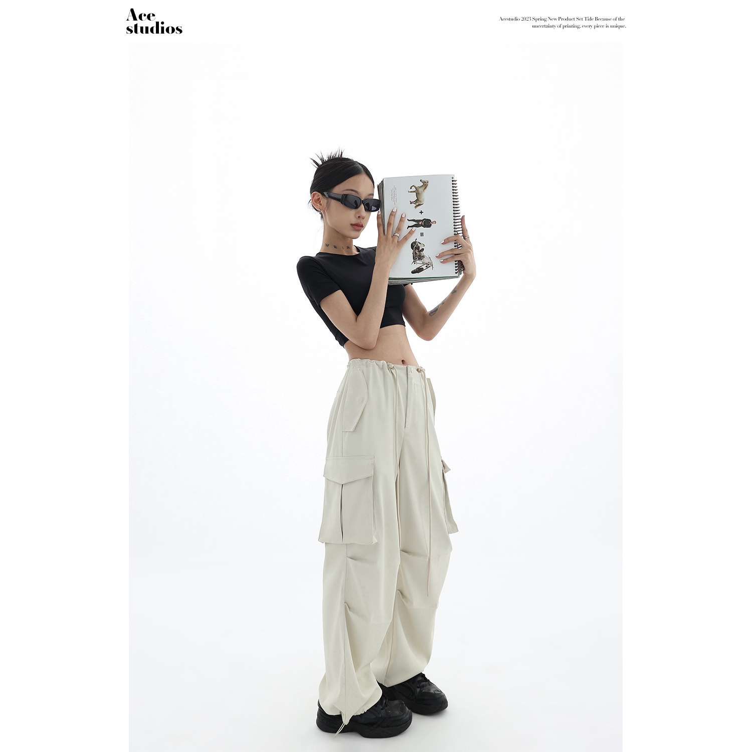 Acestudios 抽繩闊腿工裝褲女2023春夏高街寬鬆薄款垂感低腰長褲