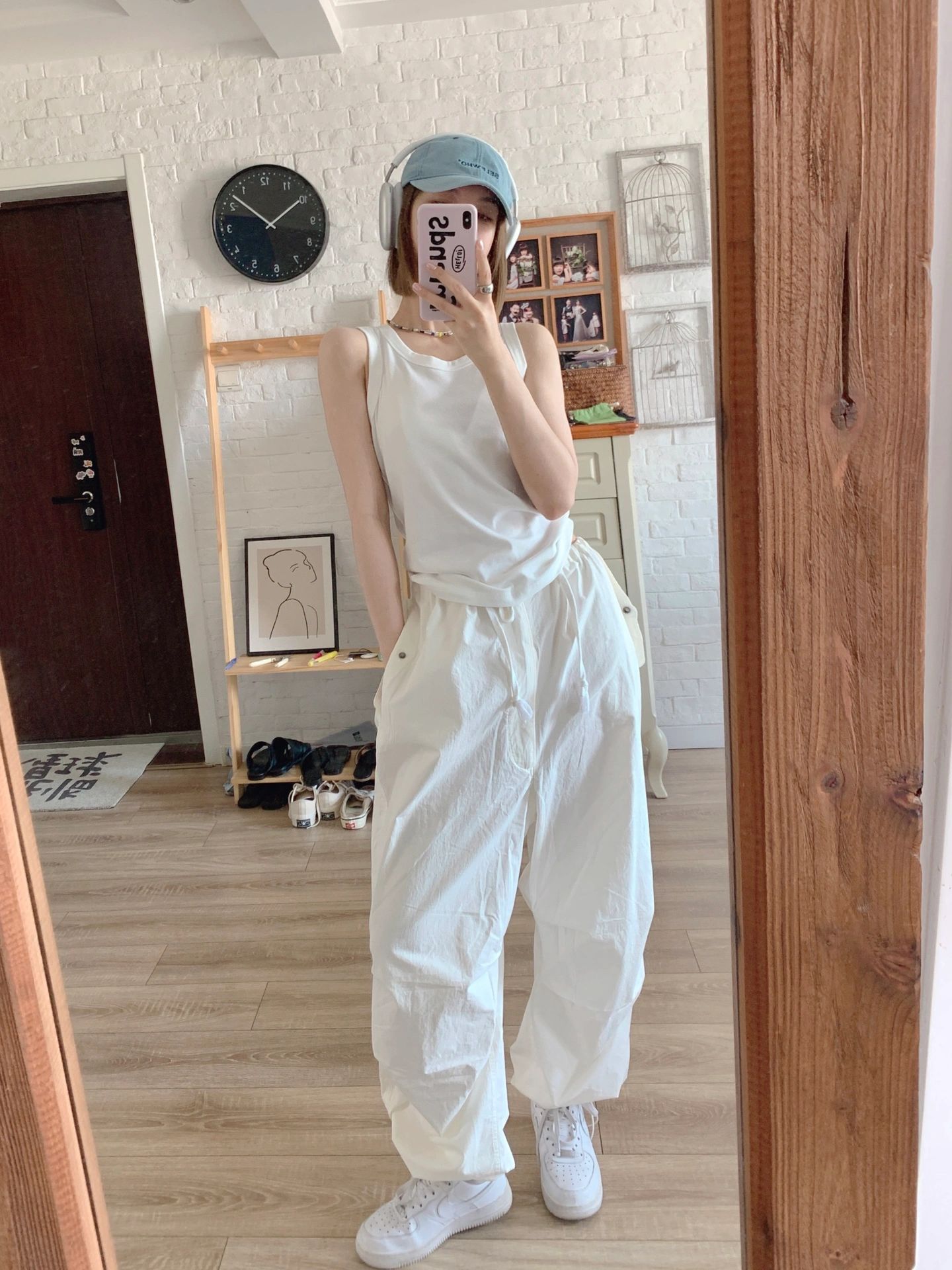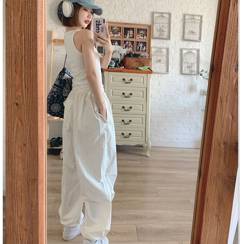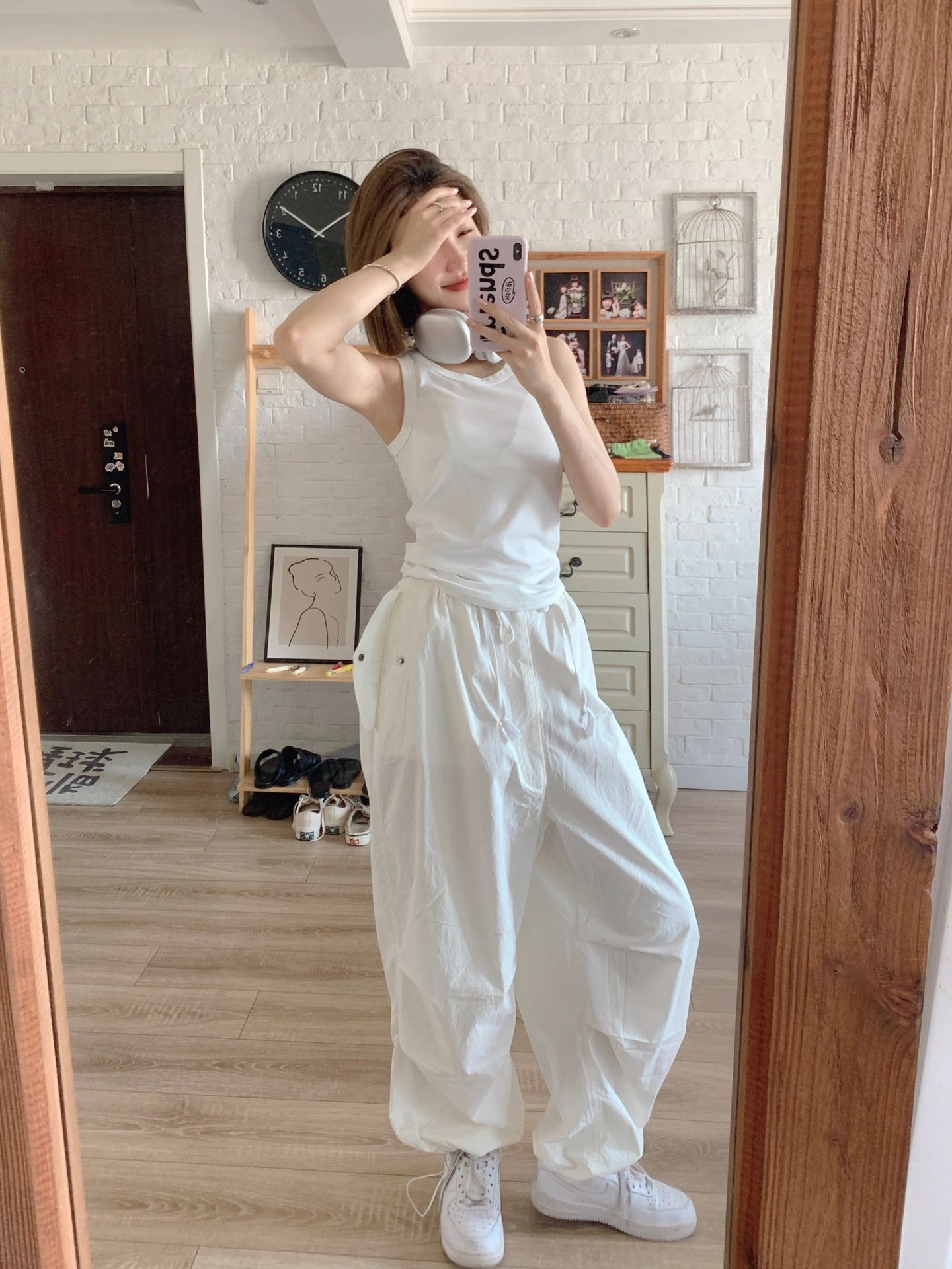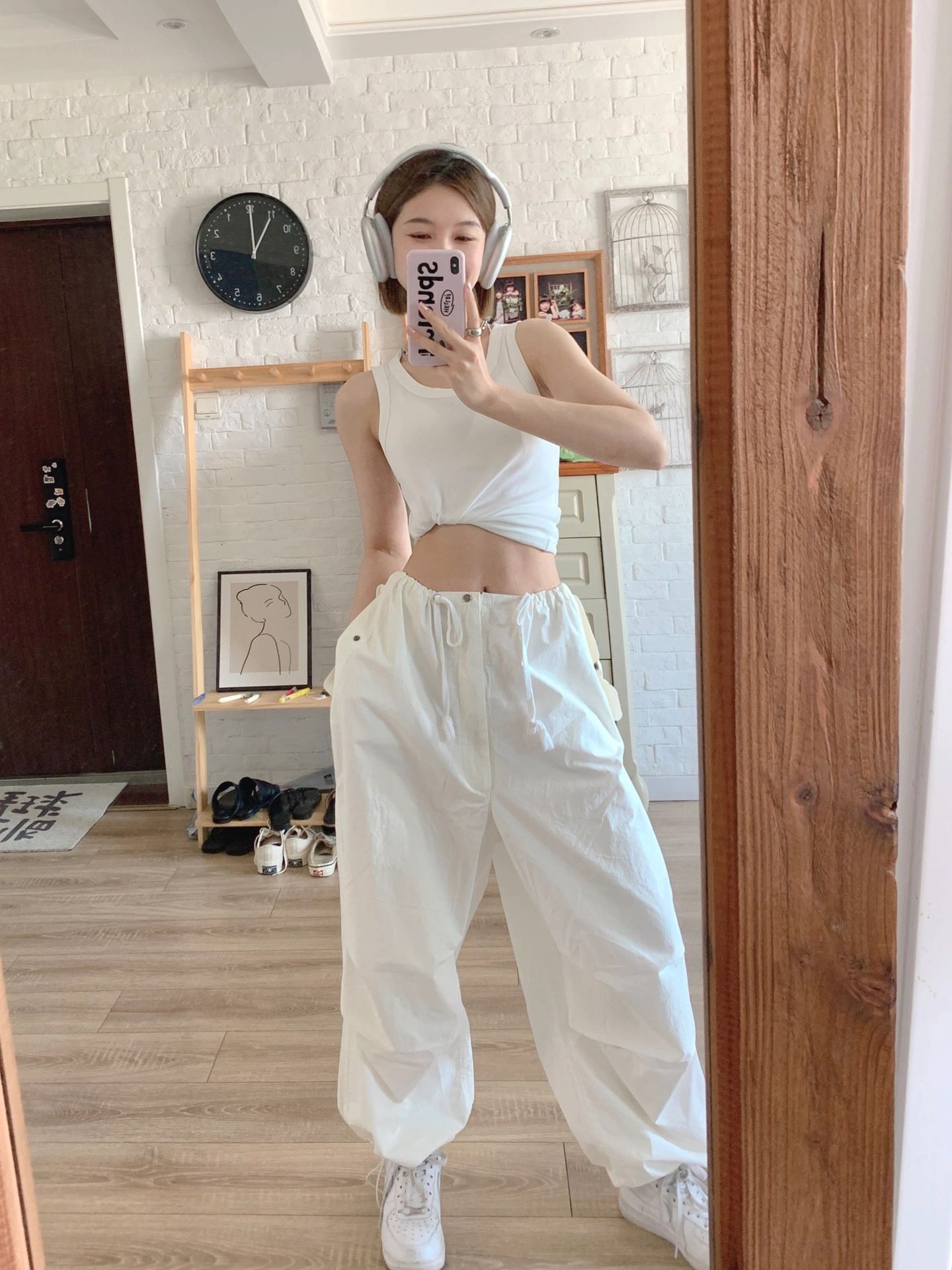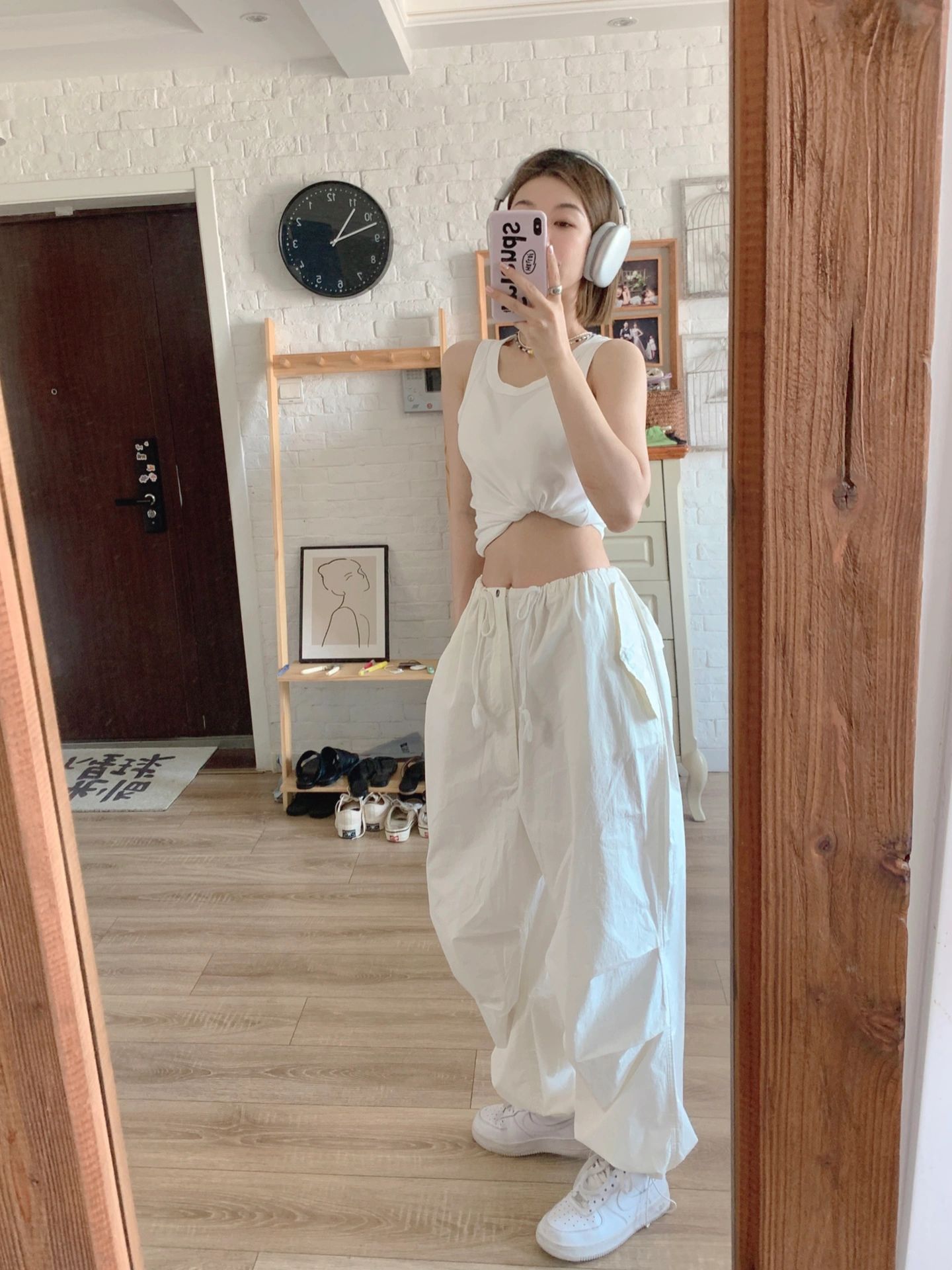 白色美式休閒工作服褲女夏季街頭束腳抽繩降落傘登山戶外運動闊腿褲