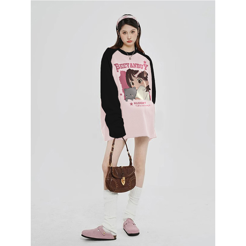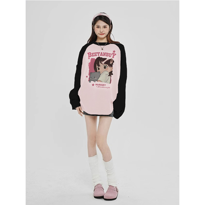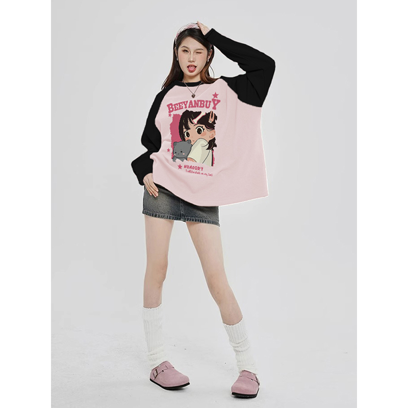 美式撞色插肩衛衣長袖女春秋薄款2023新爆款寬鬆高級感小個子上衣