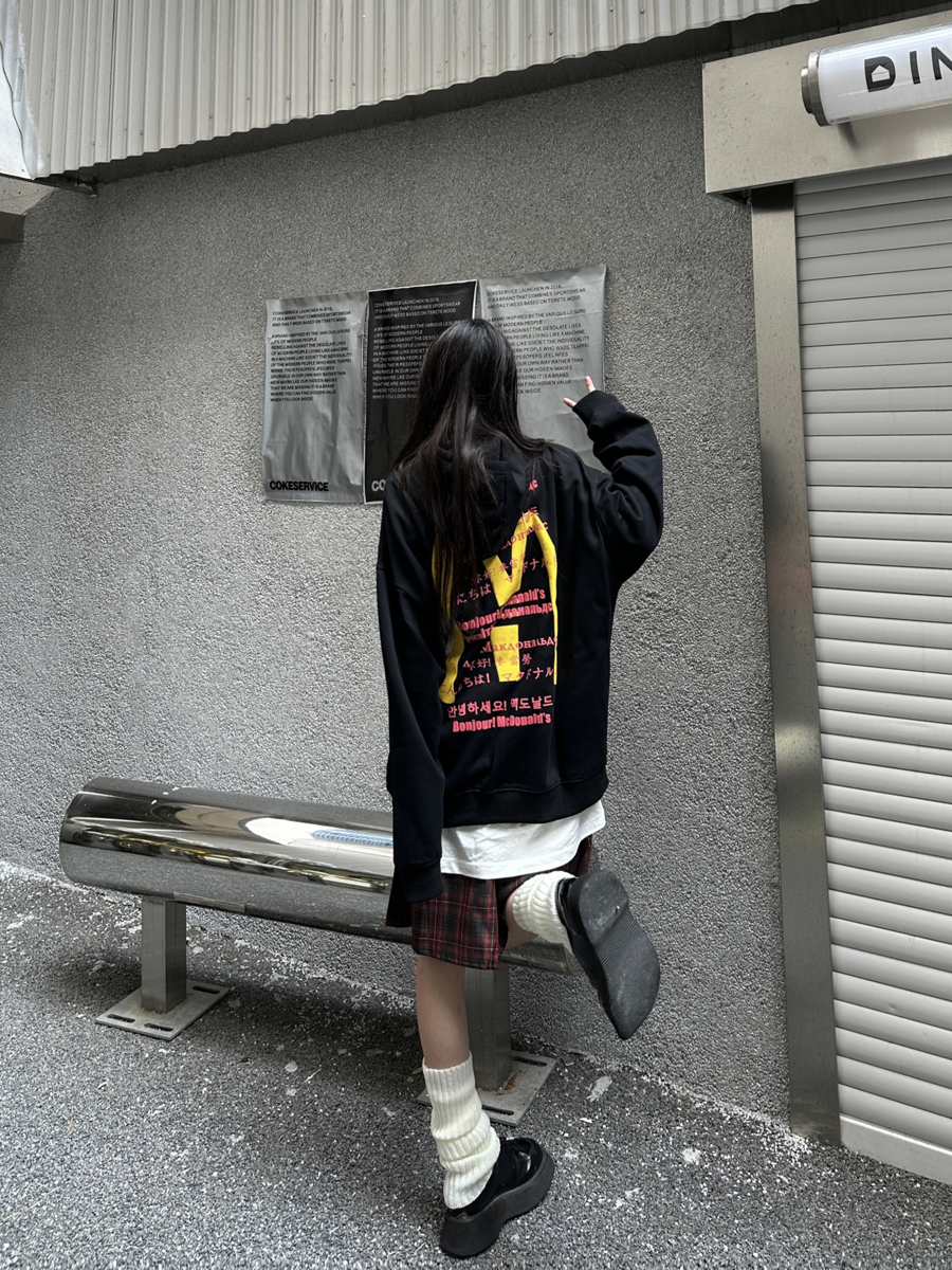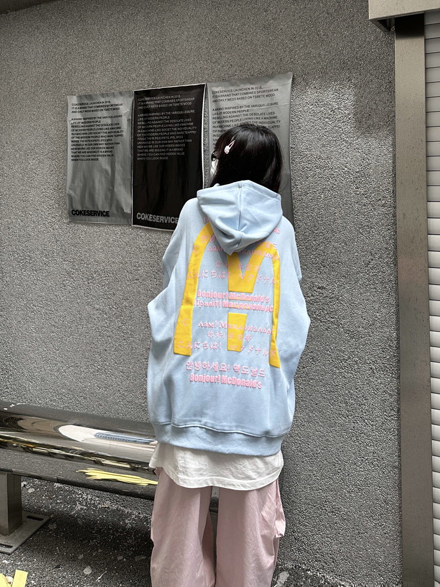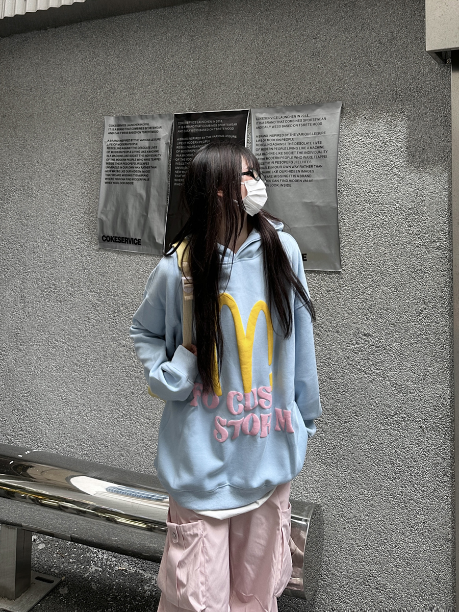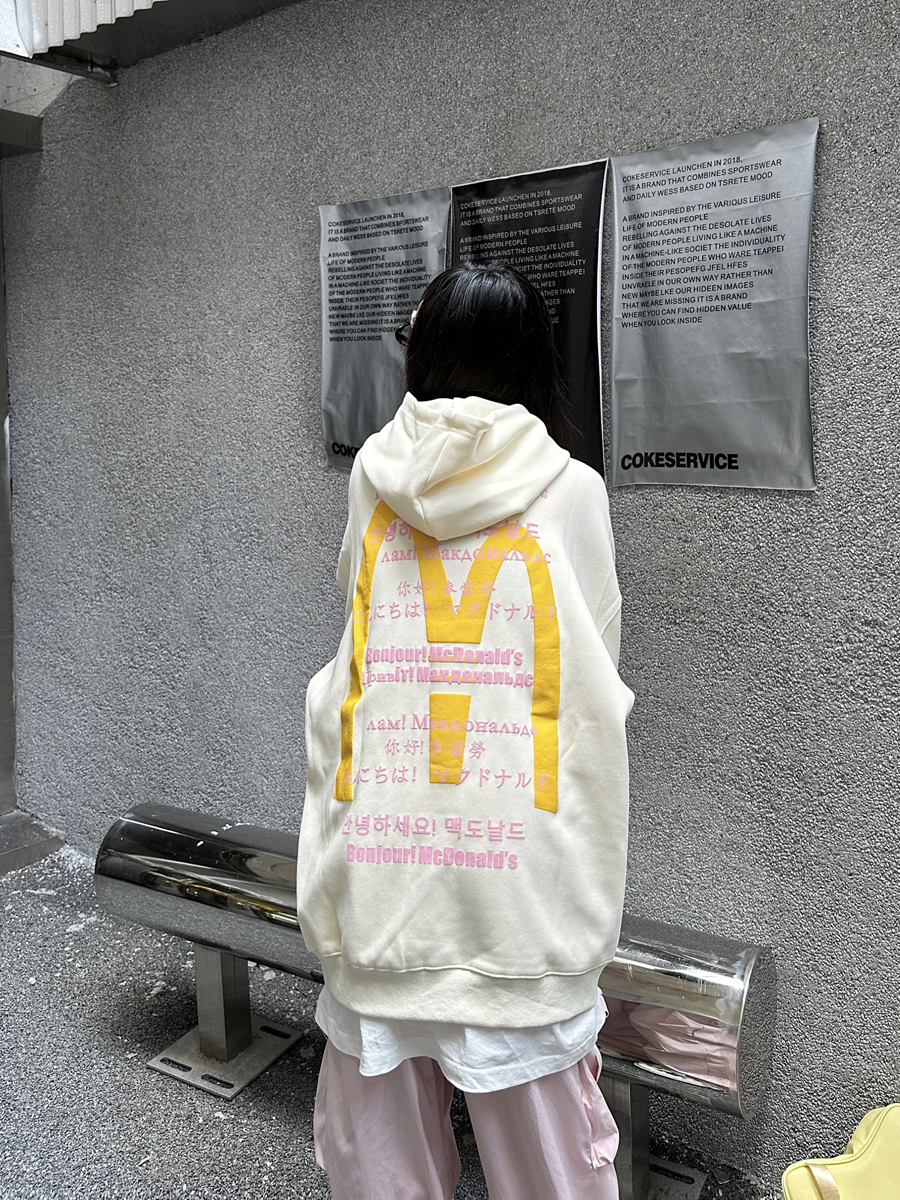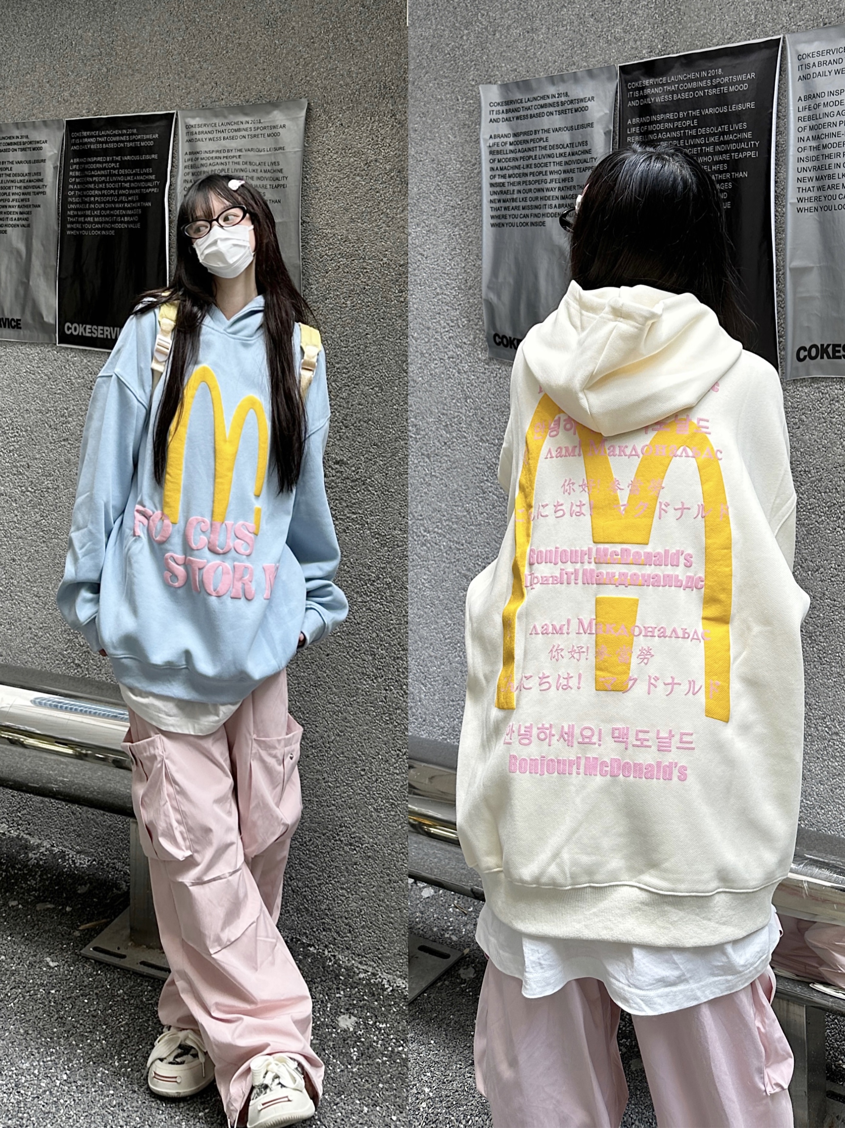 咖哩人美式復古麥當勞M字母印花連帽運動衫男女秋季高街情侶寬鬆潮