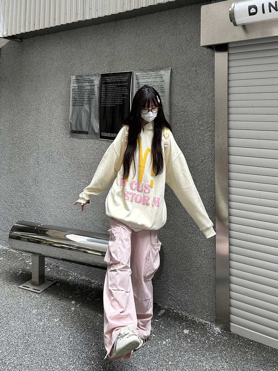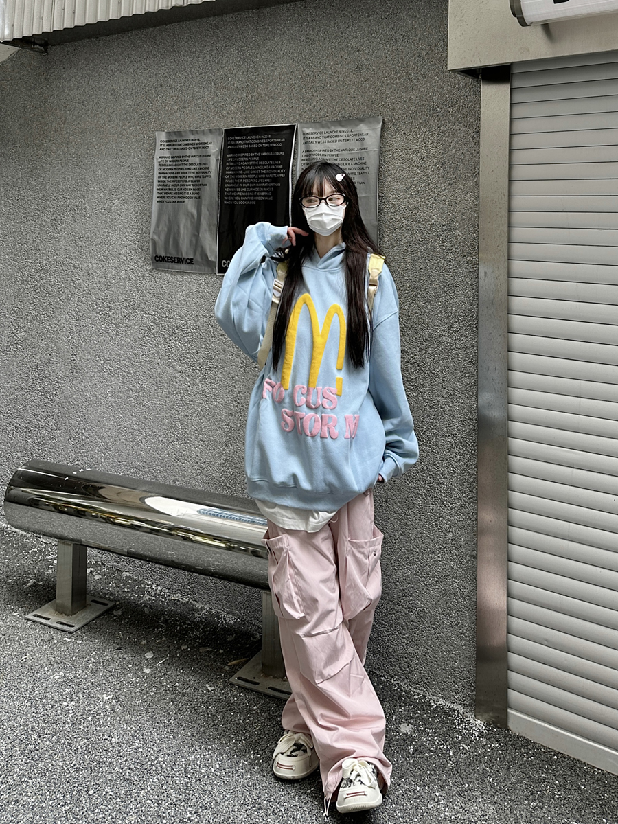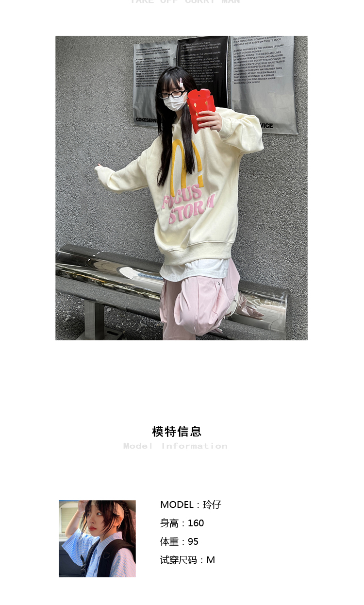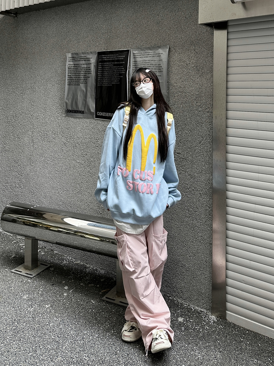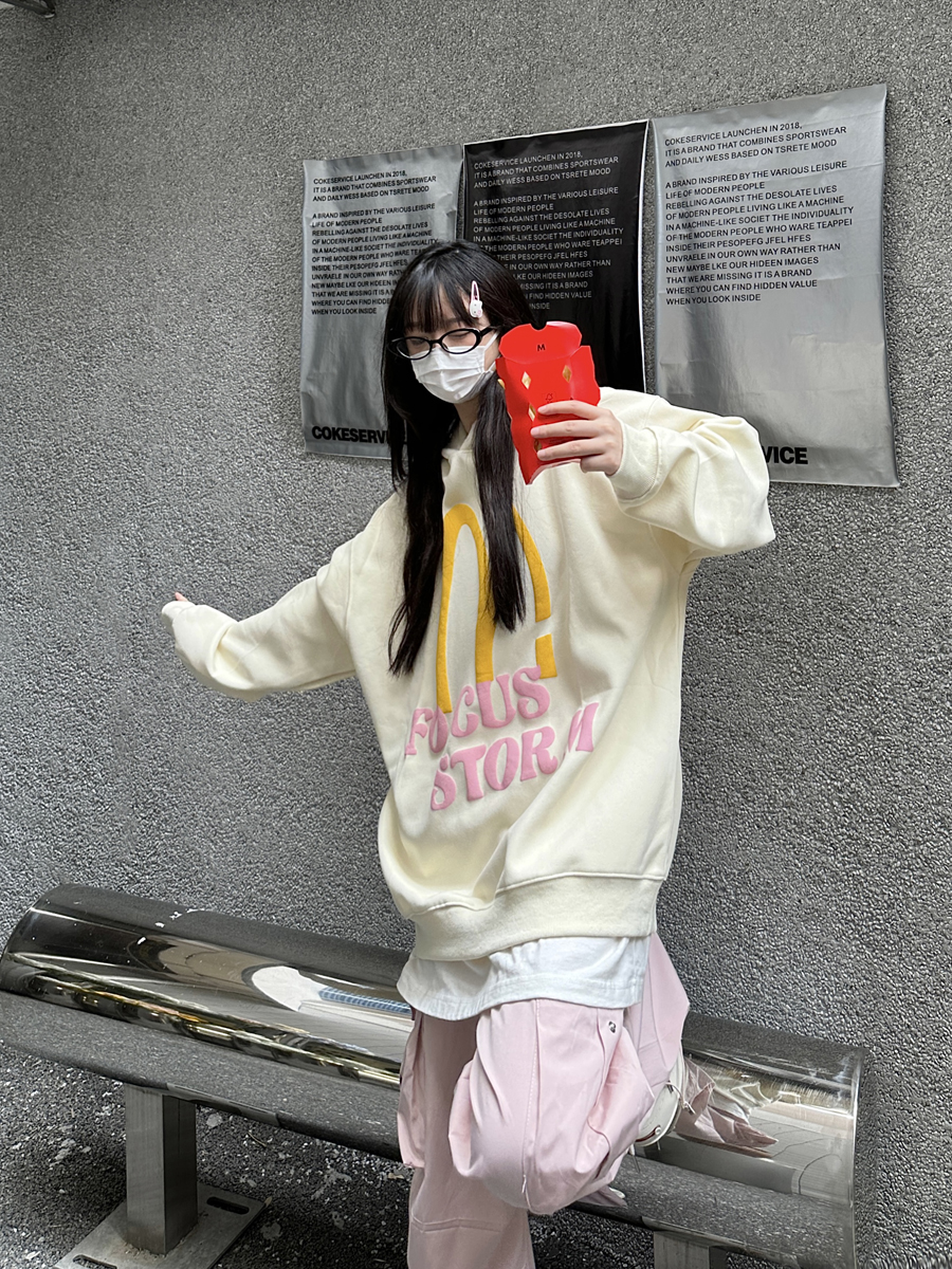 咖哩人美式復古麥當勞M字母印花連帽運動衫男女秋季高街情侶寬鬆潮