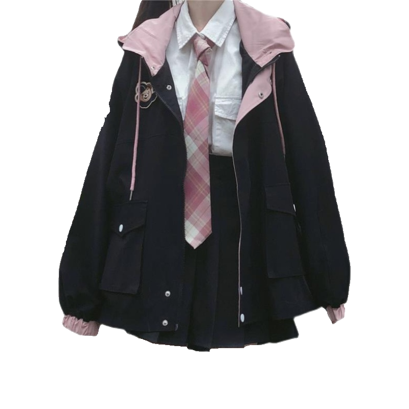 秋季新款韓版拼色港風外套女學生學院風寬鬆百搭連帽工裝夾克上衣