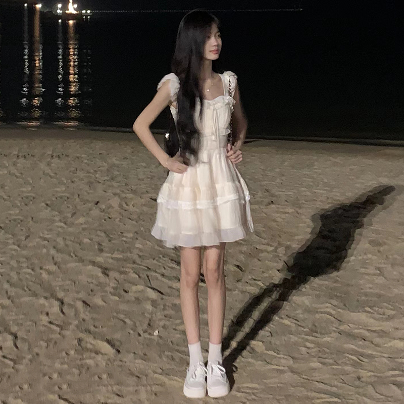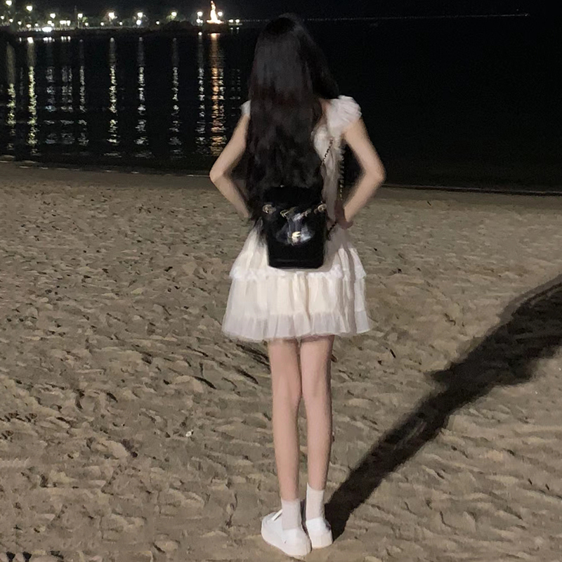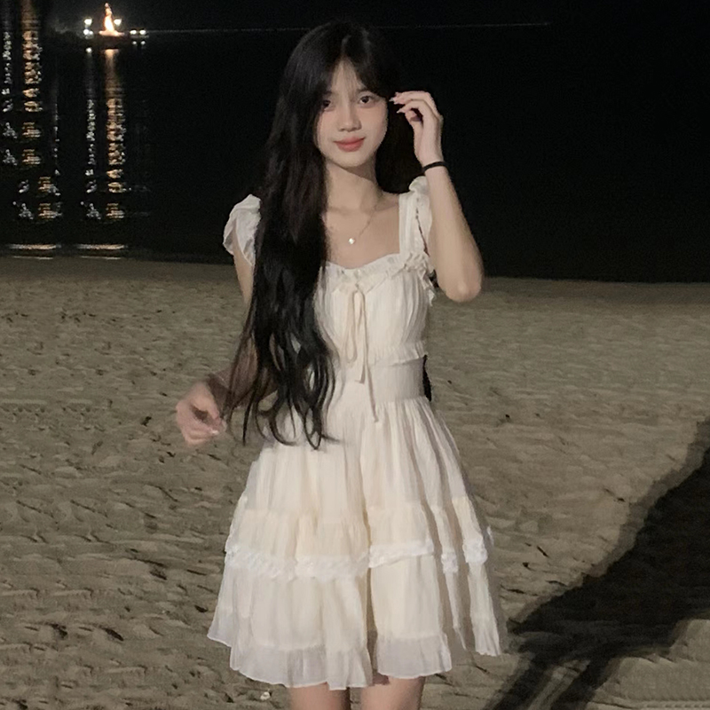 法式高級感甜美1/4吋套筒扳手袖洋裝子女收腰氣質小個子a字短裙新款2023