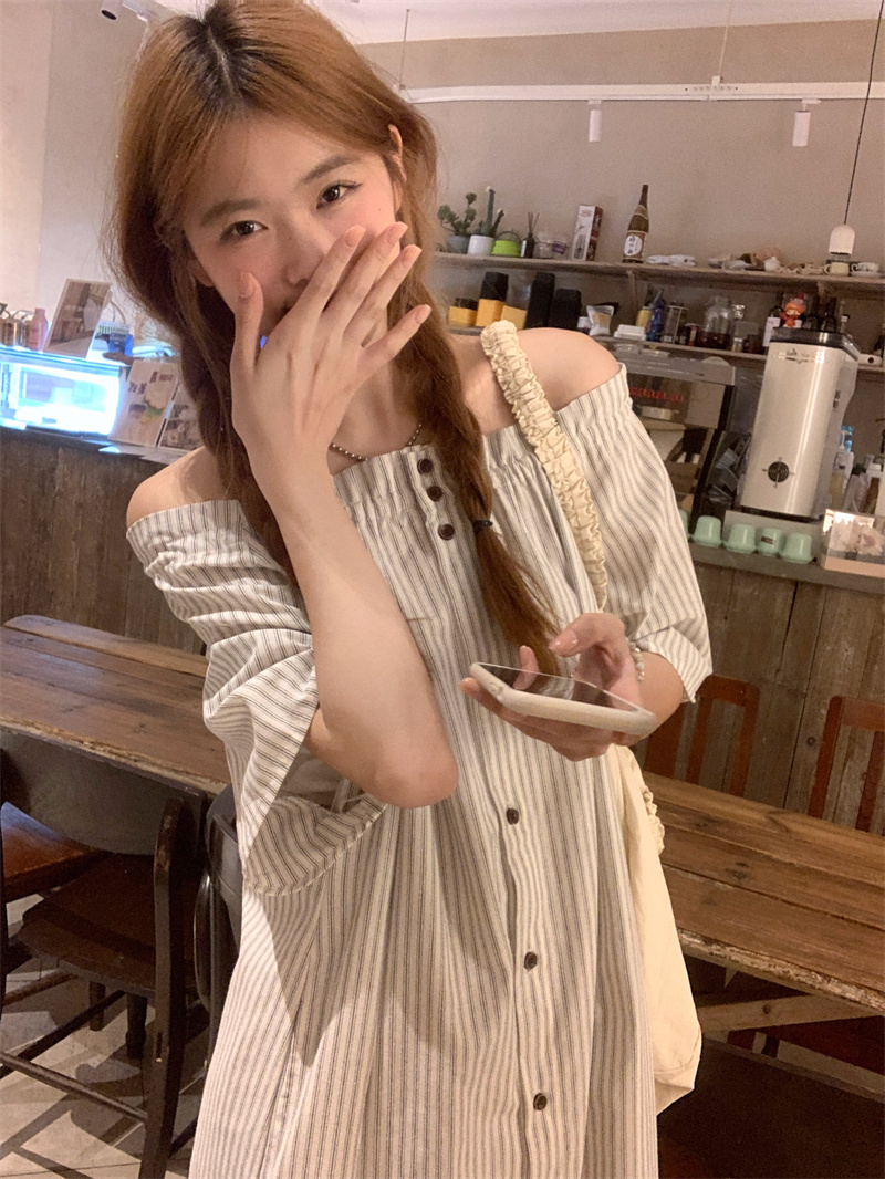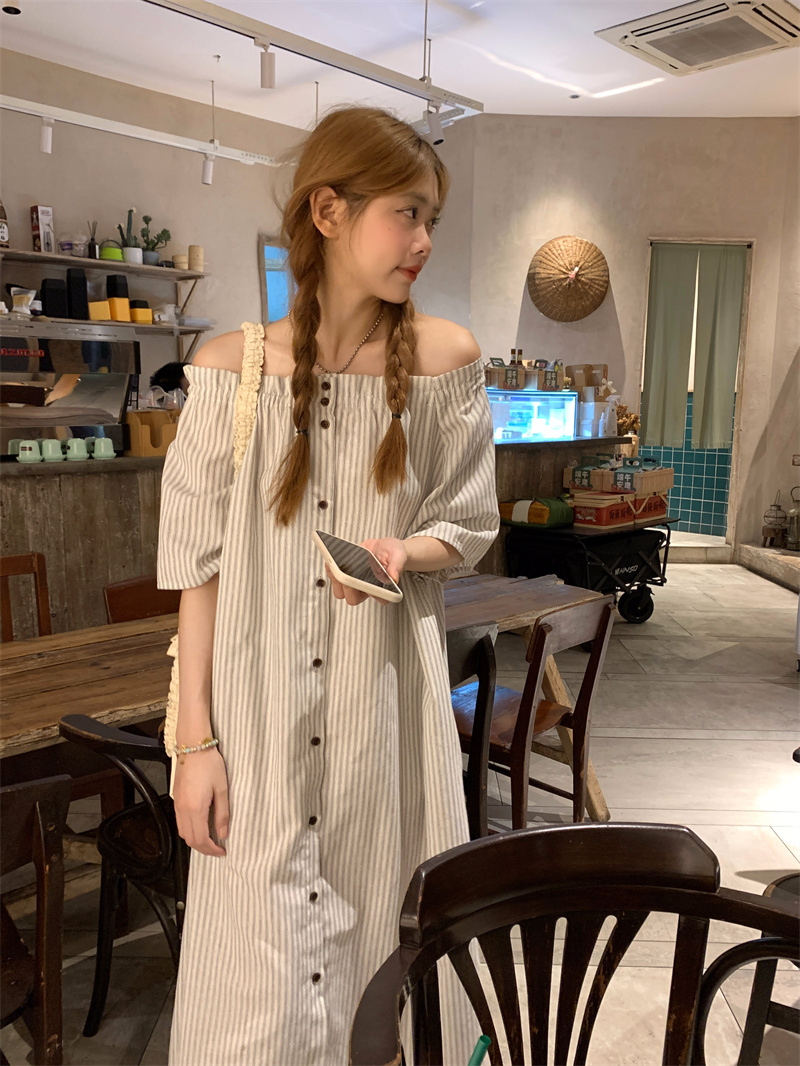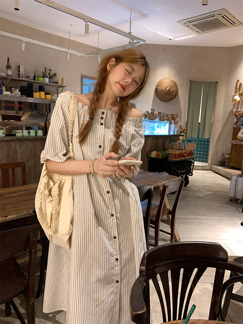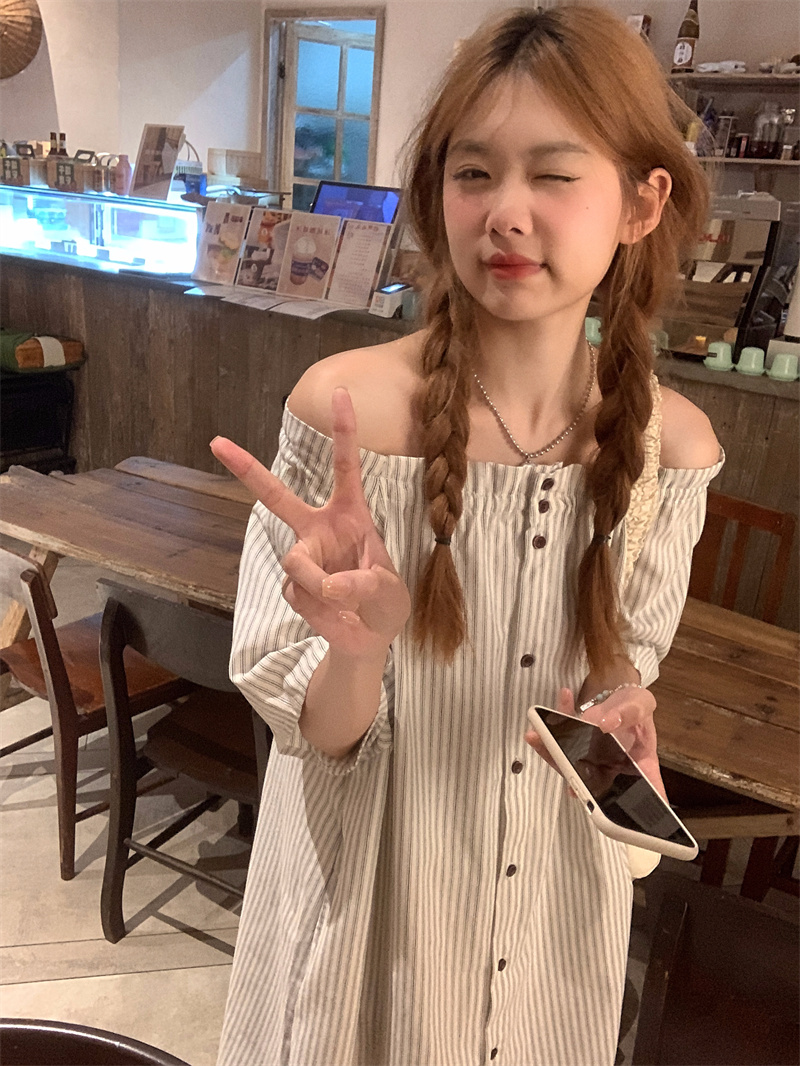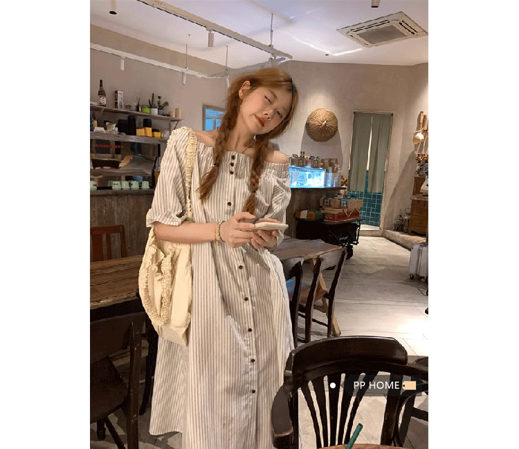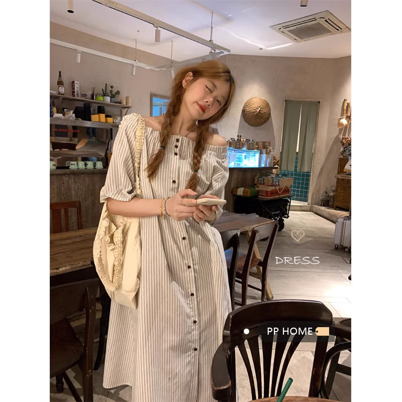 PPHOME甜甜初戀~日系復古條紋洋裝夏季時尚簡約一字肩兩穿長裙