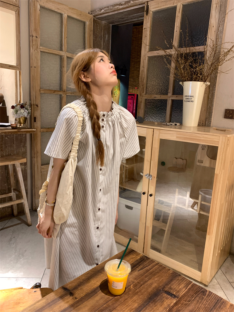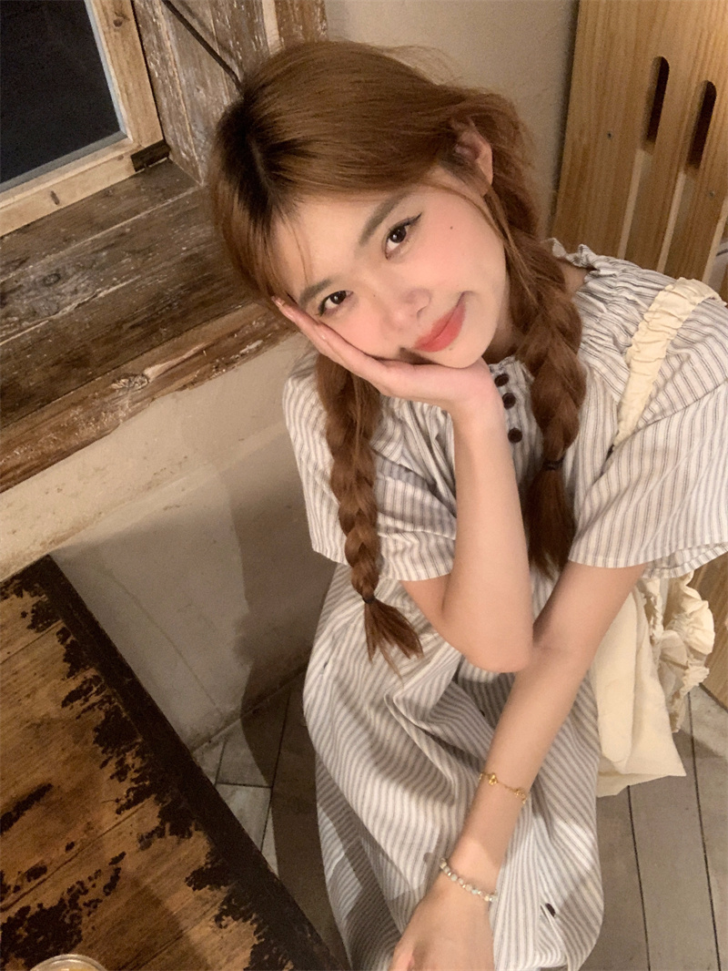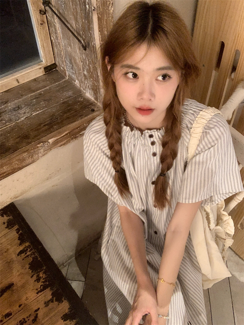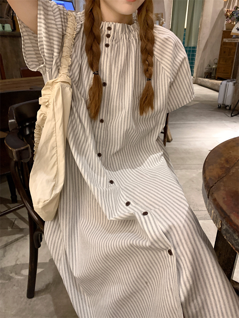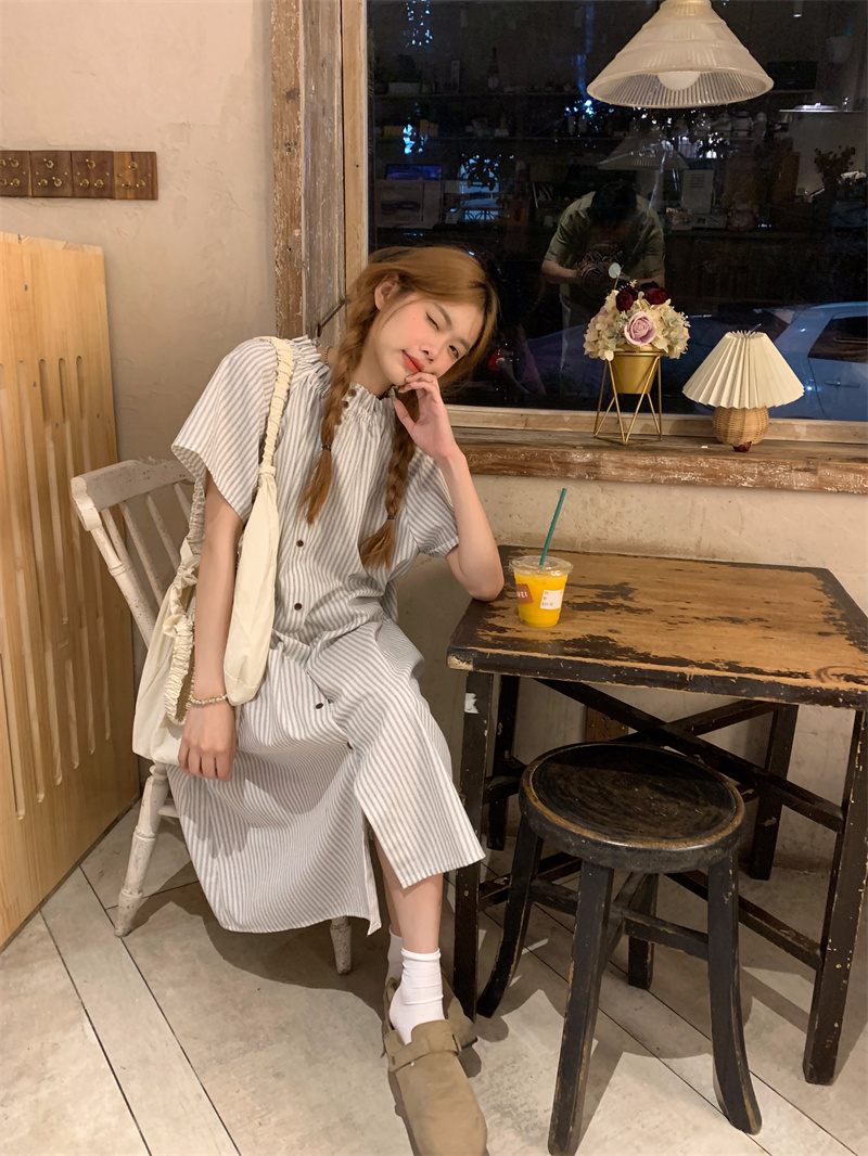 PPHOME甜甜初戀~日系復古條紋洋裝夏季時尚簡約一字肩兩穿長裙