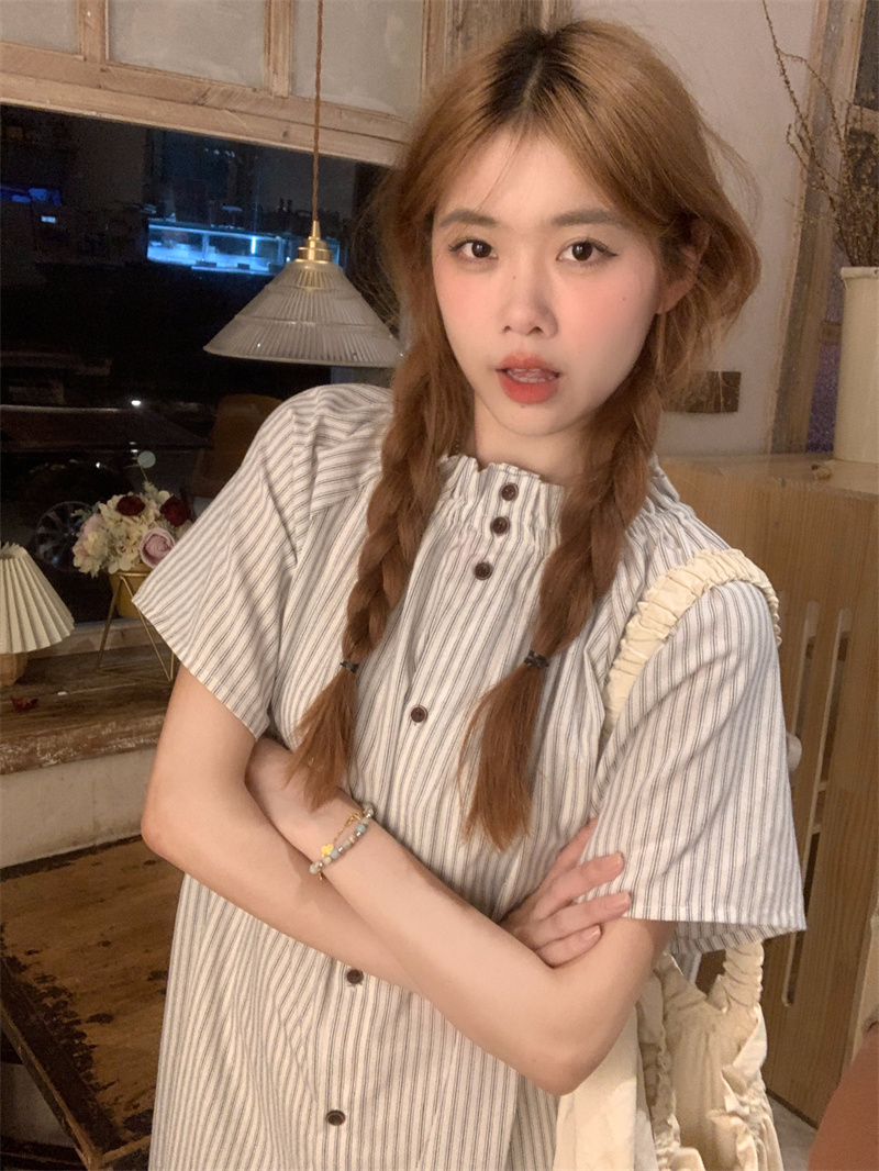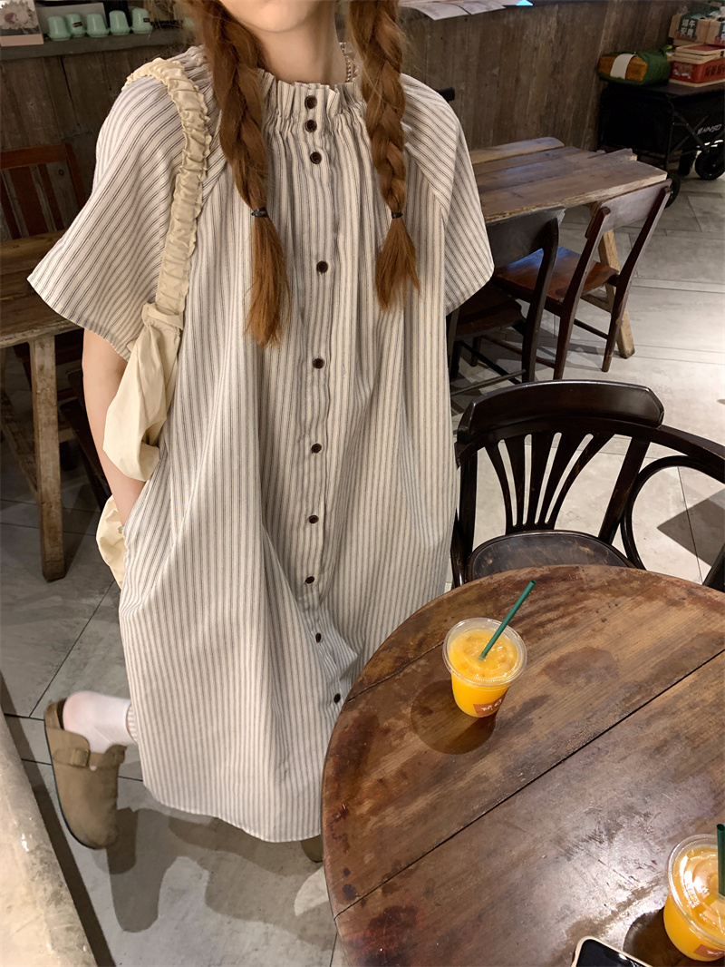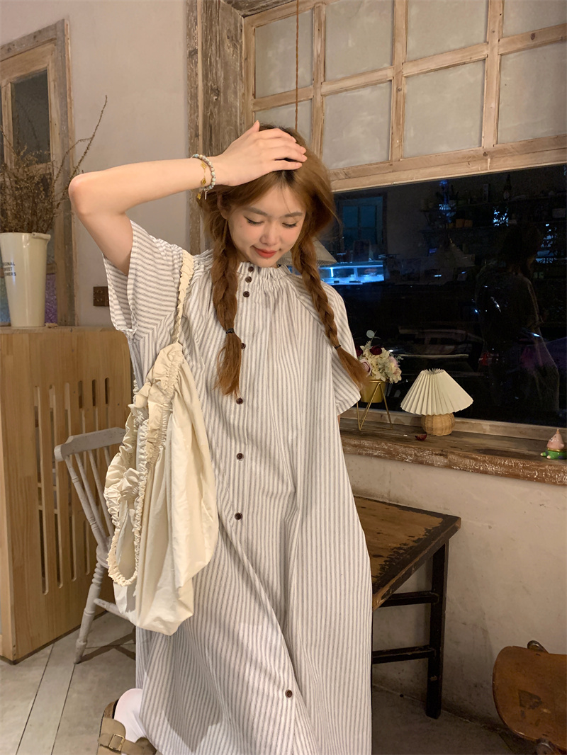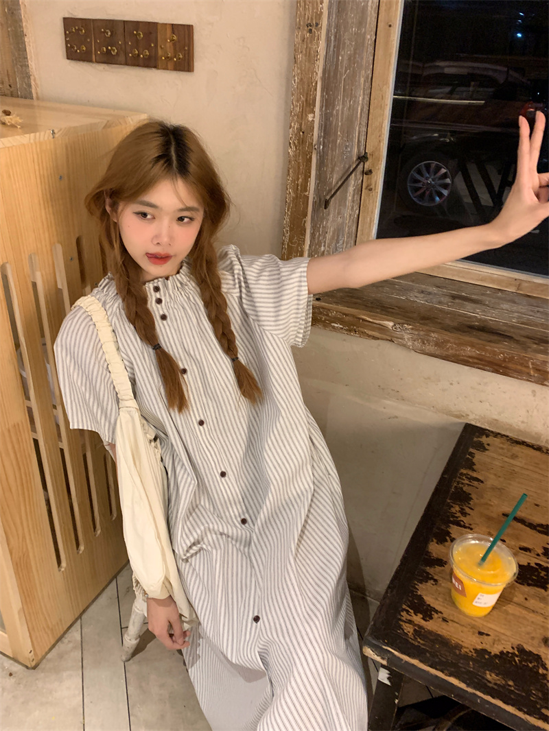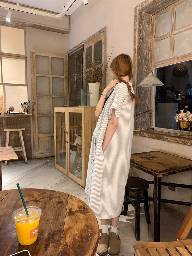 PPHOME甜甜初戀~日系復古條紋洋裝夏季時尚簡約一字肩兩穿長裙