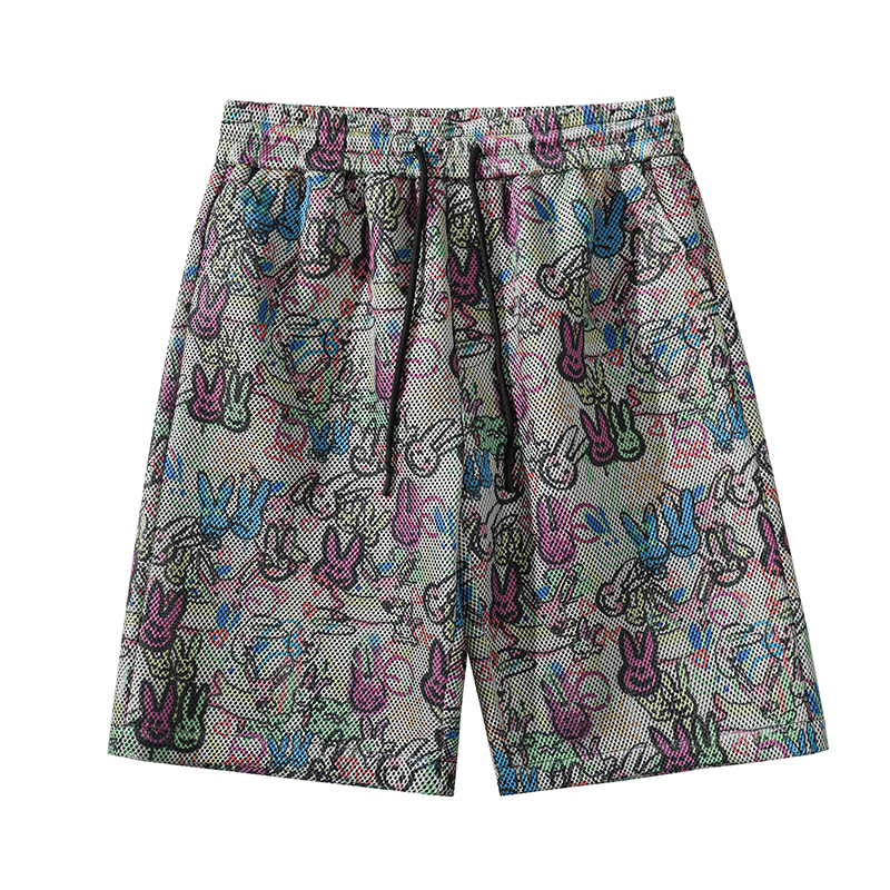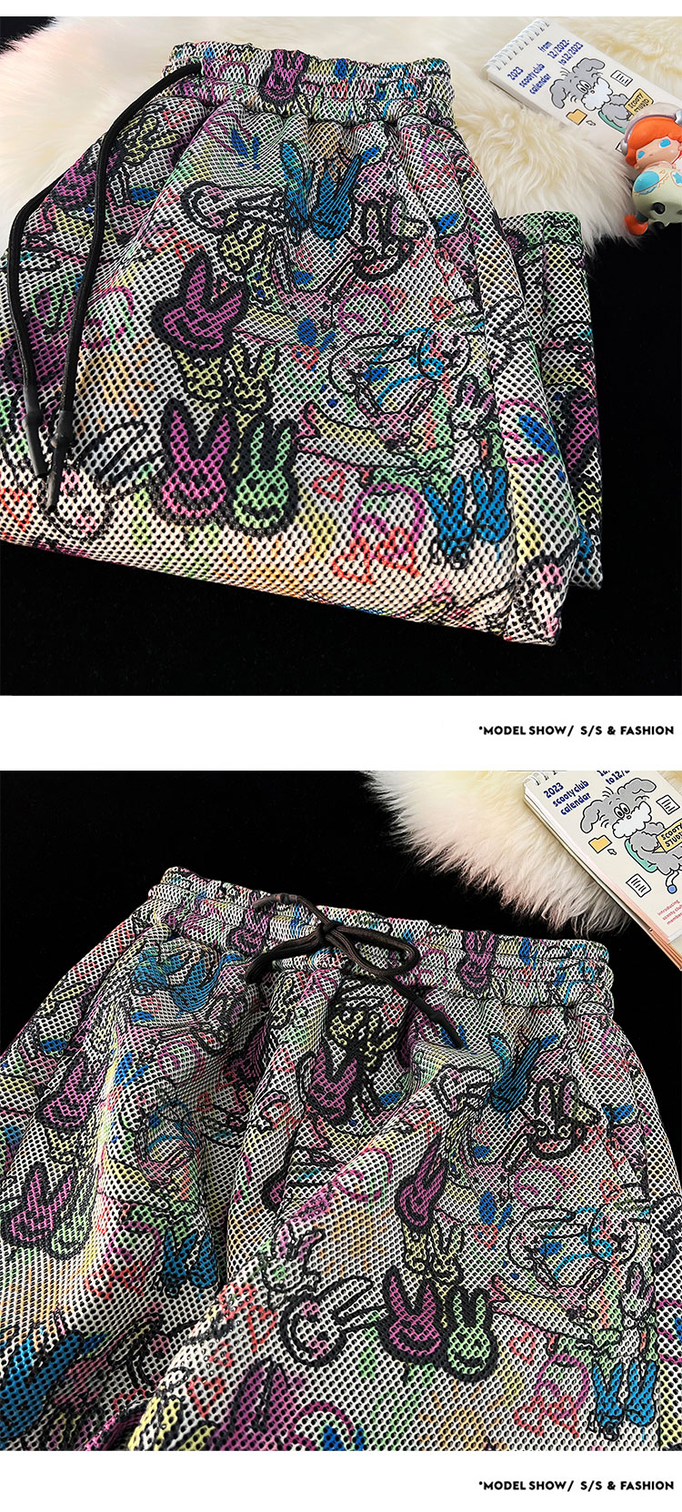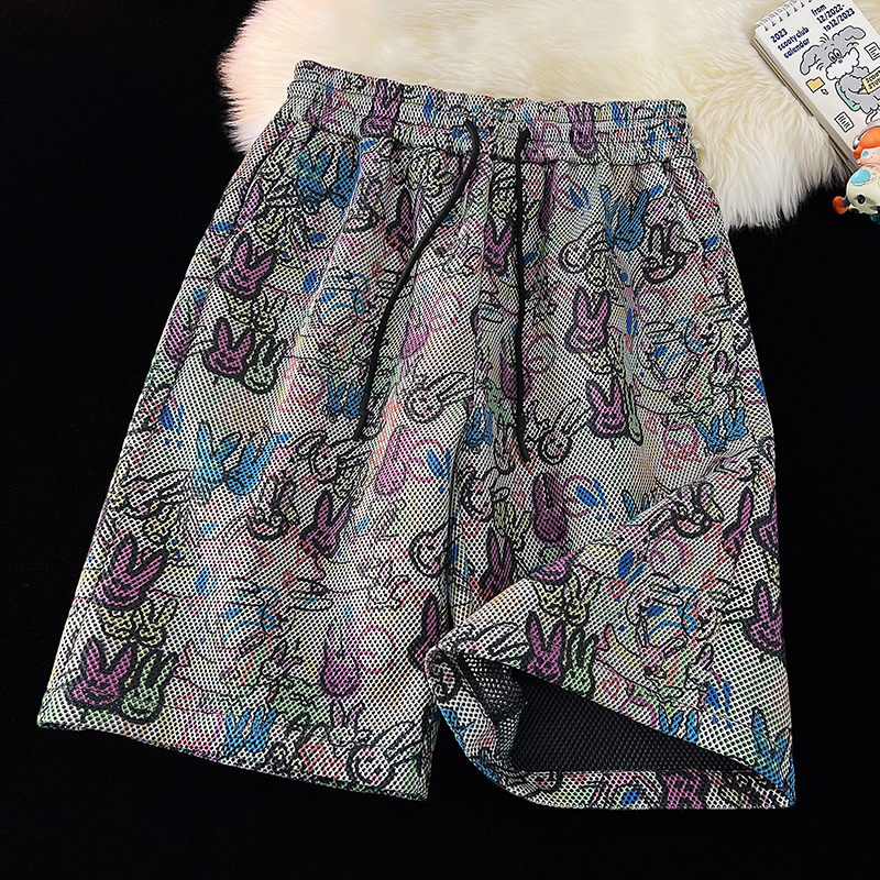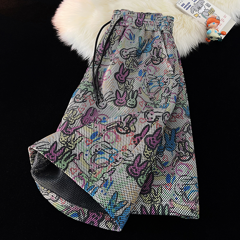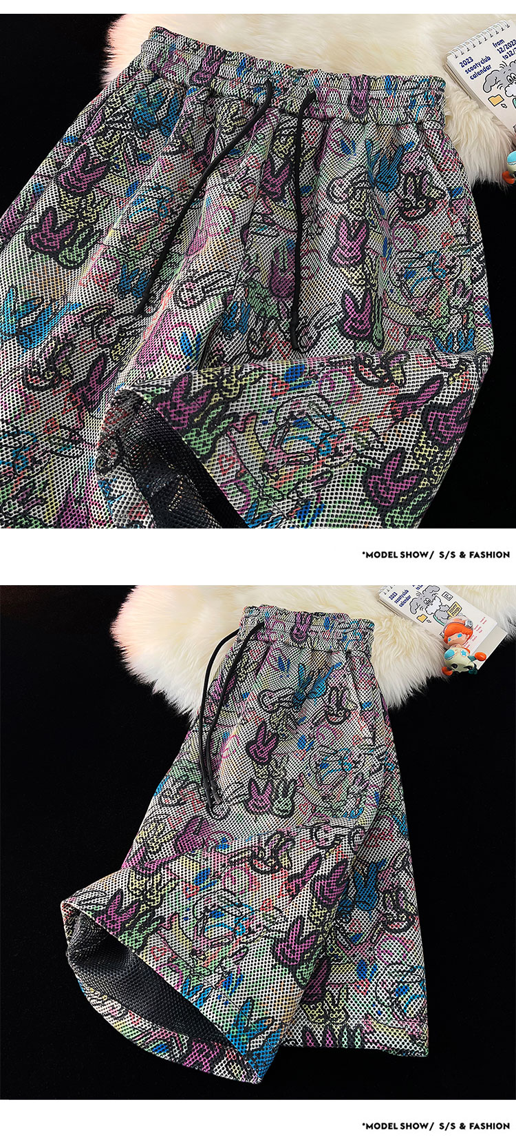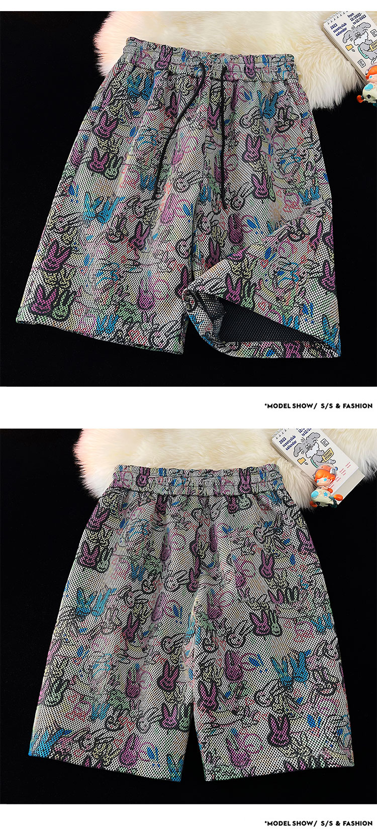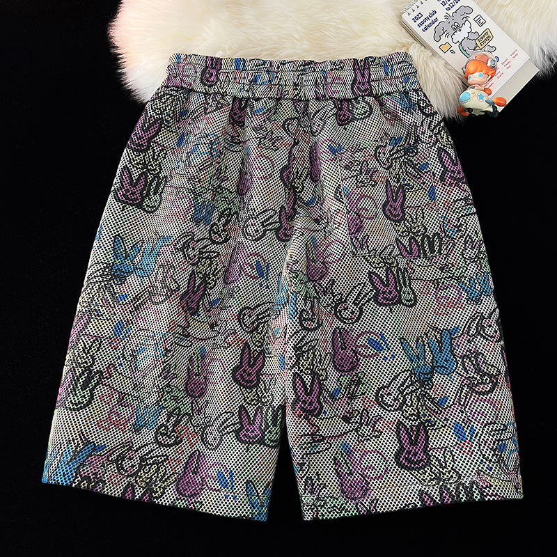 闊腿工裝短褲女2023新款設計感小眾大尺碼夏兔子塗鴉胖mm五分花褲子