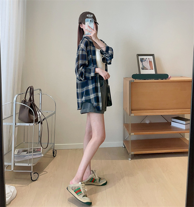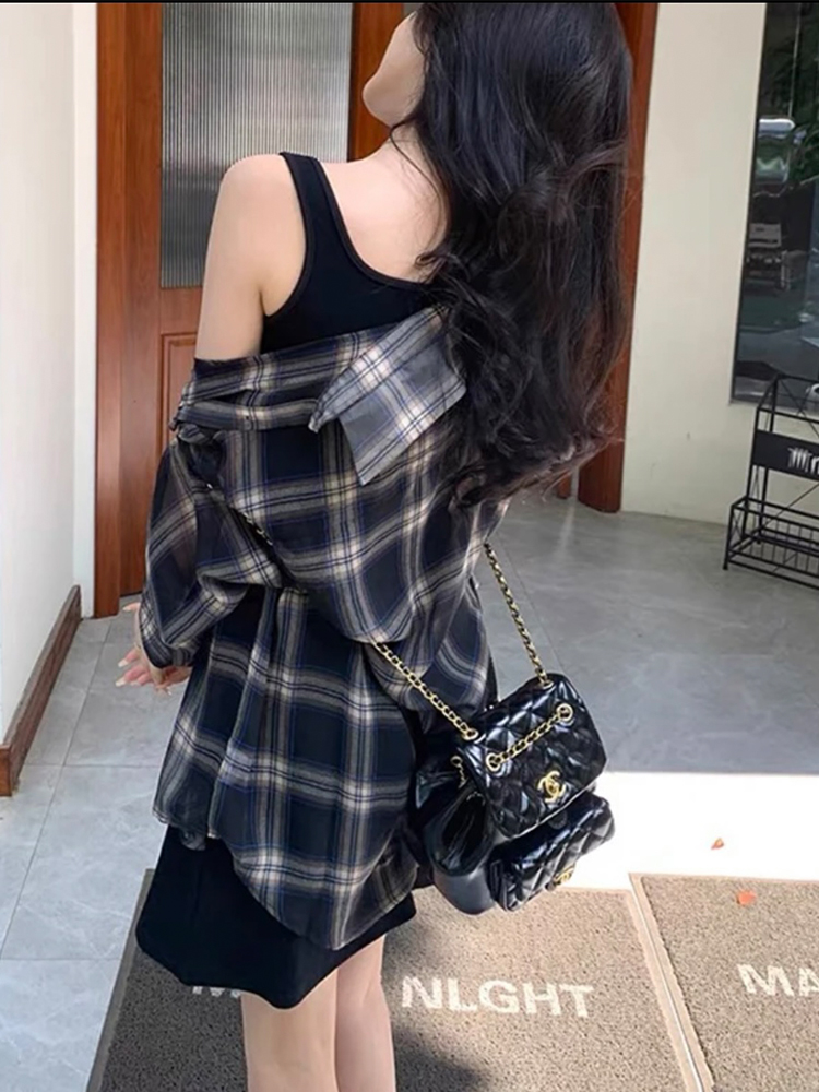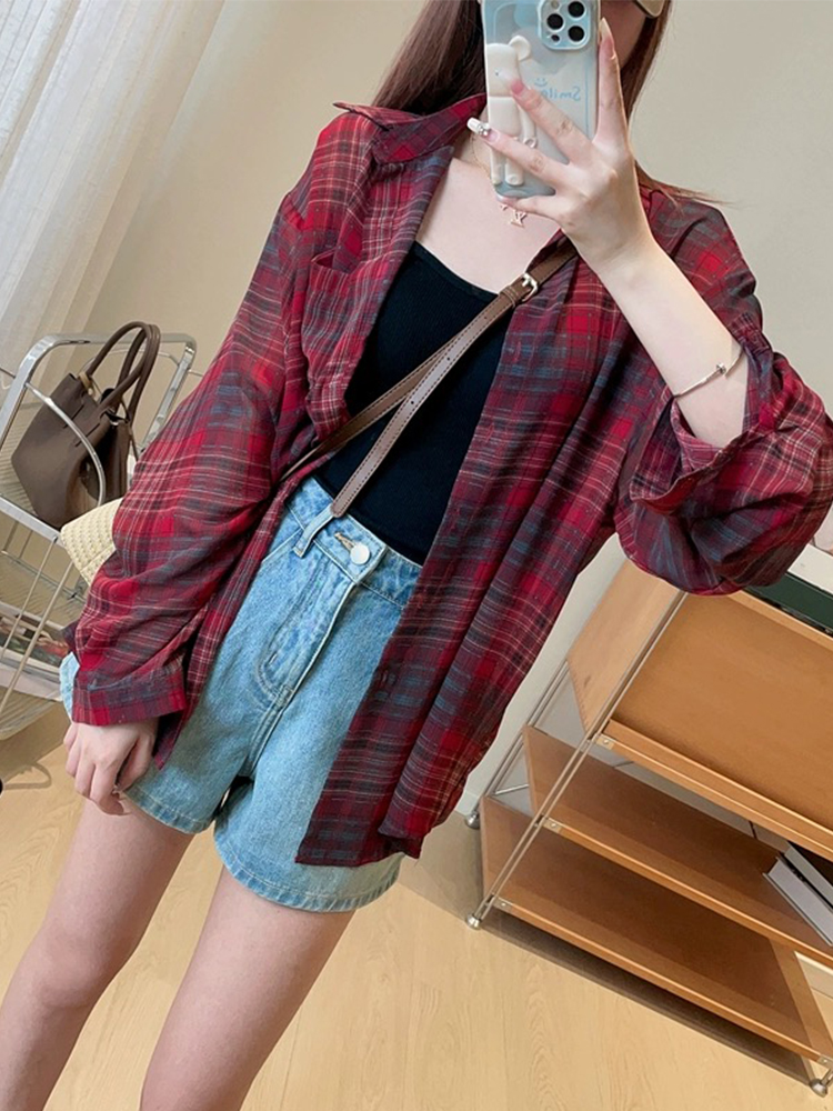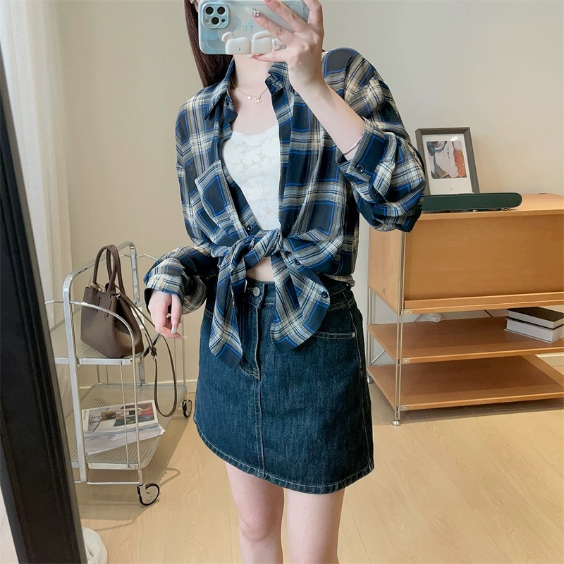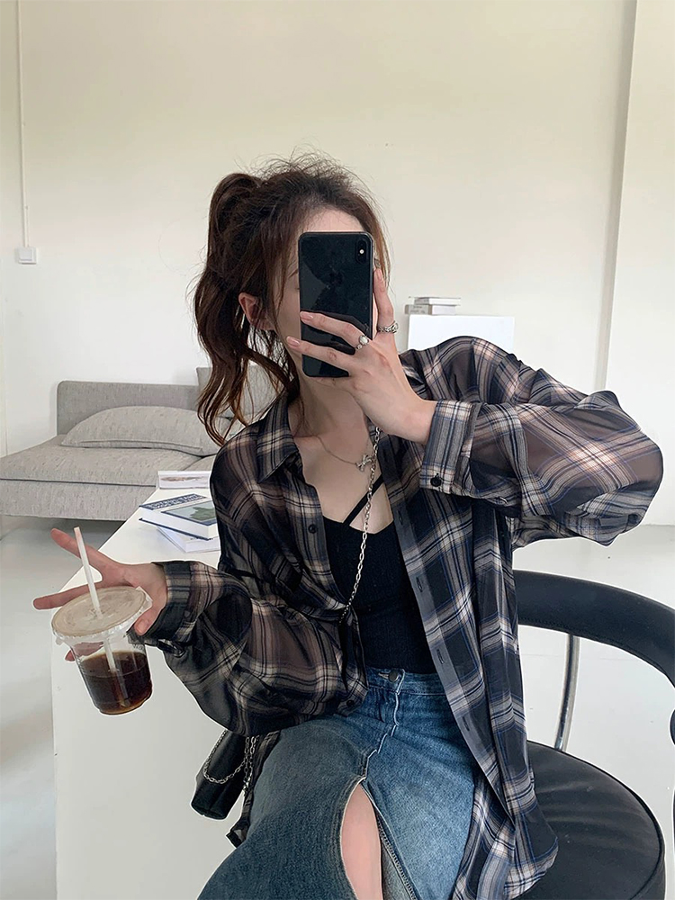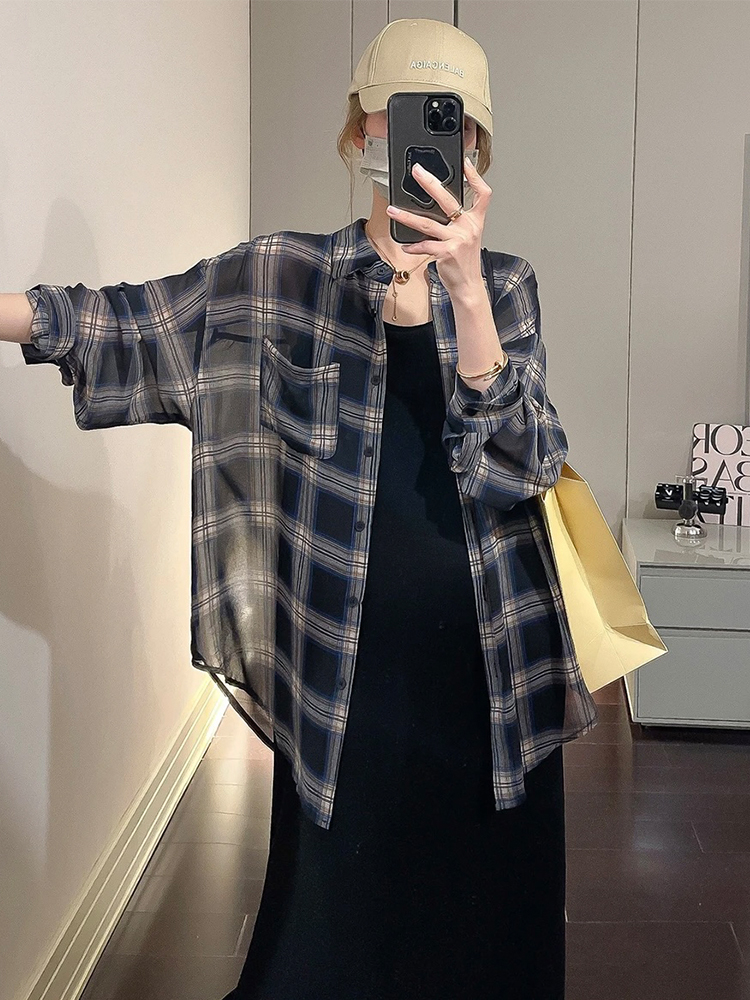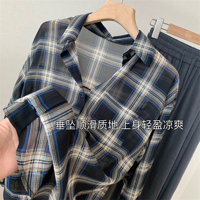 格子防曬襯衫女夏款設計感小眾仙氣上衣小個子港風雪紡長袖上衣