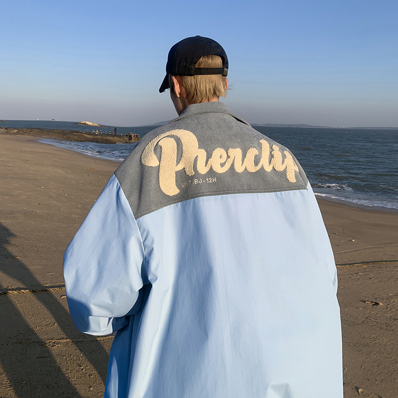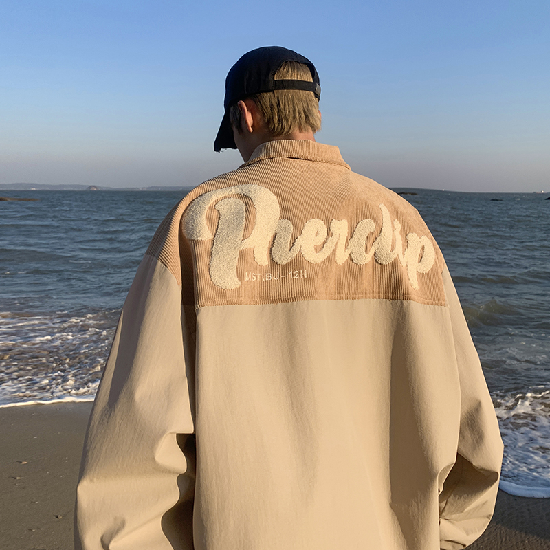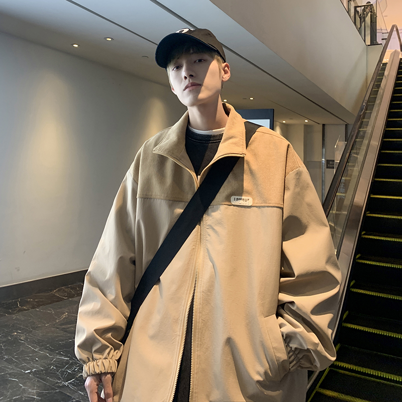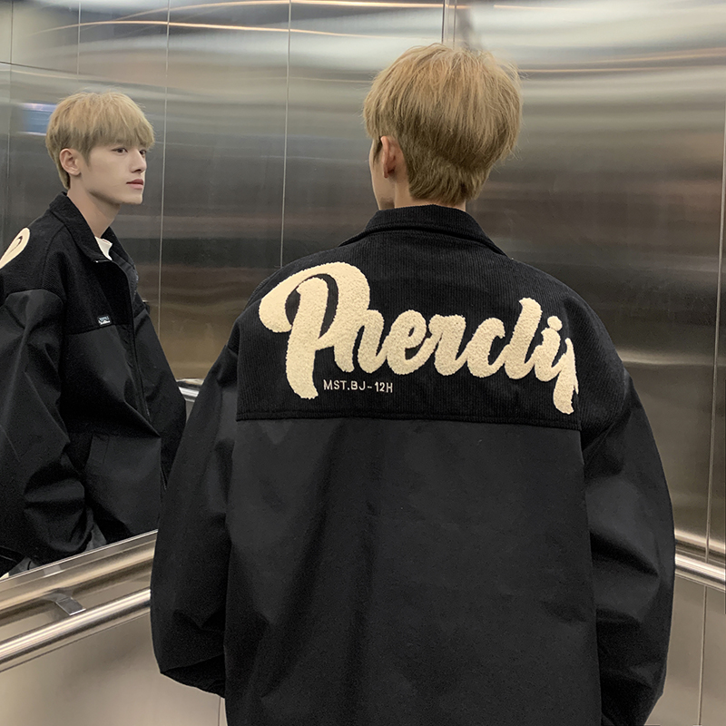 拼接夾克撞色oversize日系復古植絨字母男外套春新款上衣vinatge