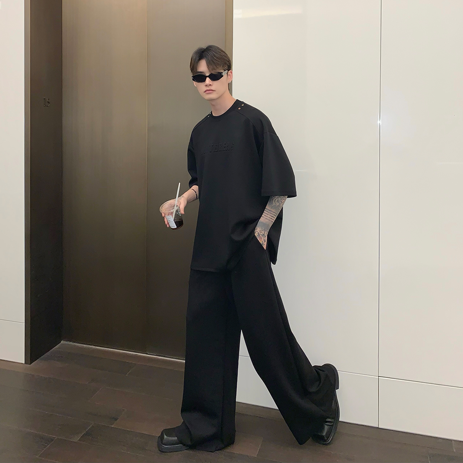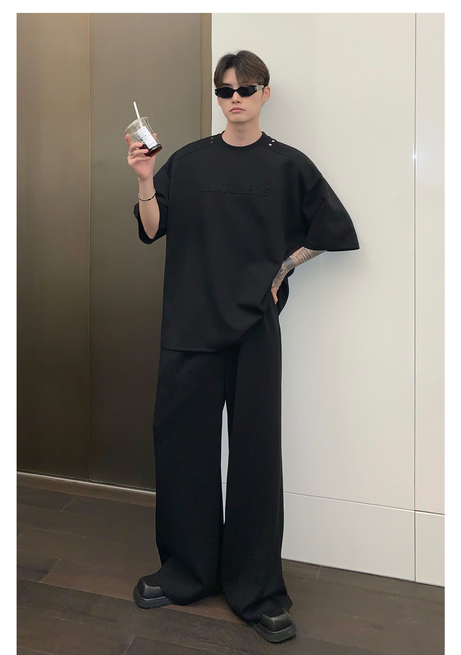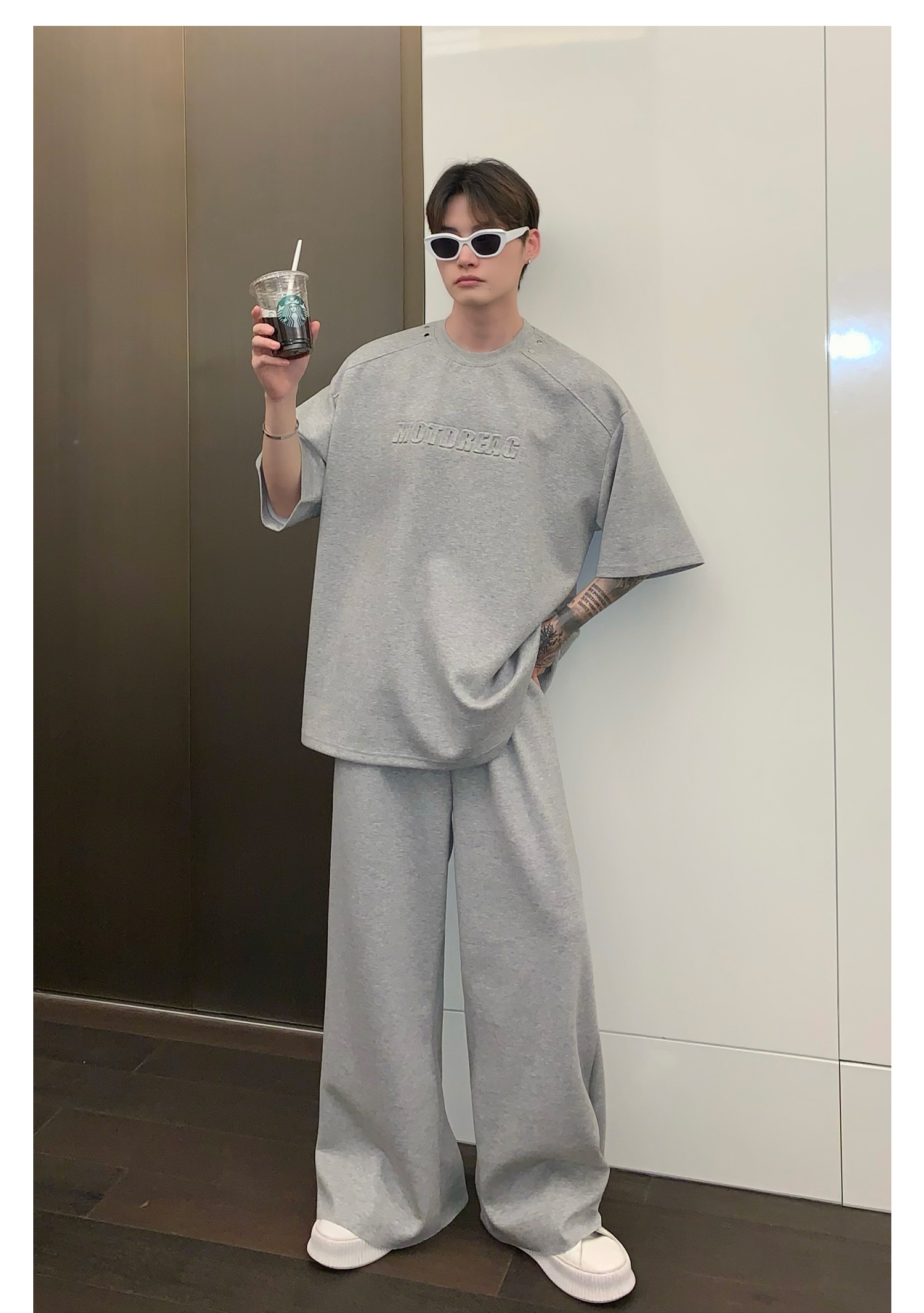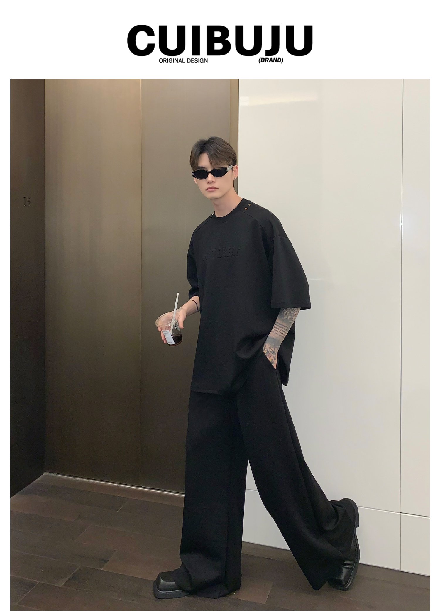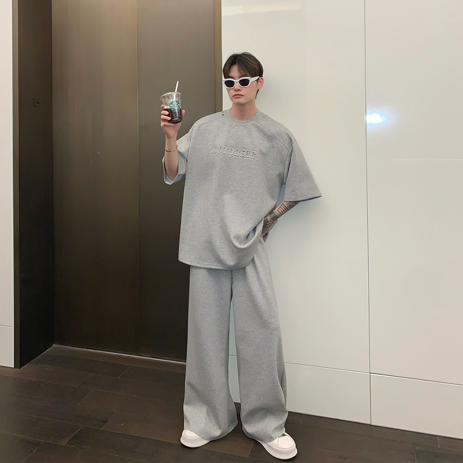 cuibuju 簡約小領口短袖男夏季立體字母休閒套裝百搭直筒長褲一套
