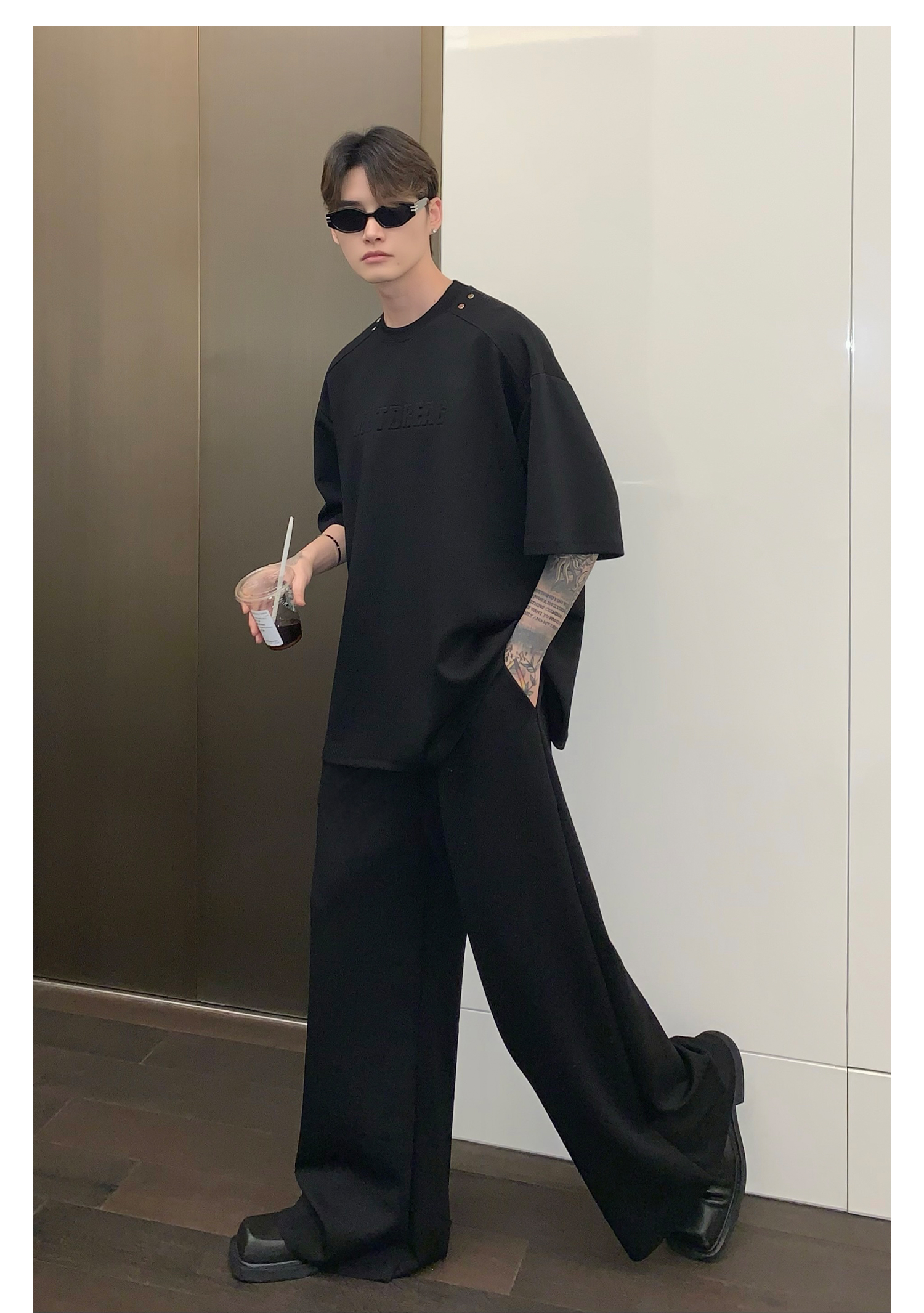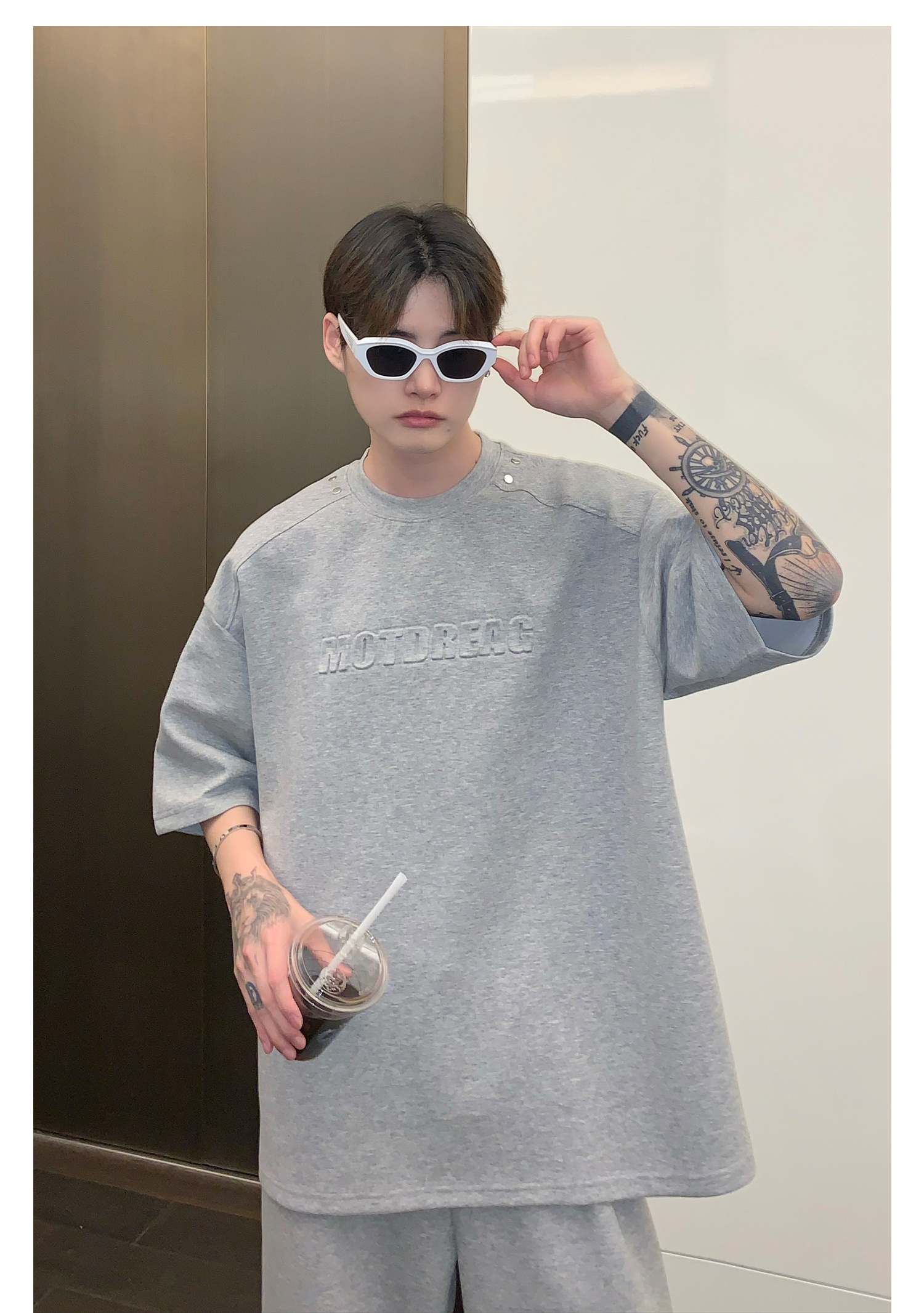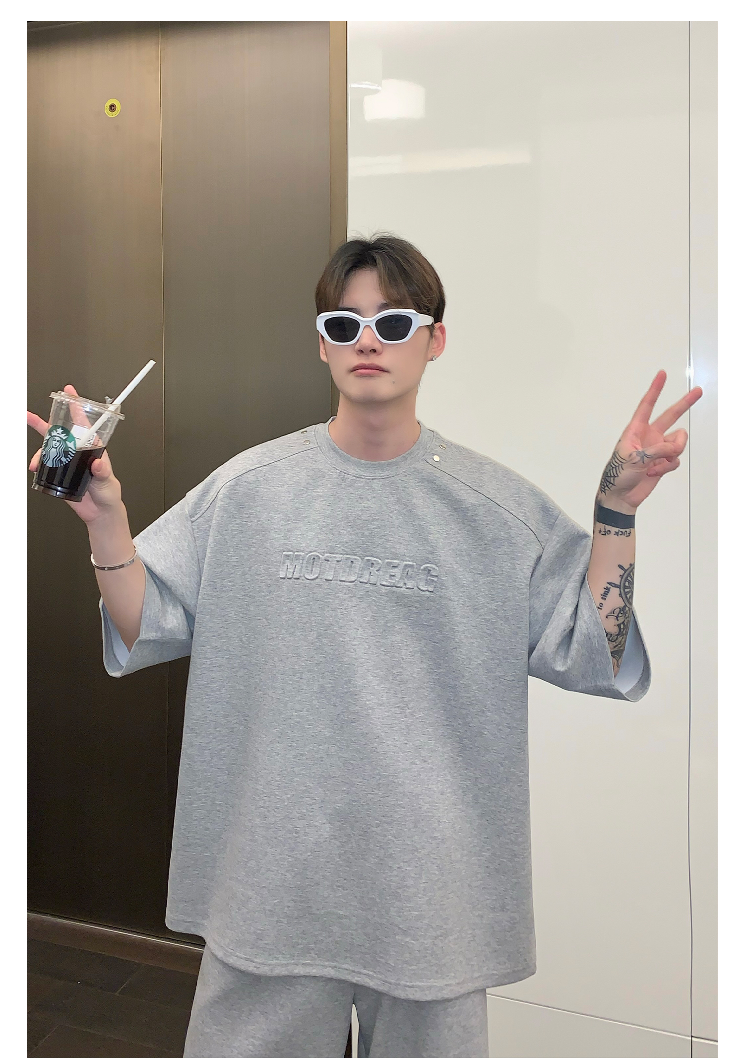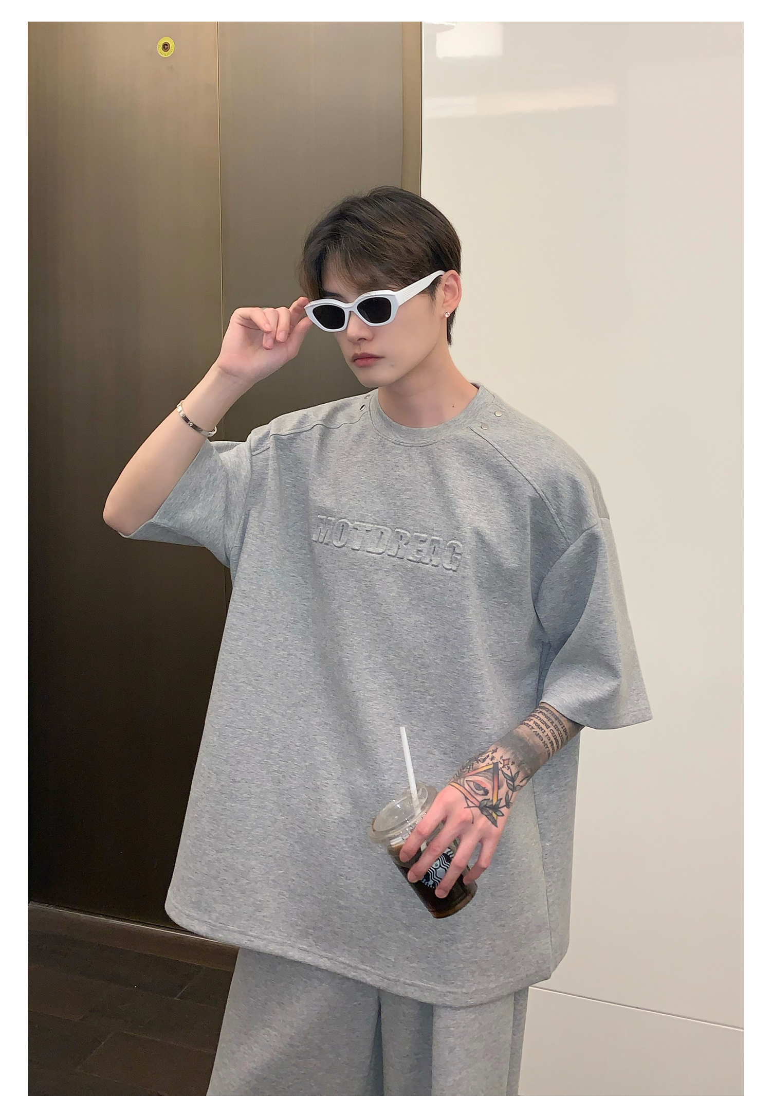 cuibuju 簡約小領口短袖男夏季立體字母休閒套裝百搭直筒長褲一套