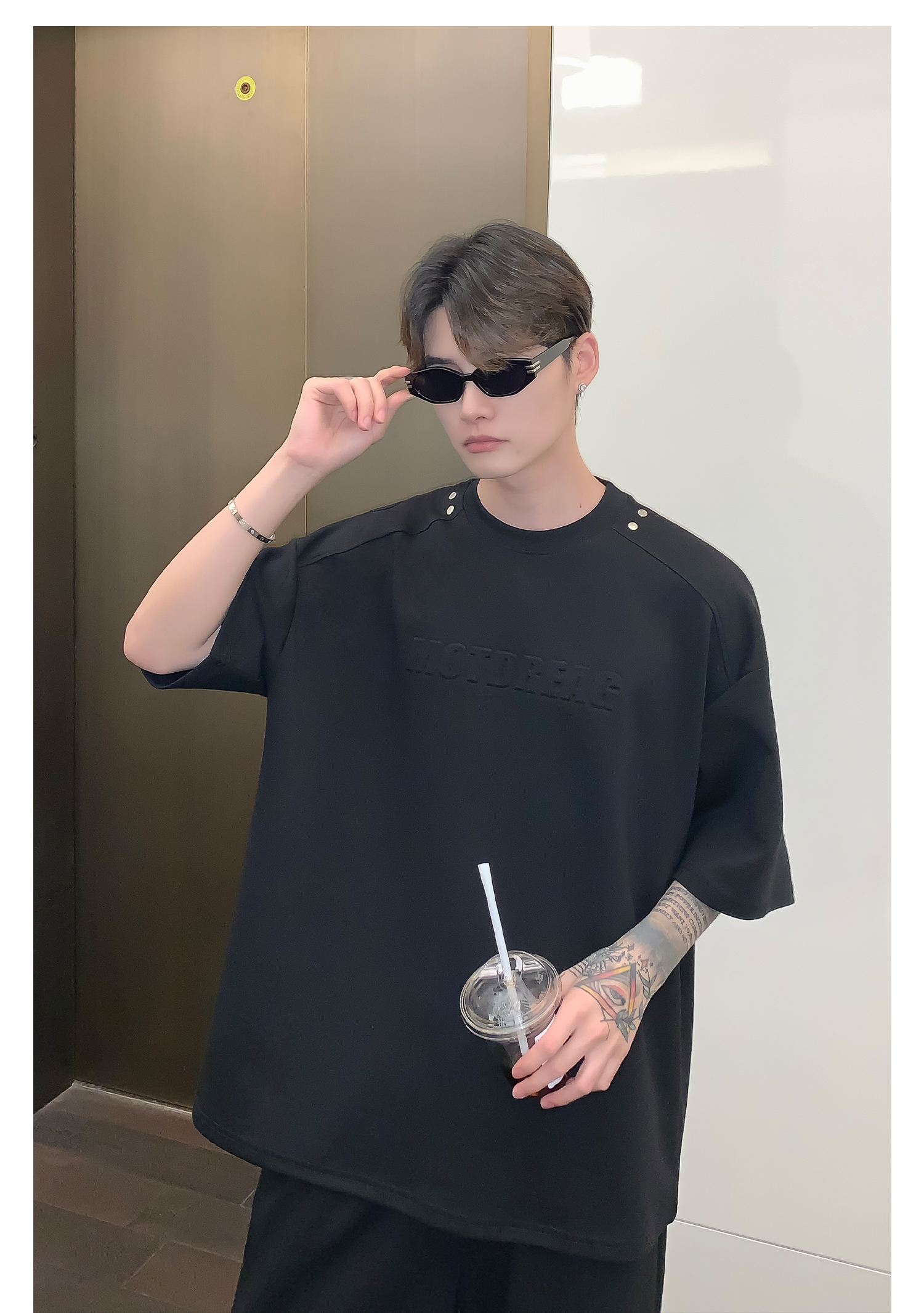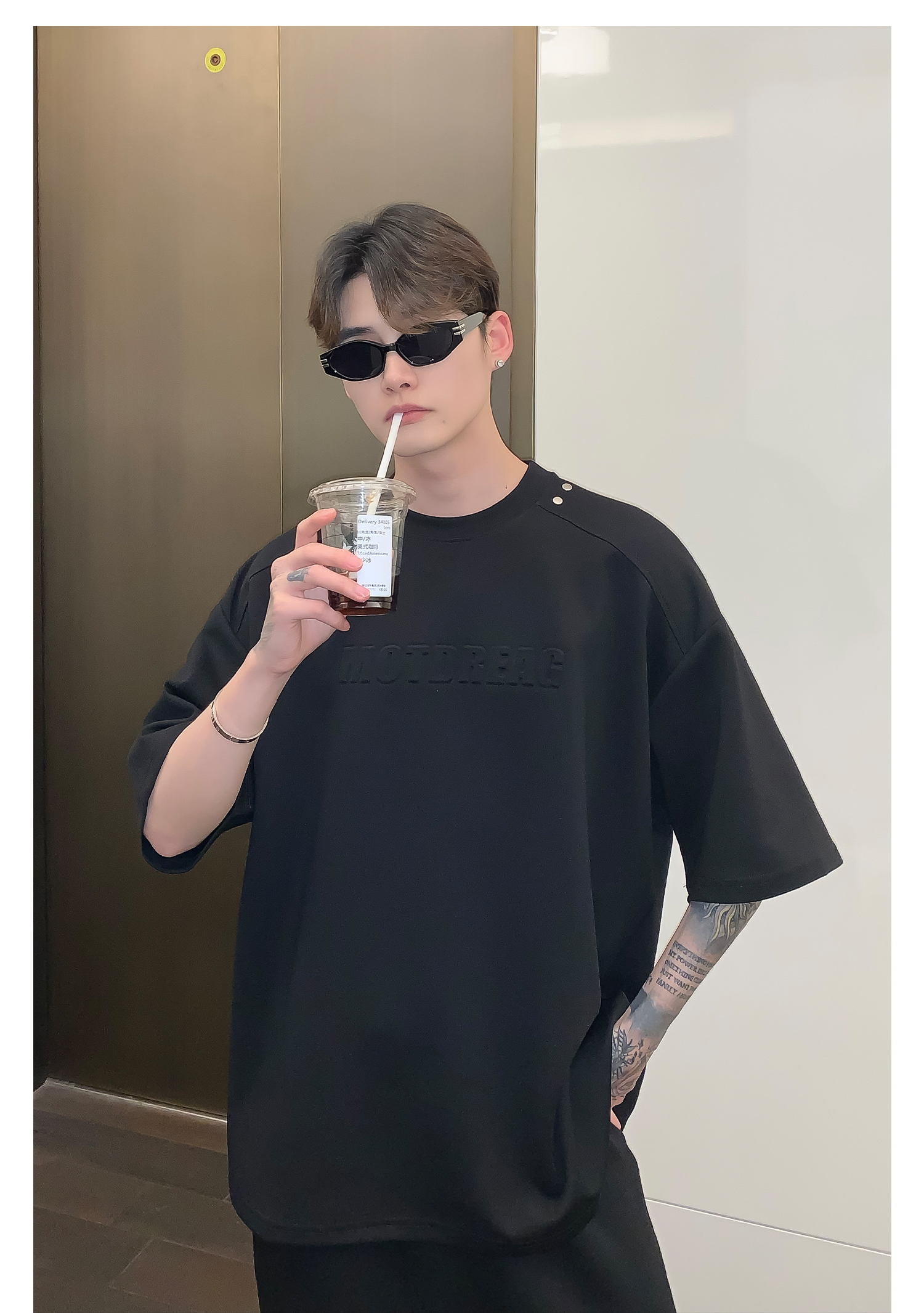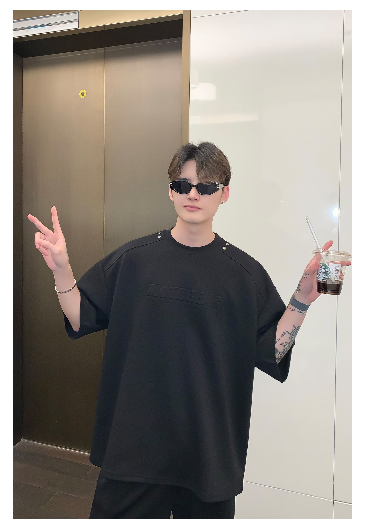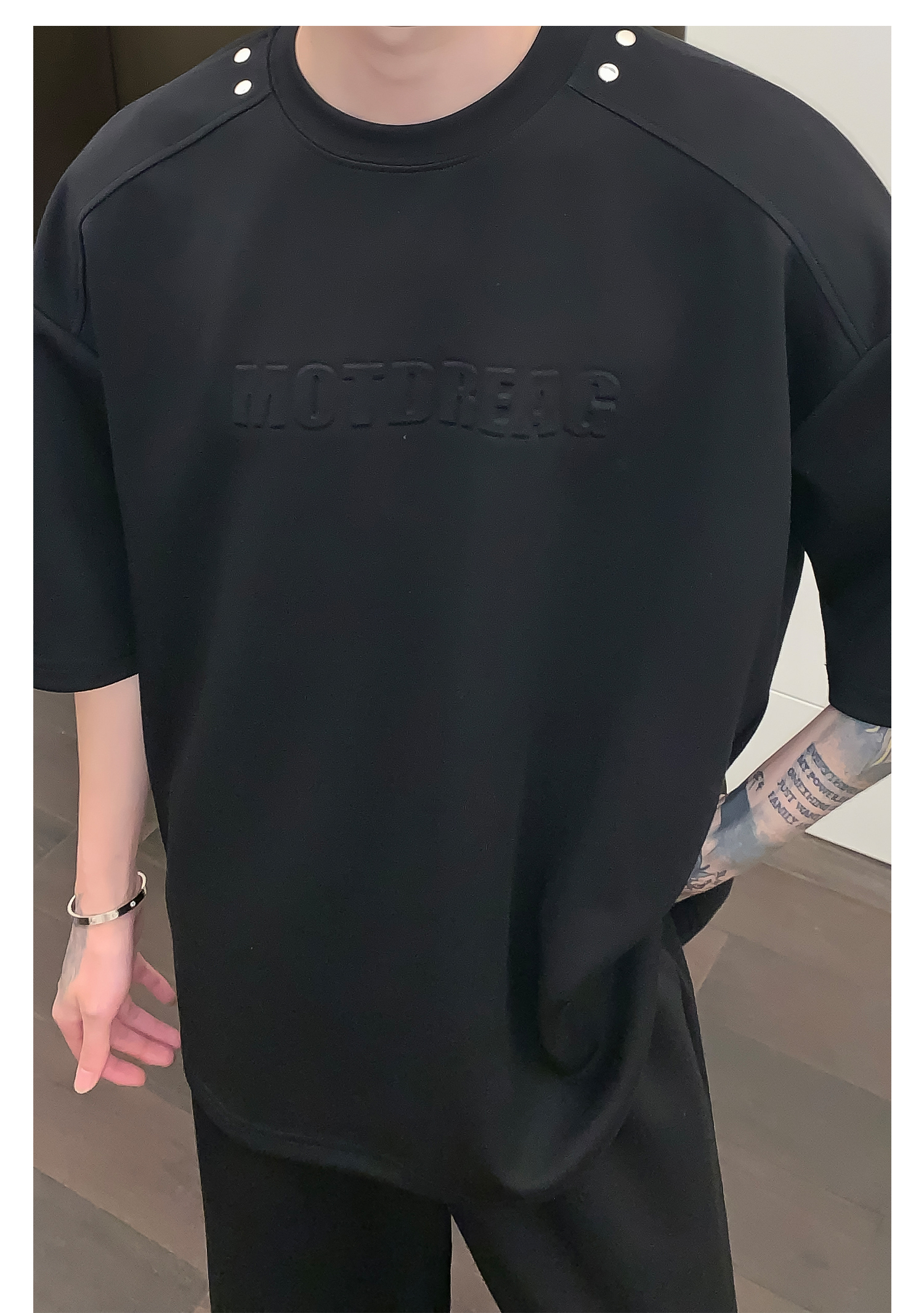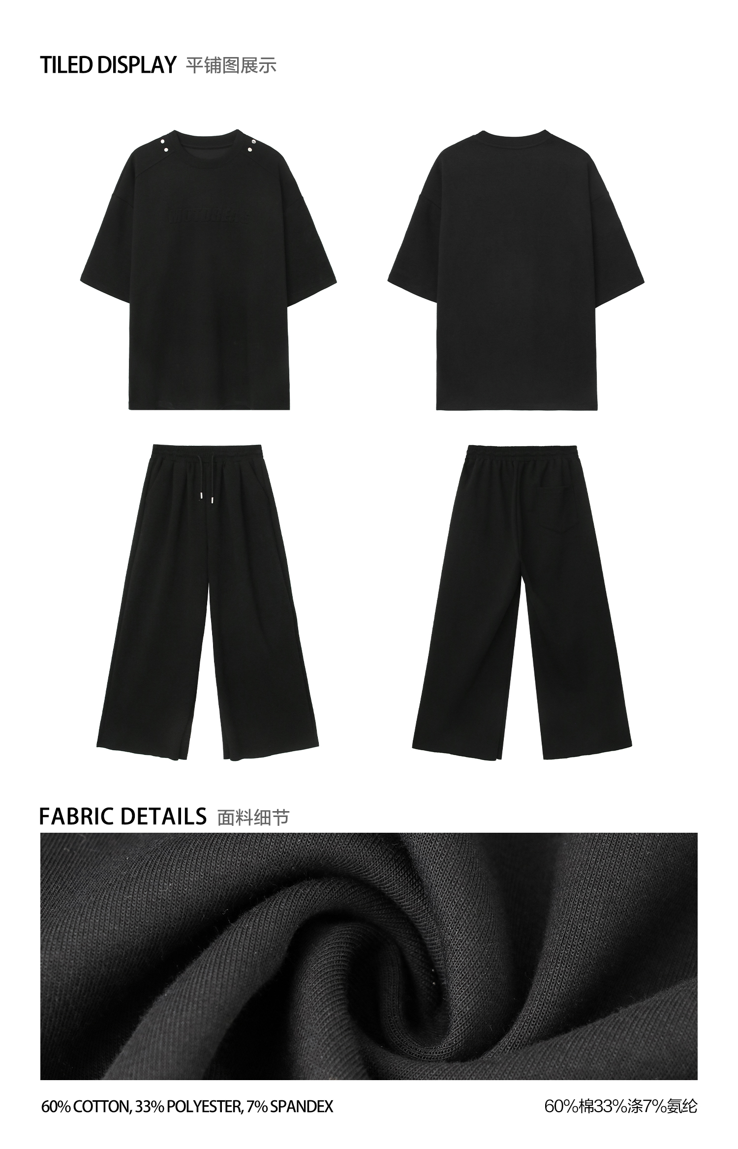 cuibuju 簡約小領口短袖男夏季立體字母休閒套裝百搭直筒長褲一套