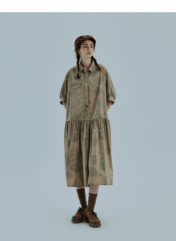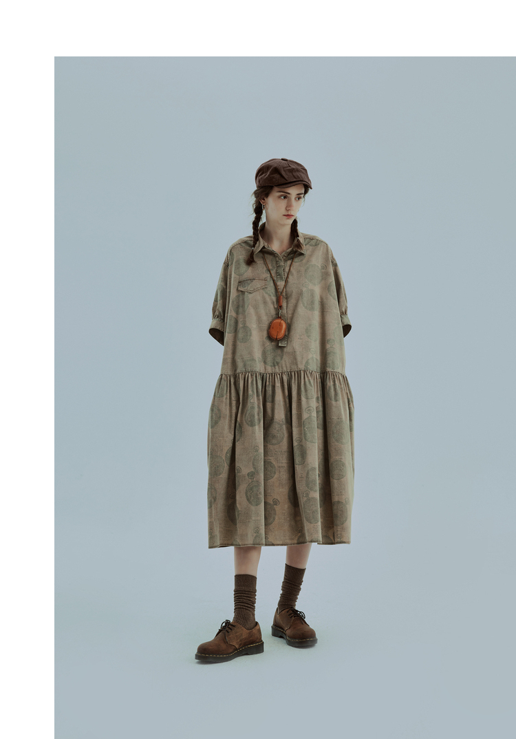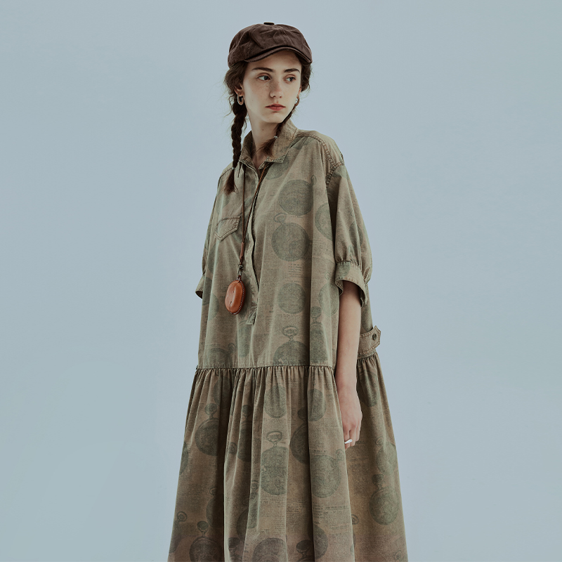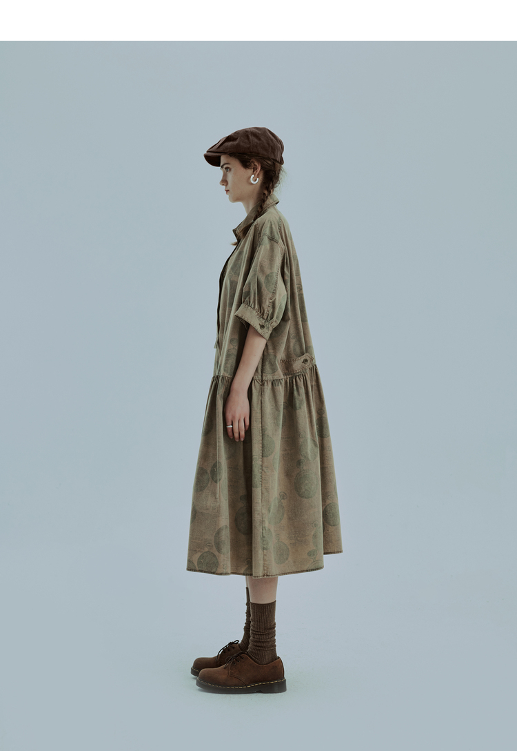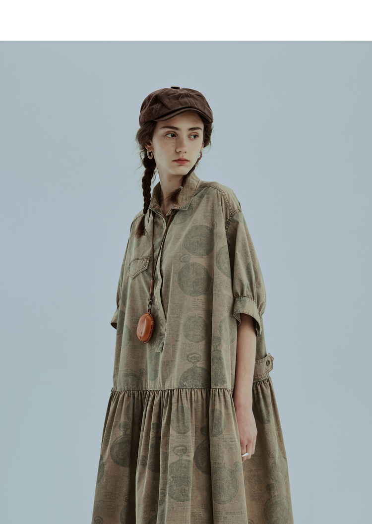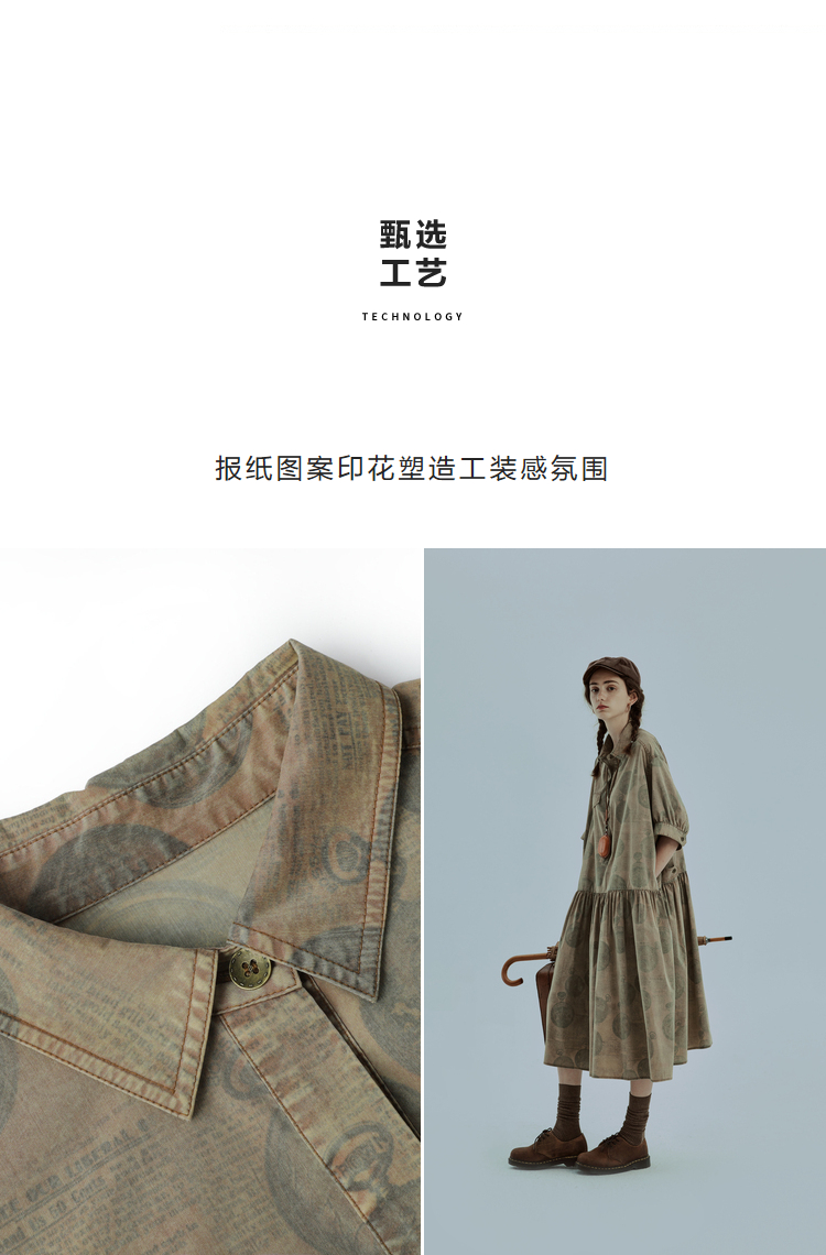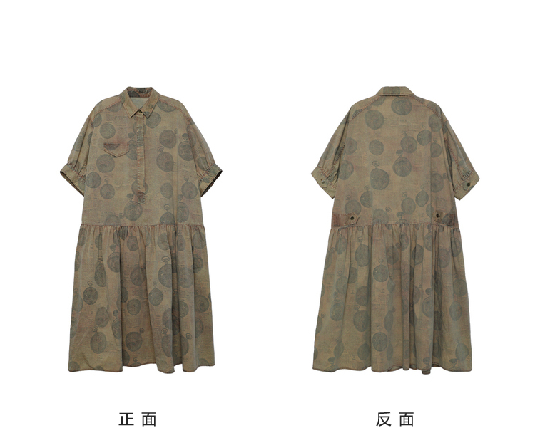 成衣染色半圓原創設計2023夏季新款半開門襟洋裝圖案印花工裝感