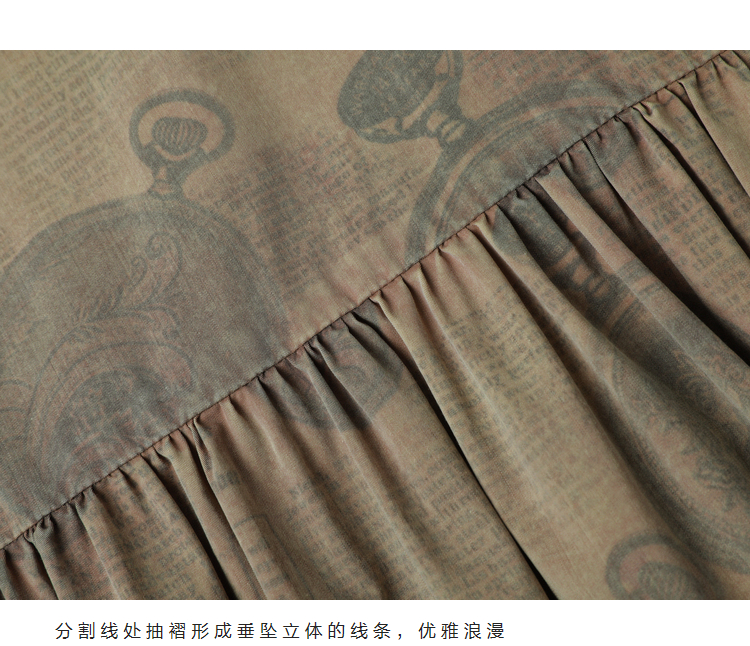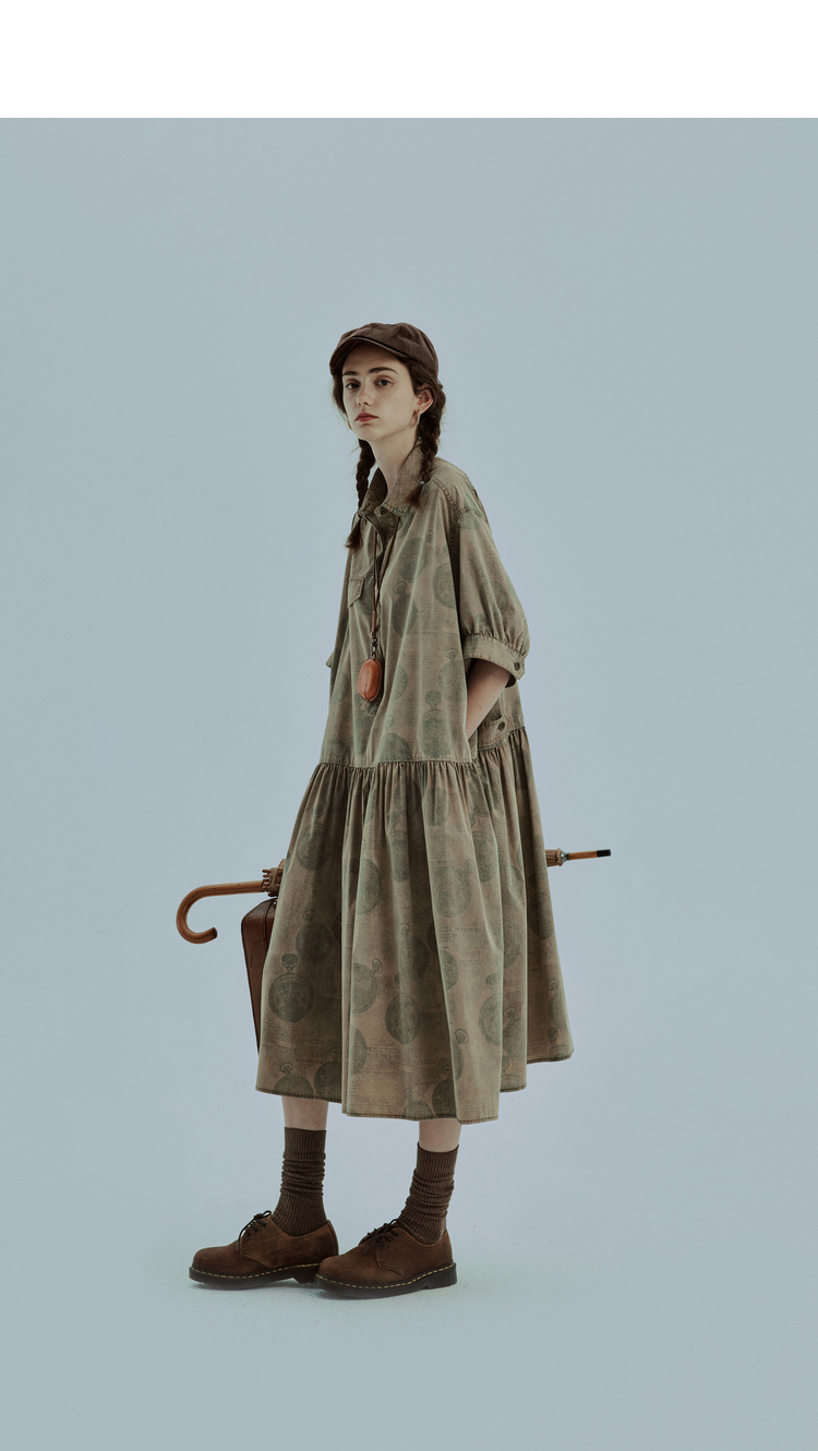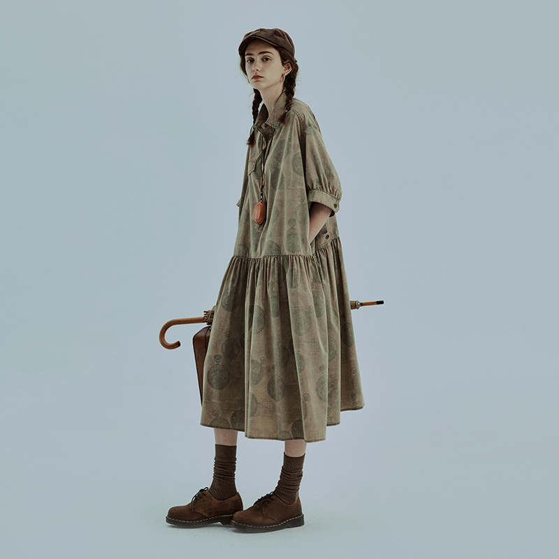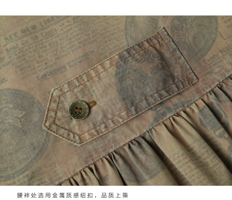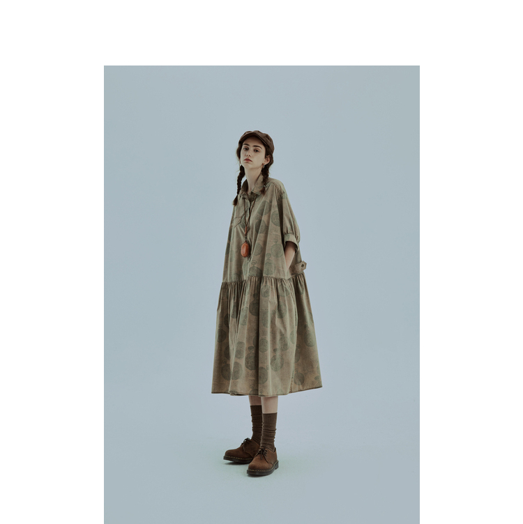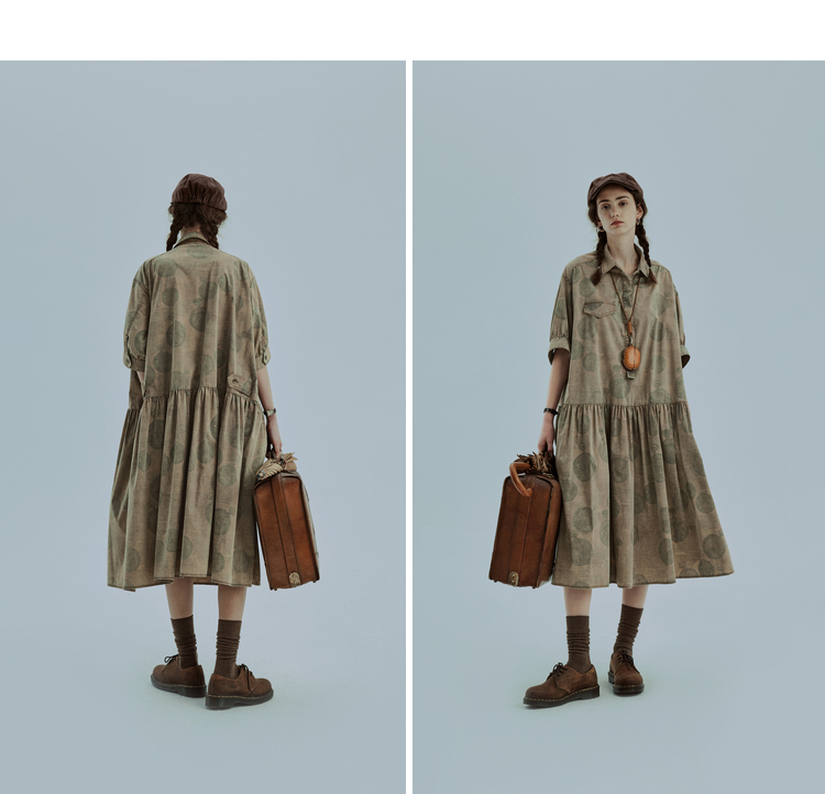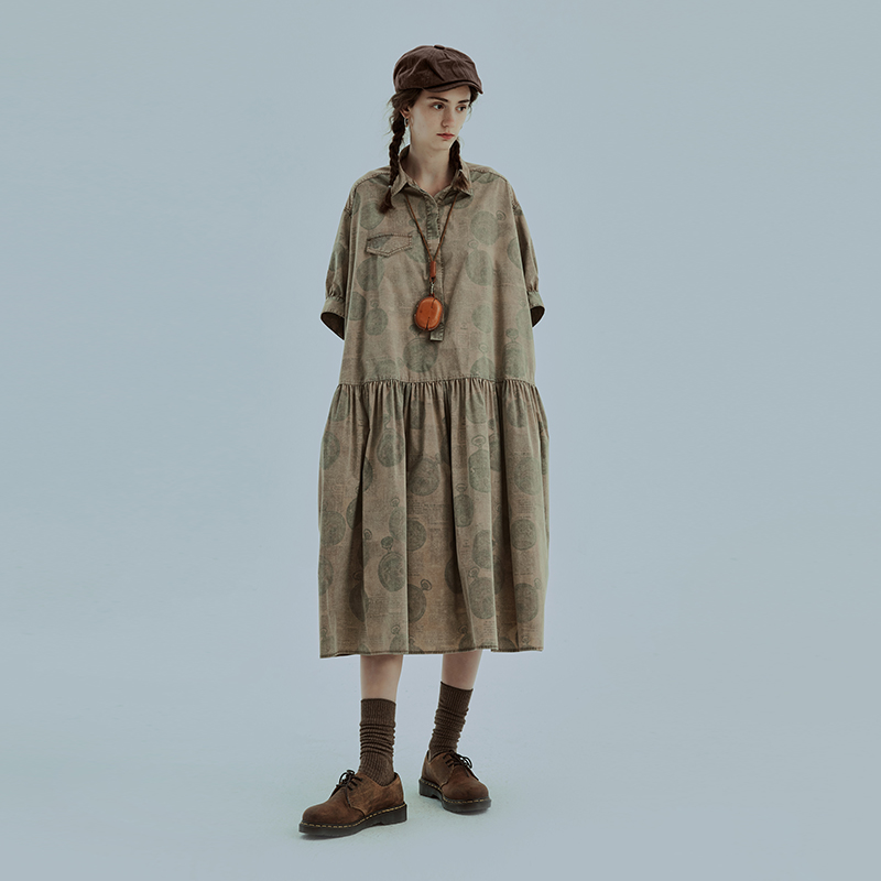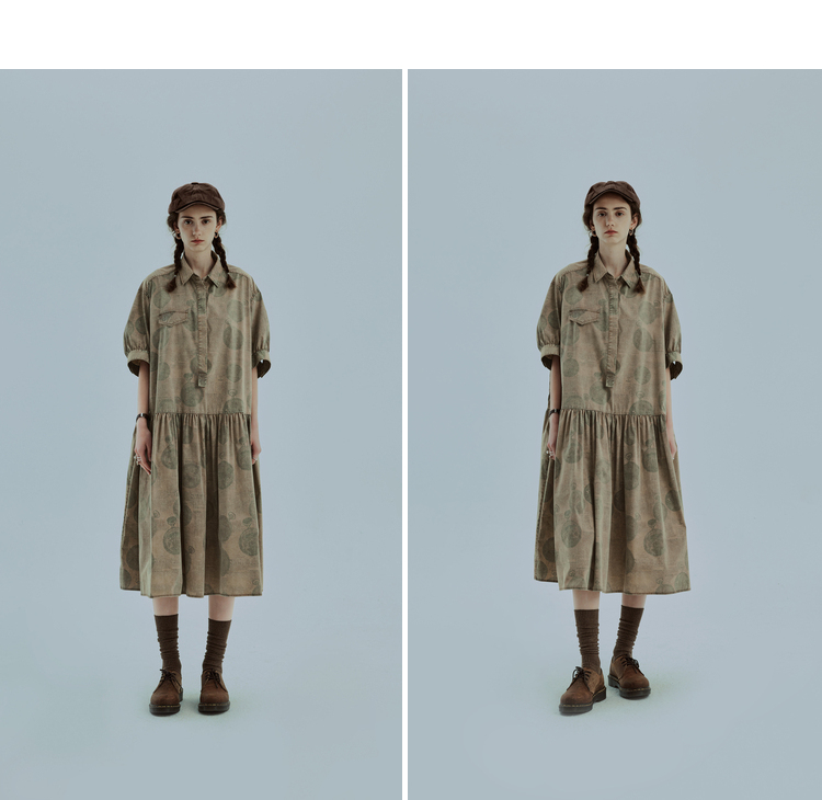 成衣染色半圓原創設計2023夏季新款半開門襟洋裝圖案印花工裝感