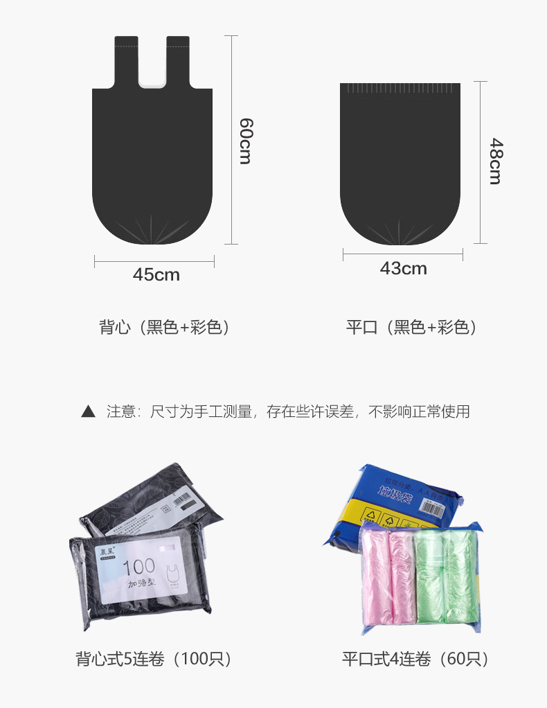 颜色 黑色/背心式5连卷/100只,彩色/背心式5连卷/100只,黑色/平口式5连卷/100只,紫色/平口式5连卷/100只,黄色/平口式5连卷/100只,蓝色/平口式5连卷/100只,粉色/平口式5连卷/100只,绿色/平口式5连卷/100只,彩色/平口式5连卷/100只,黑色/平口式4连卷/60只,彩色/平口式4连卷/60只