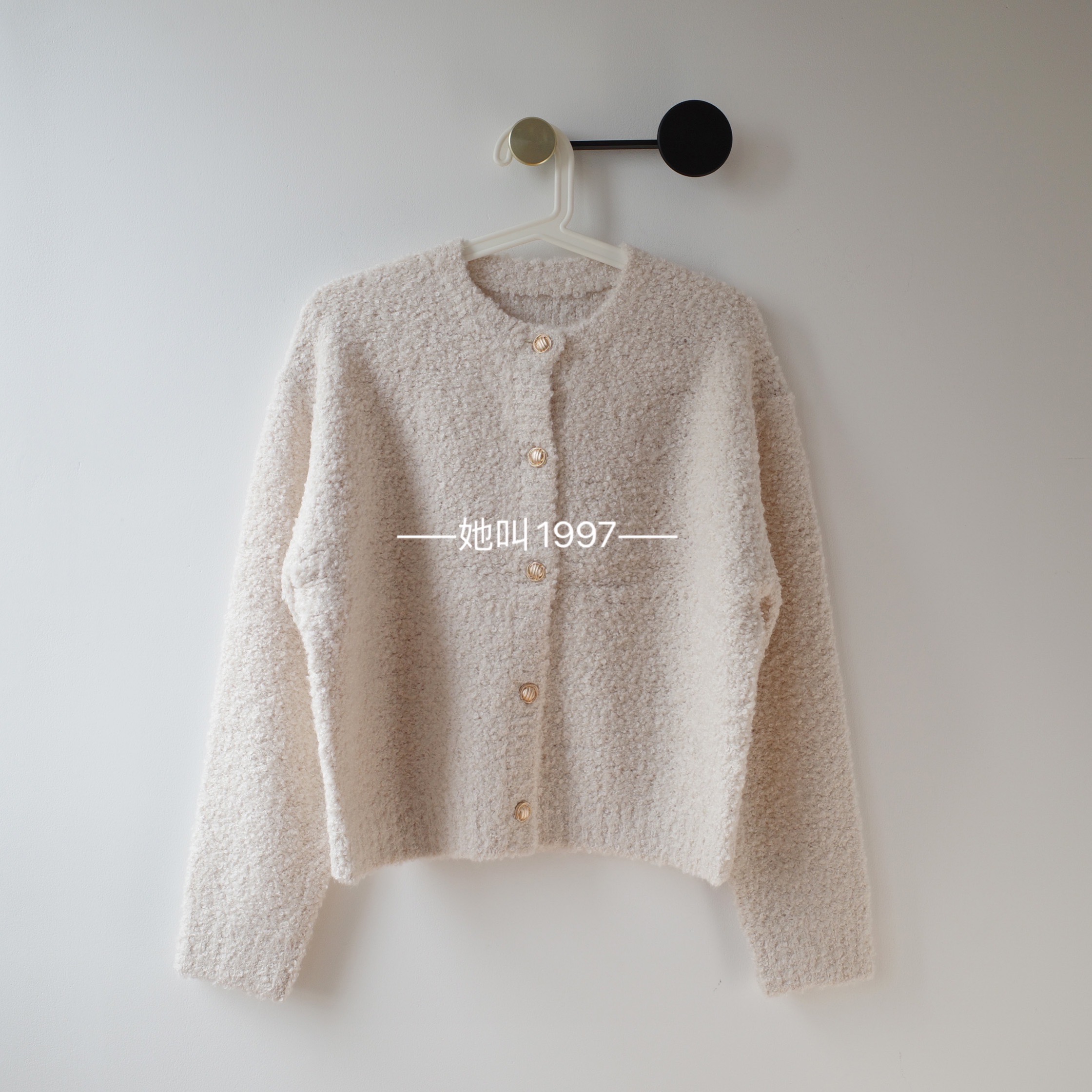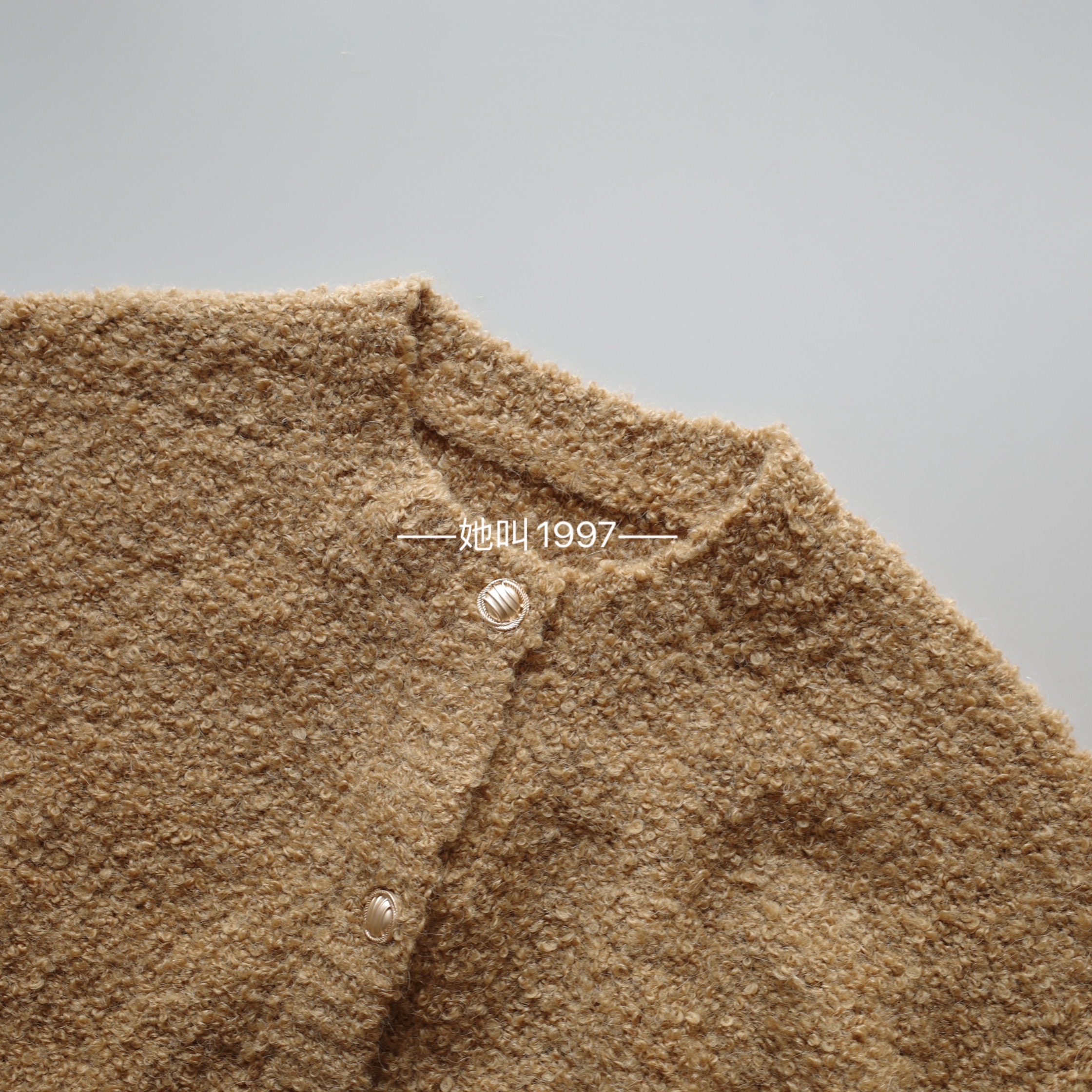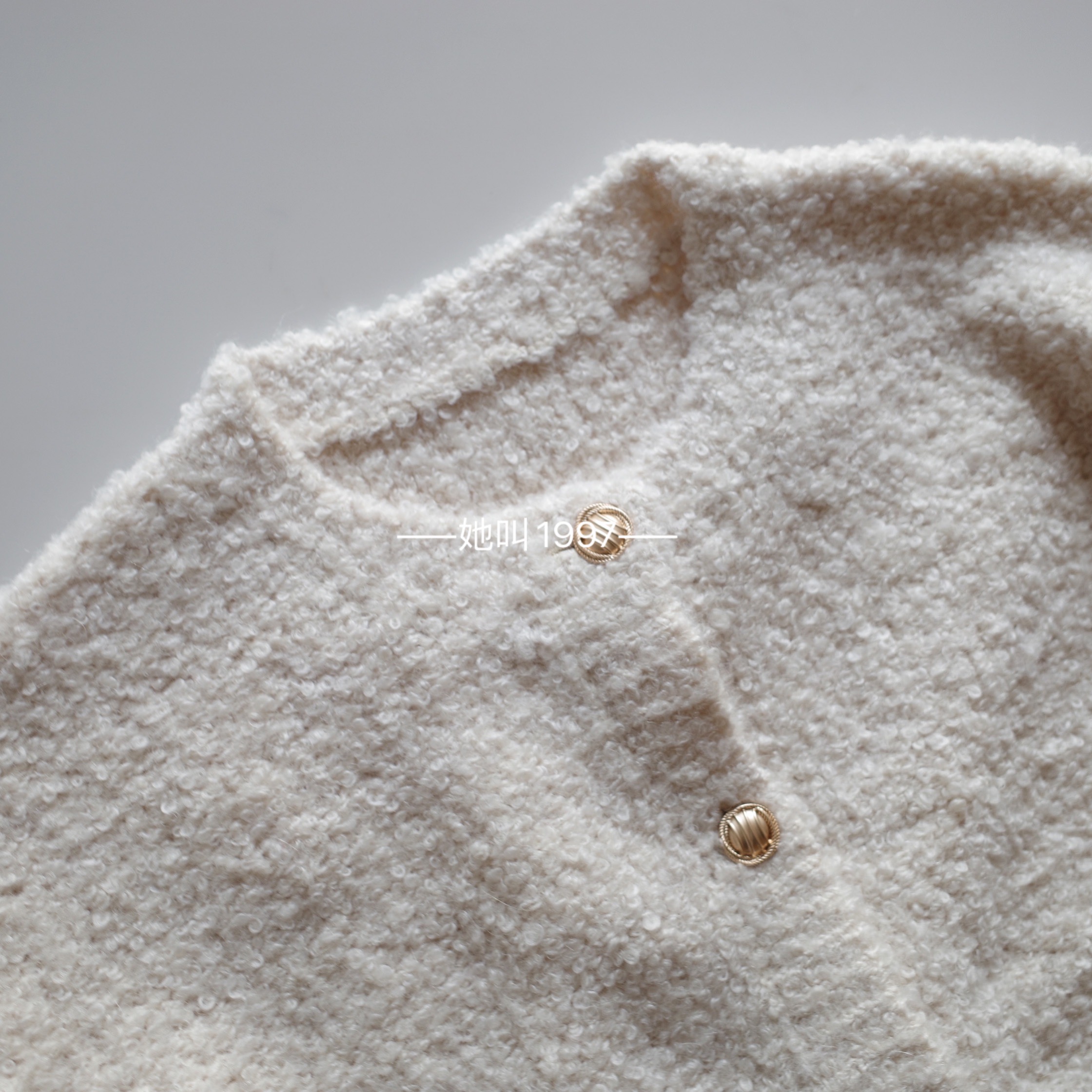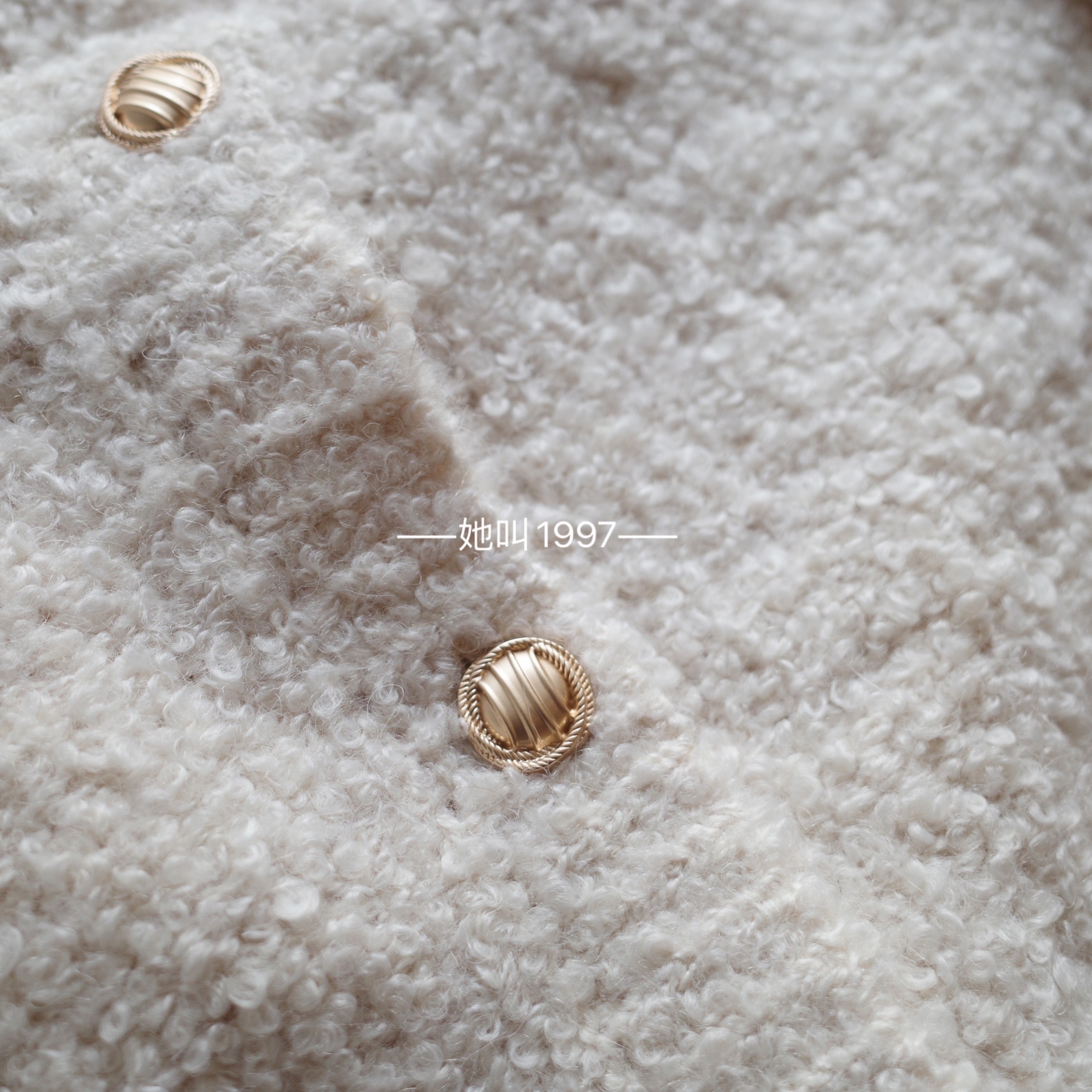 小眾~羊駝毛羊毛圈圈紗 浮雕玫瑰金扣 寬鬆開衫外套 綿密顆粒感