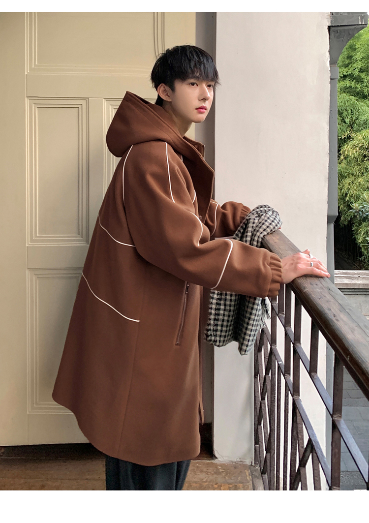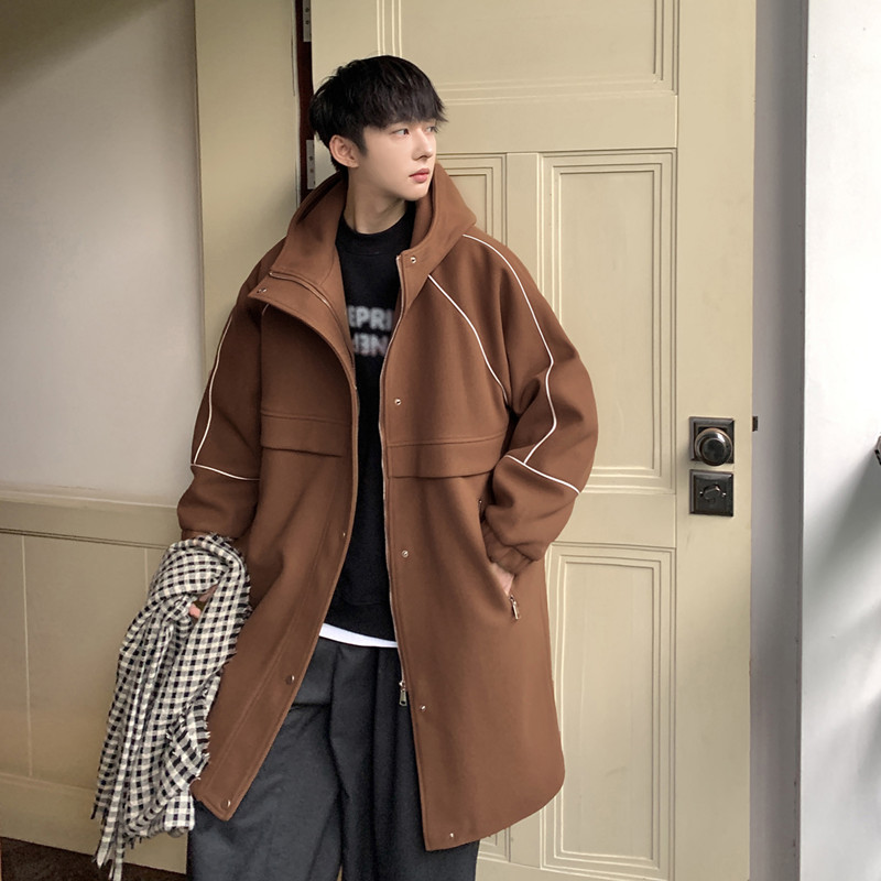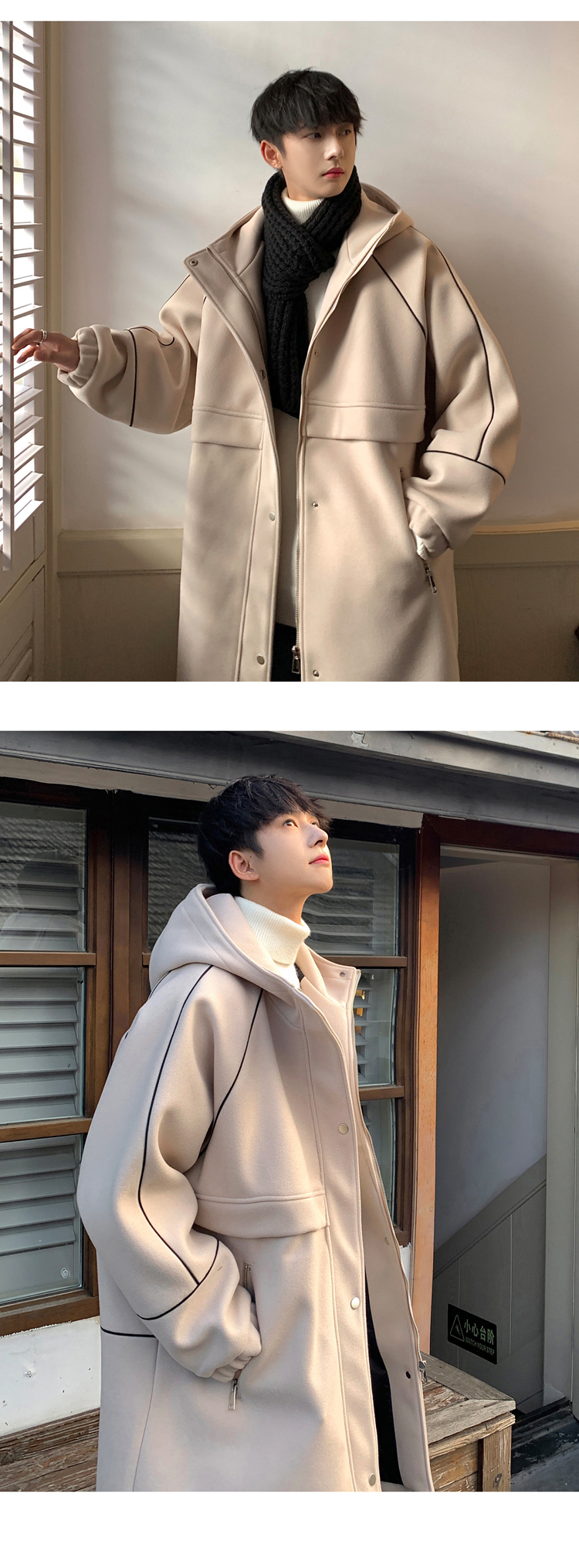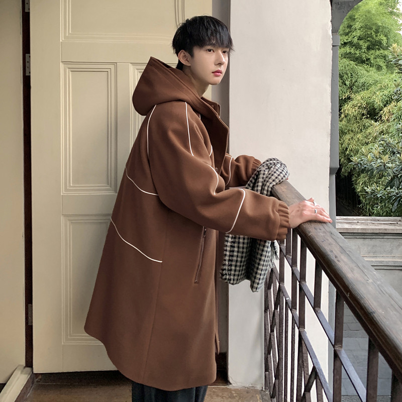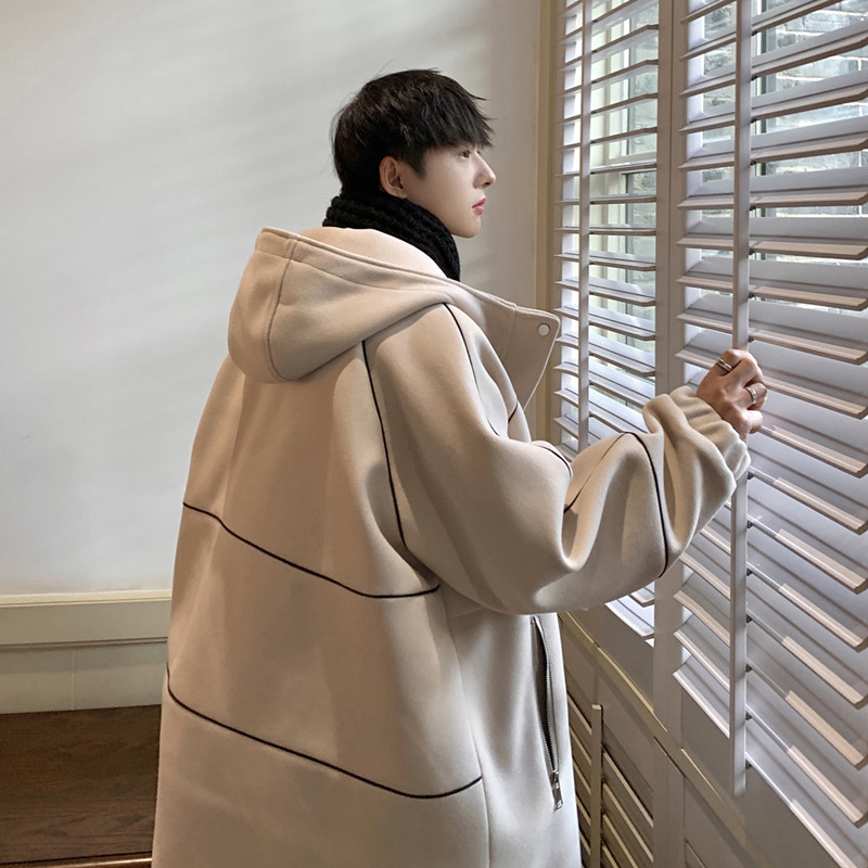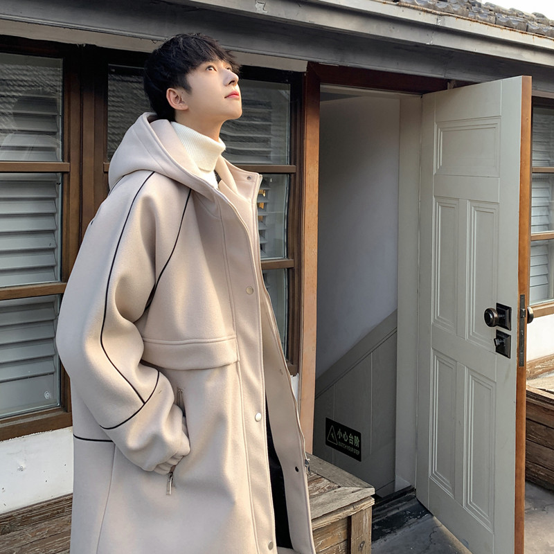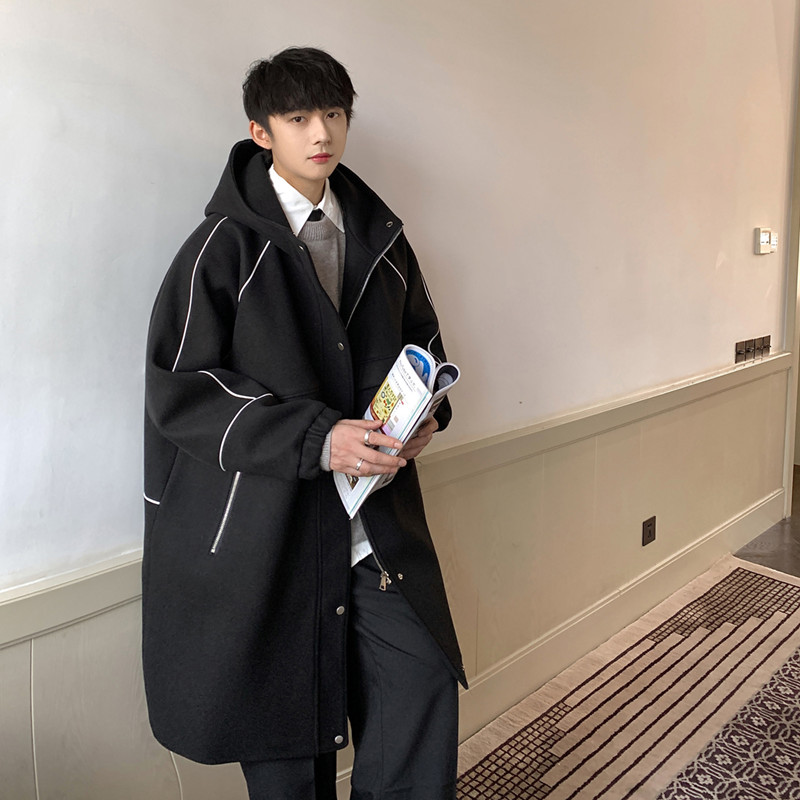 毛呢大衣高級感男生韓系情侶痞帥連帽呢子外套春秋加厚中長版風衣
