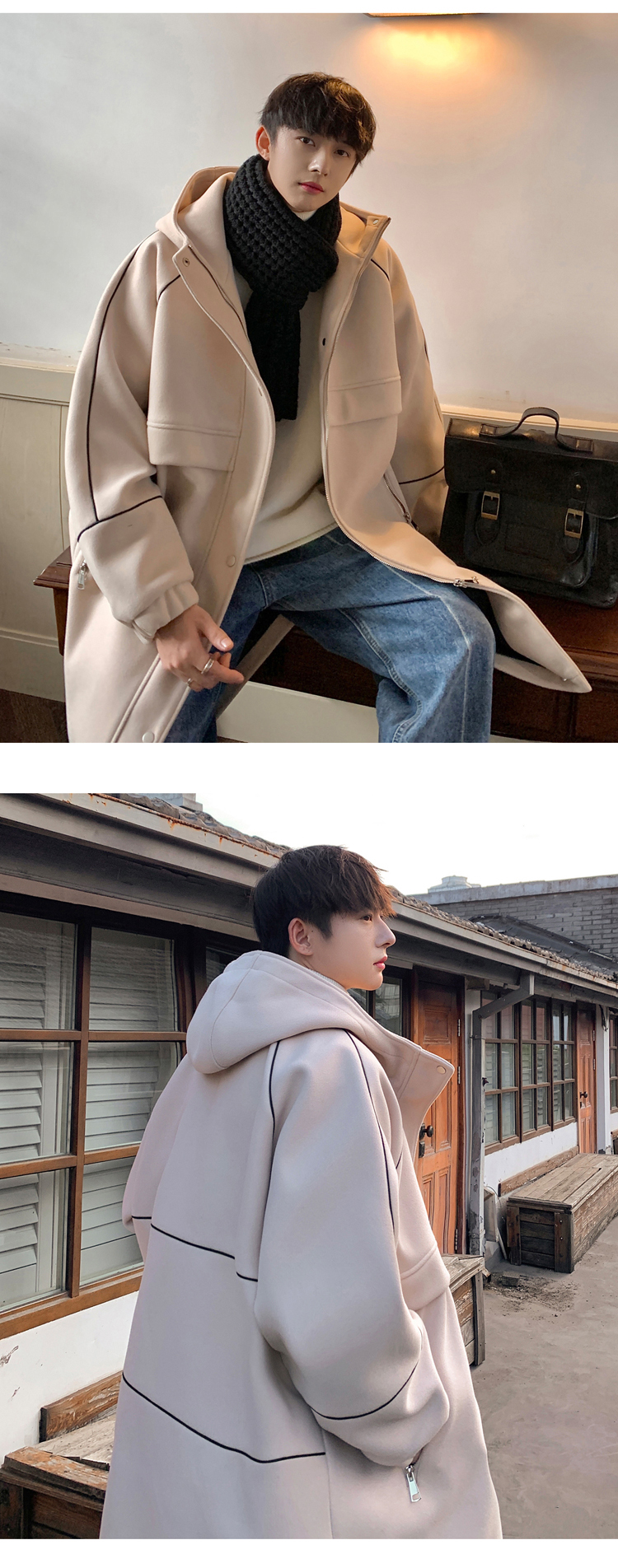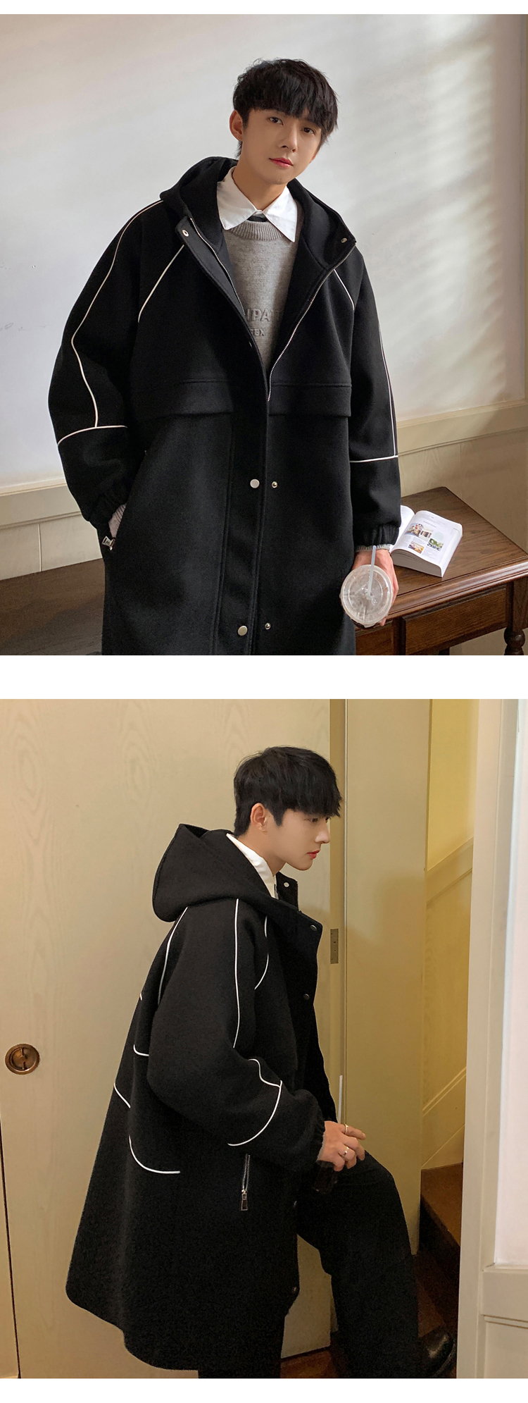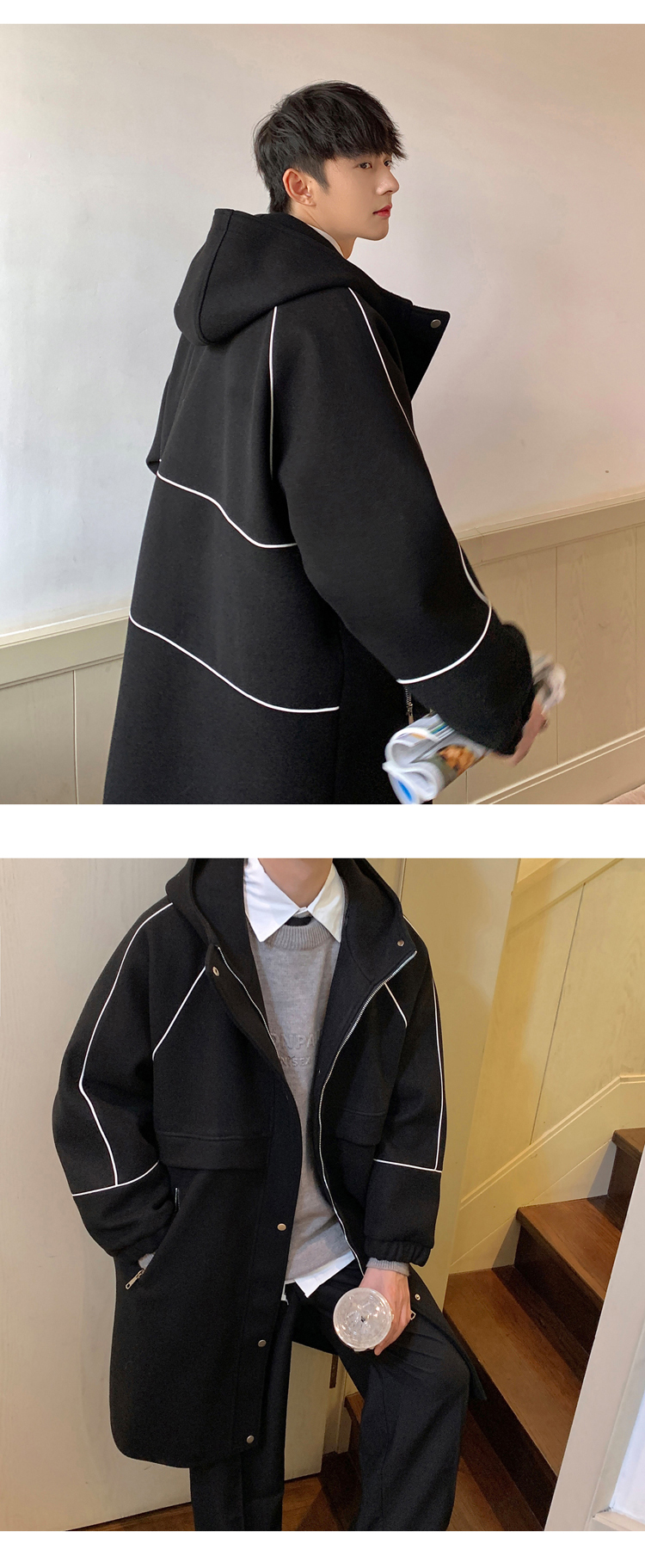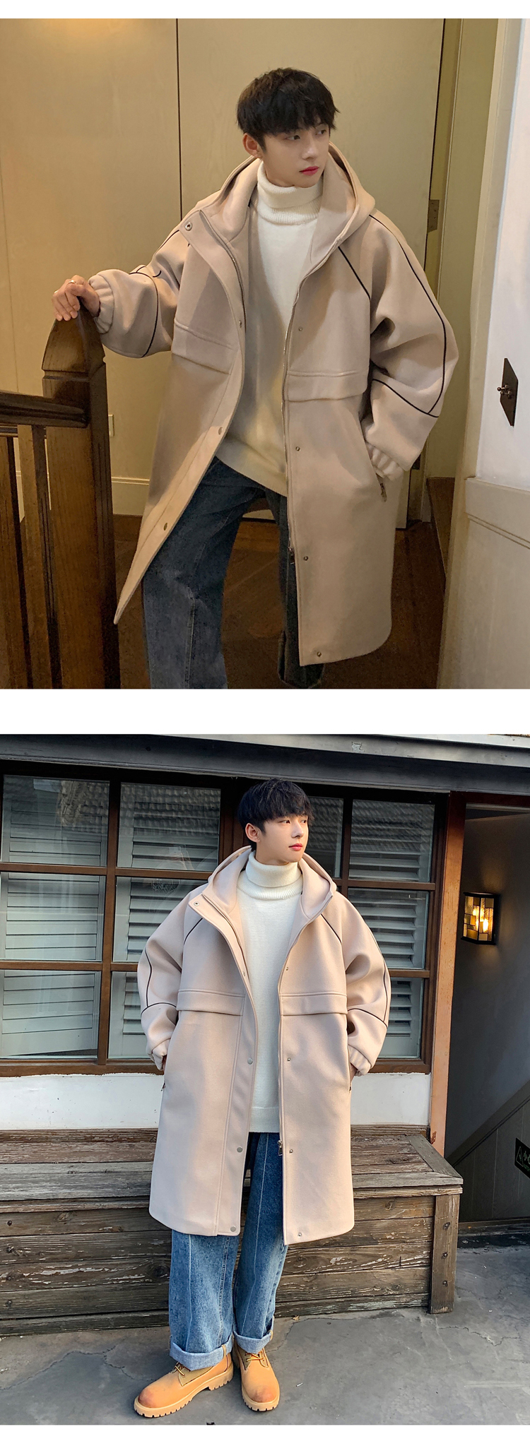 毛呢大衣高級感男生韓系情侶痞帥連帽呢子外套春秋加厚中長版風衣
