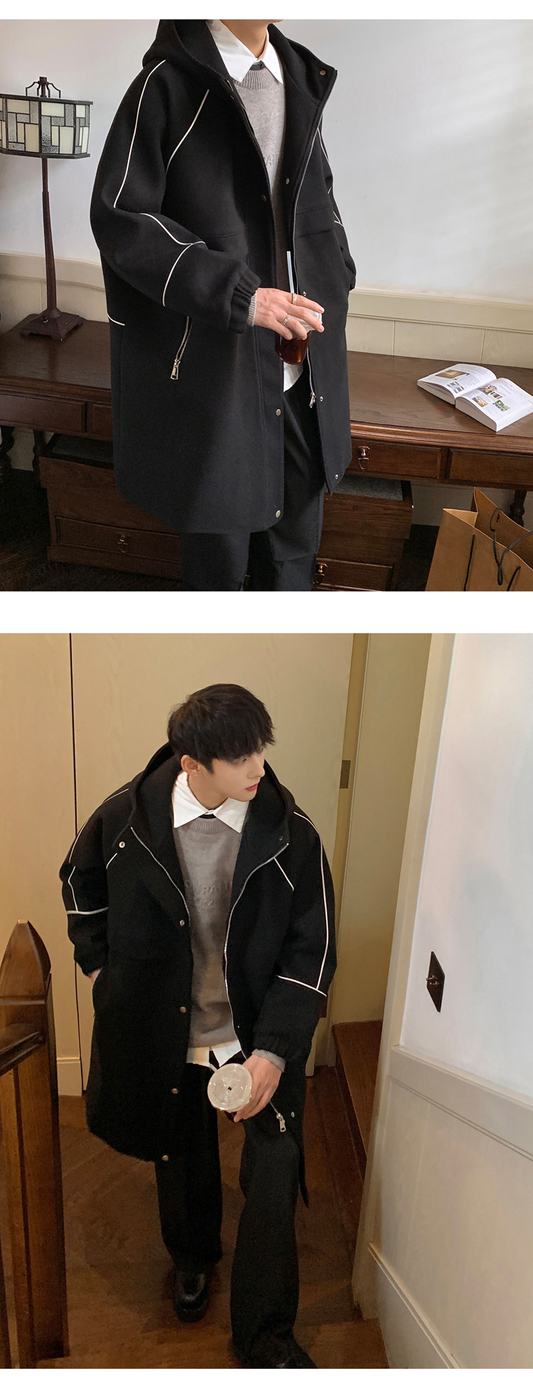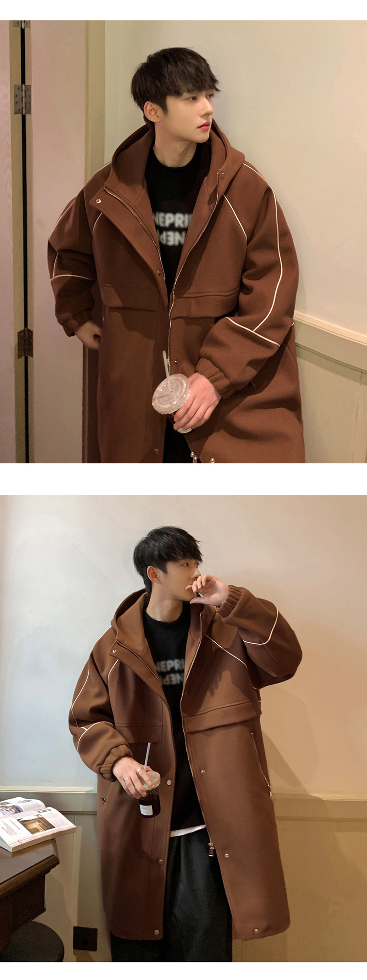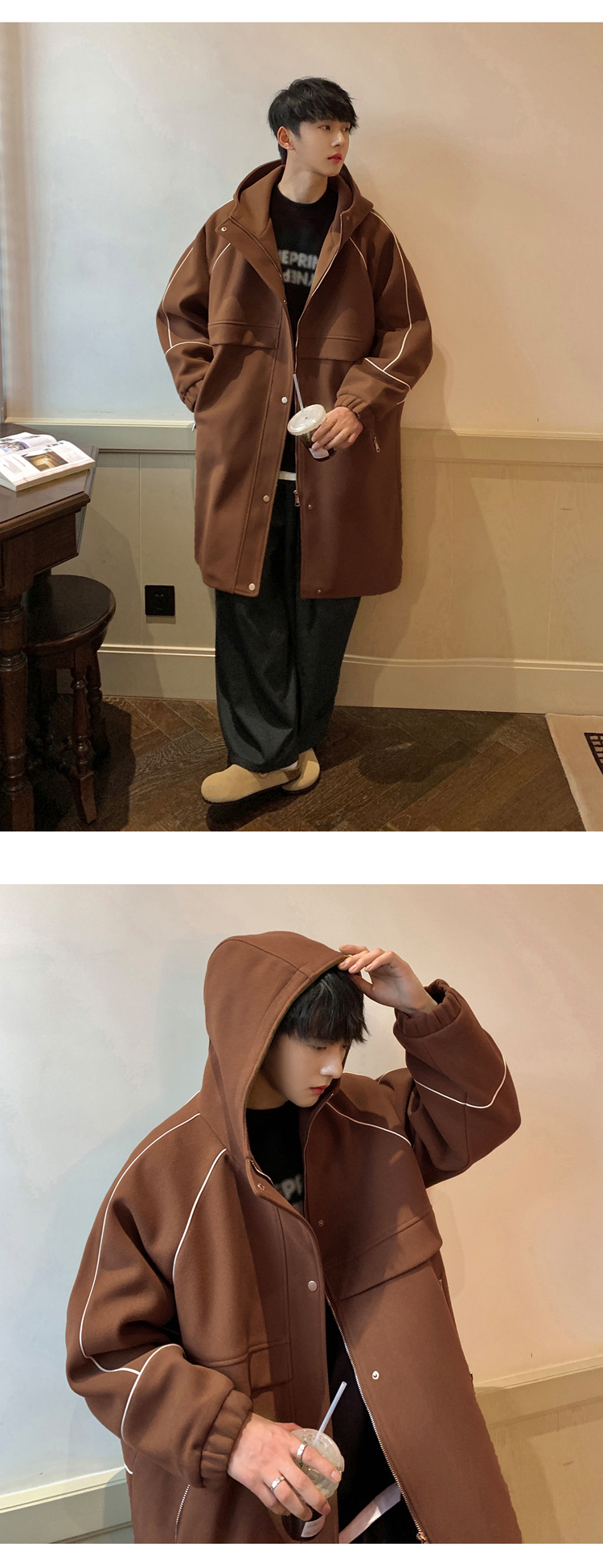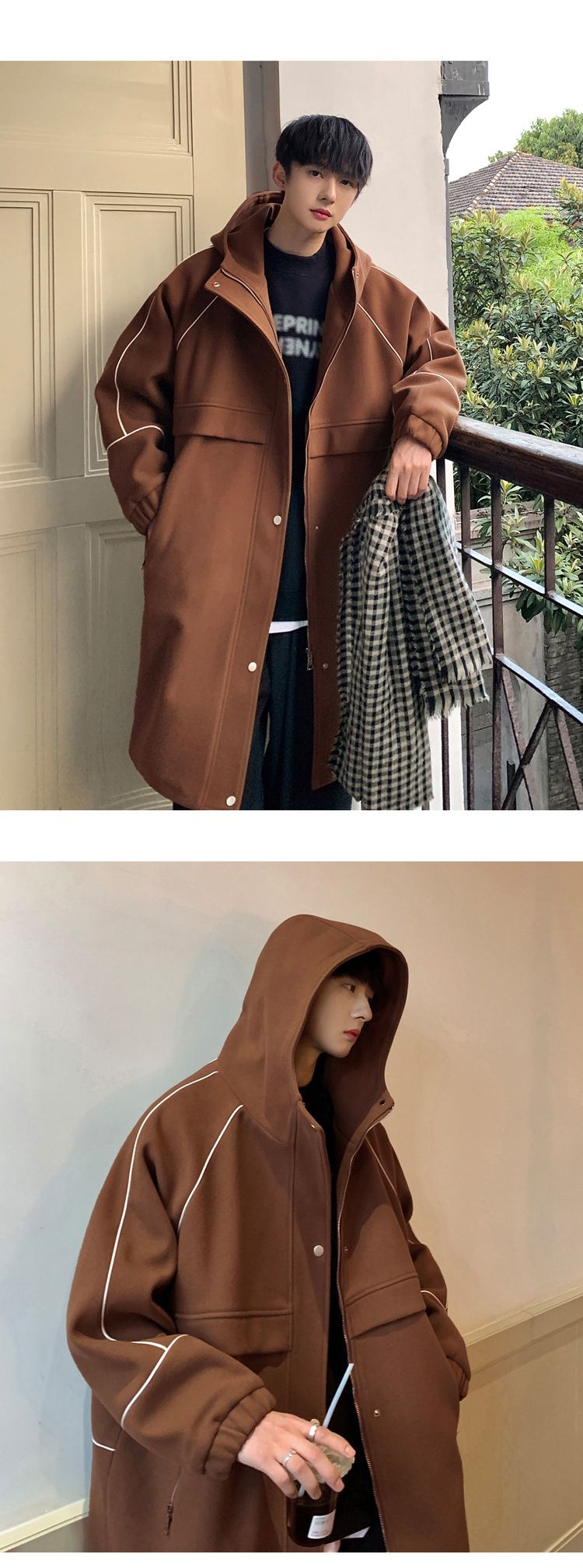 毛呢大衣高級感男生韓系情侶痞帥連帽呢子外套春秋加厚中長版風衣