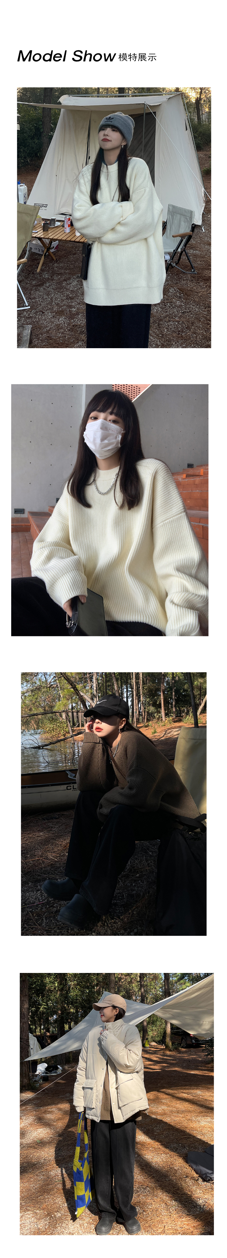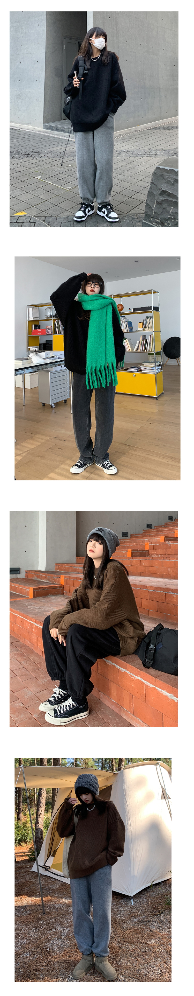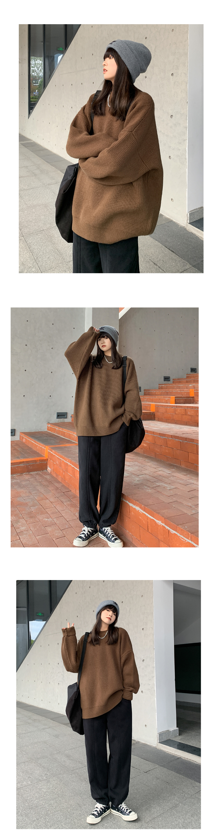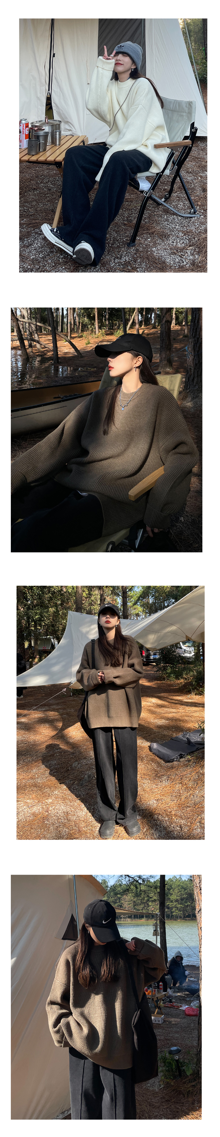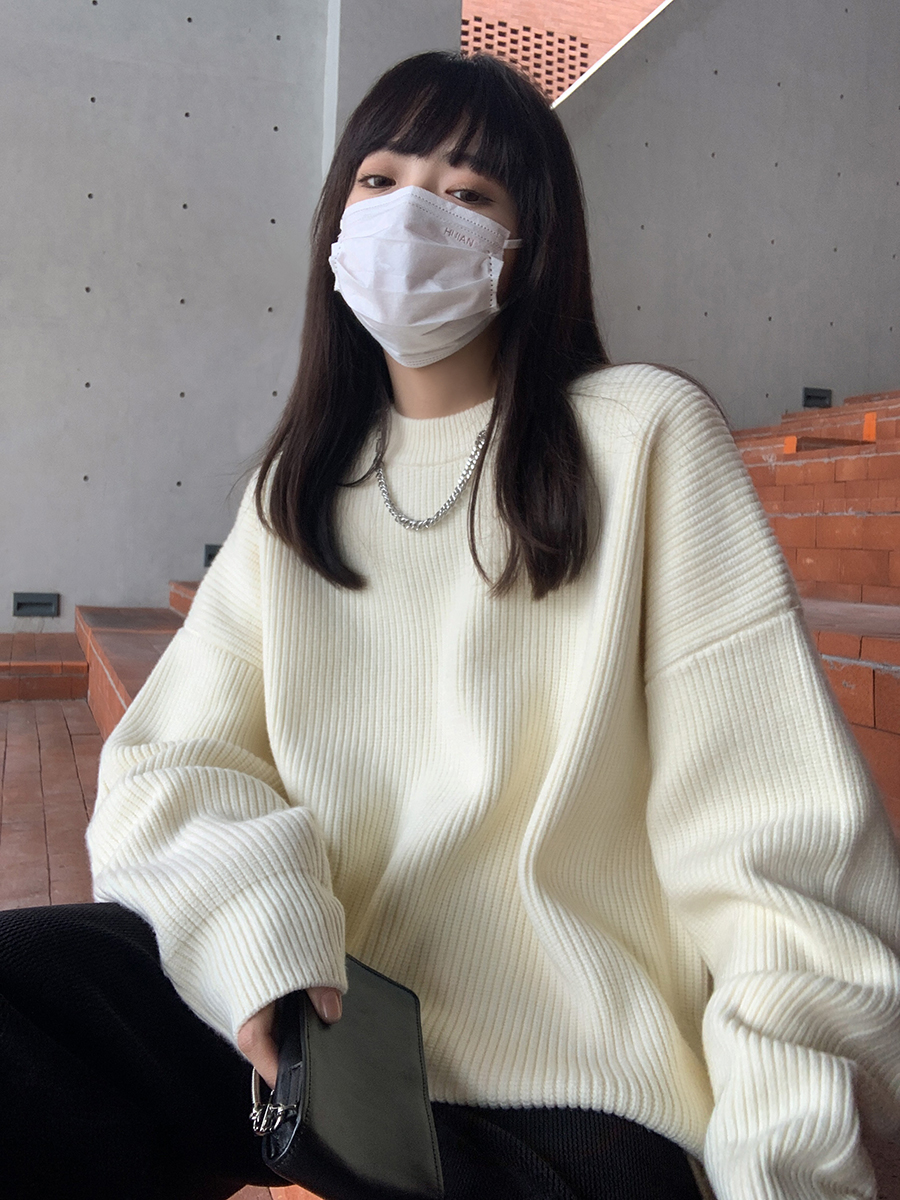 SIXI四喜家春秋 純色廓形圓領毛衣女寬鬆休閒慵懶風加厚針織外套