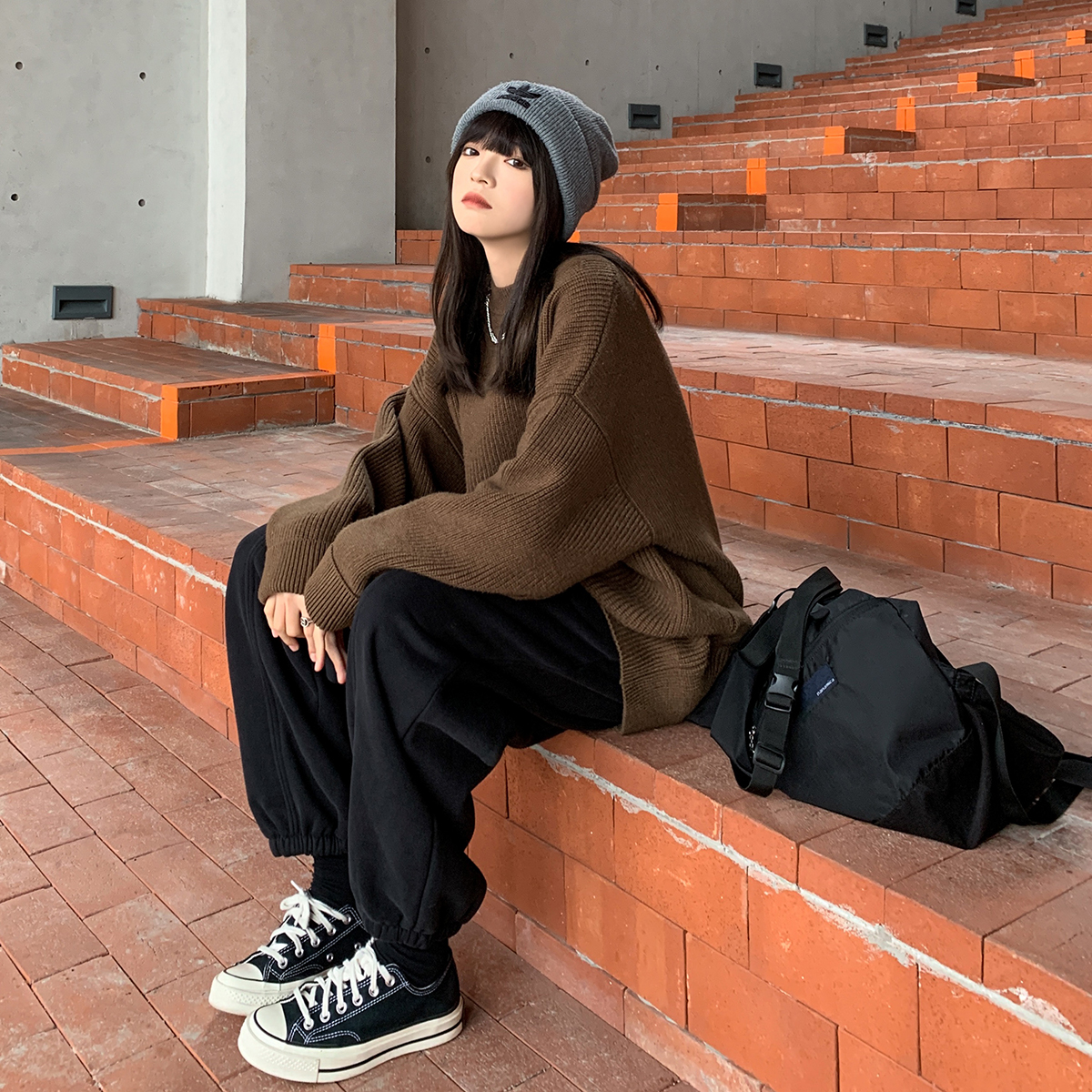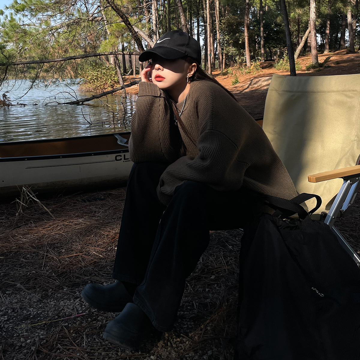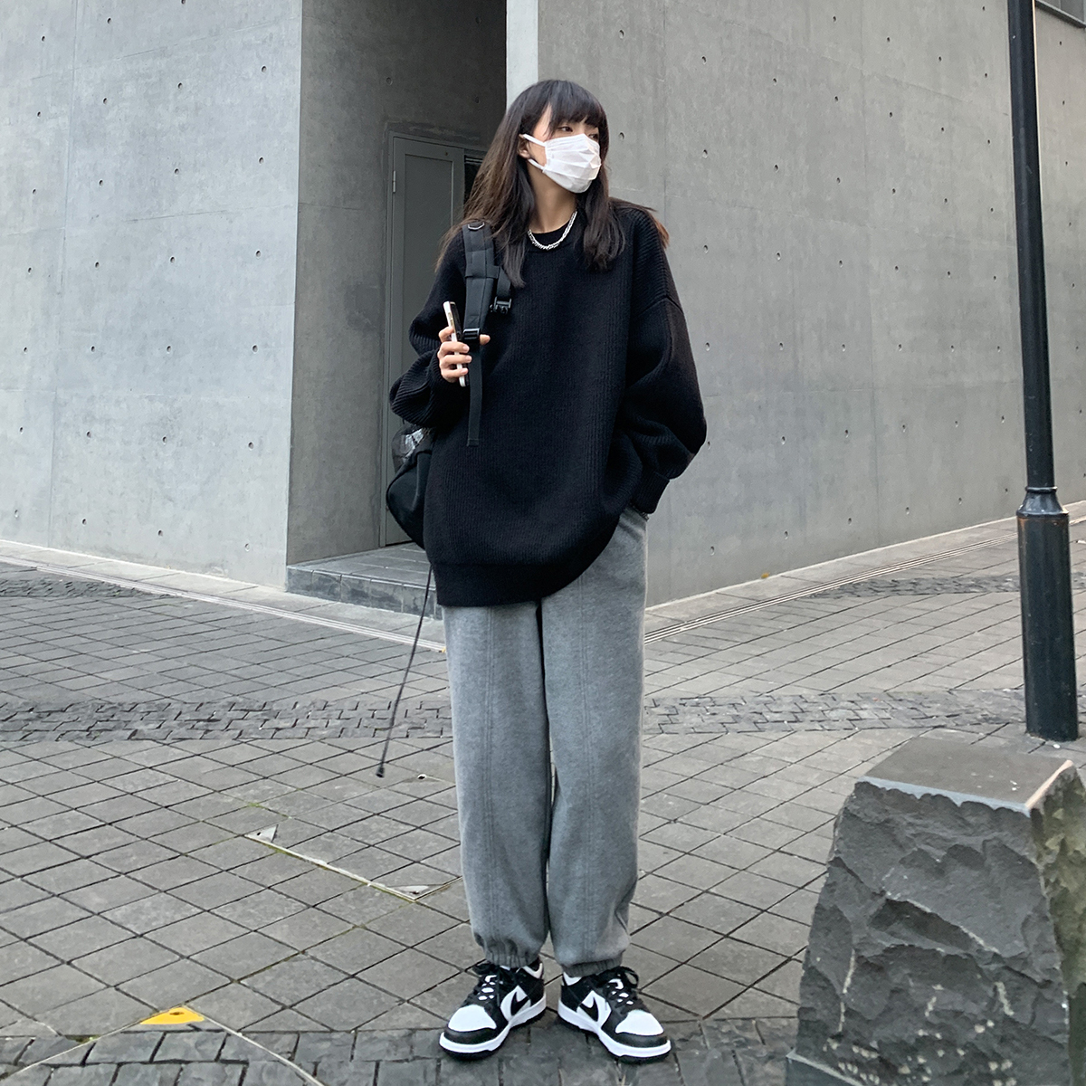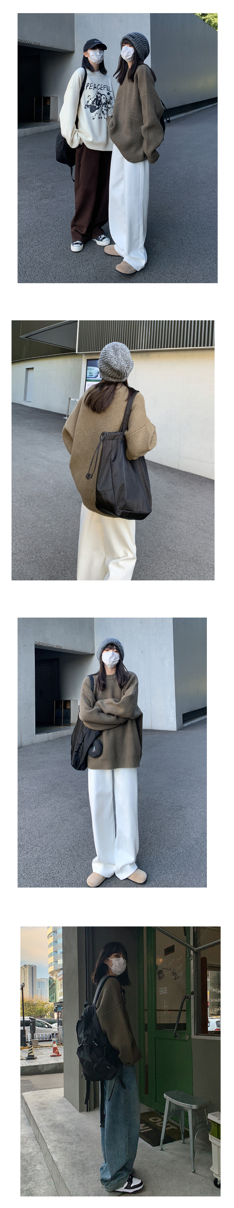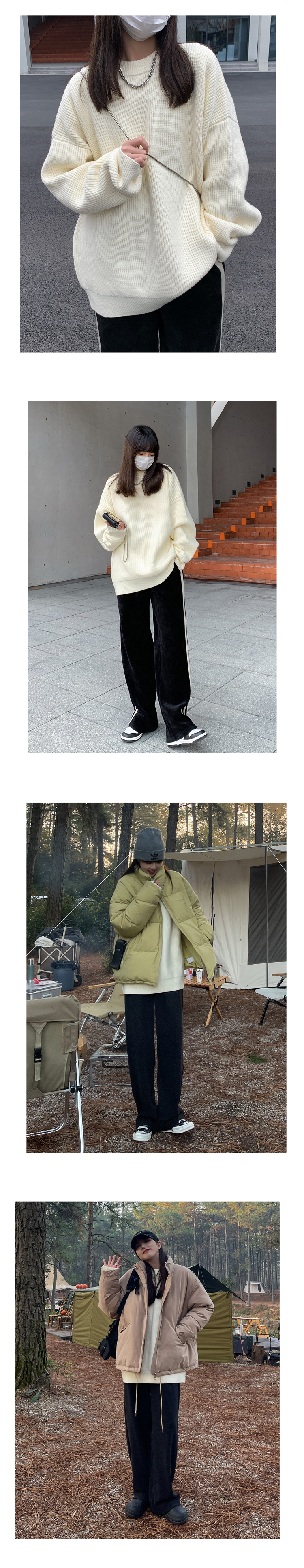 SIXI四喜家春秋 純色廓形圓領毛衣女寬鬆休閒慵懶風加厚針織外套