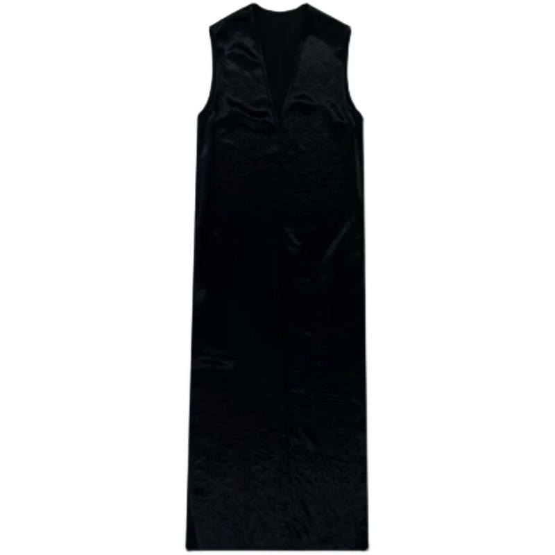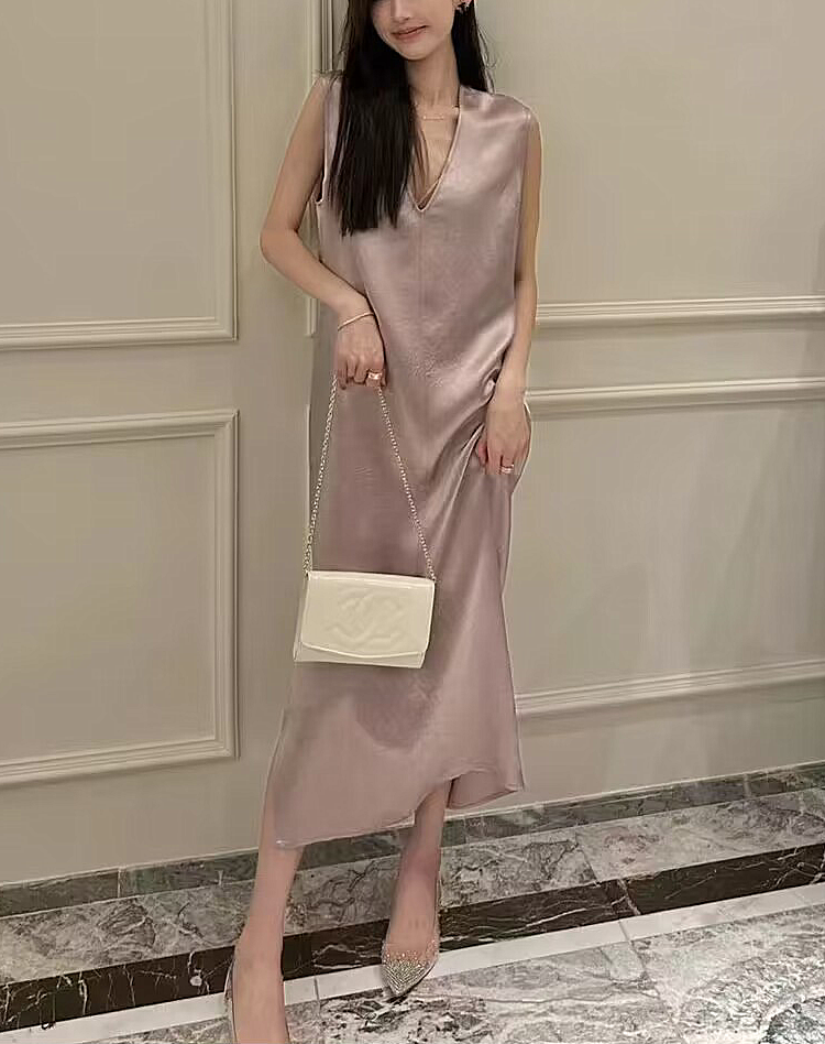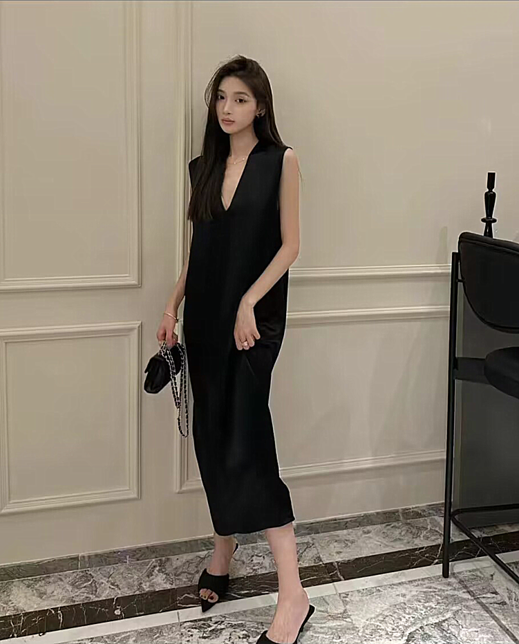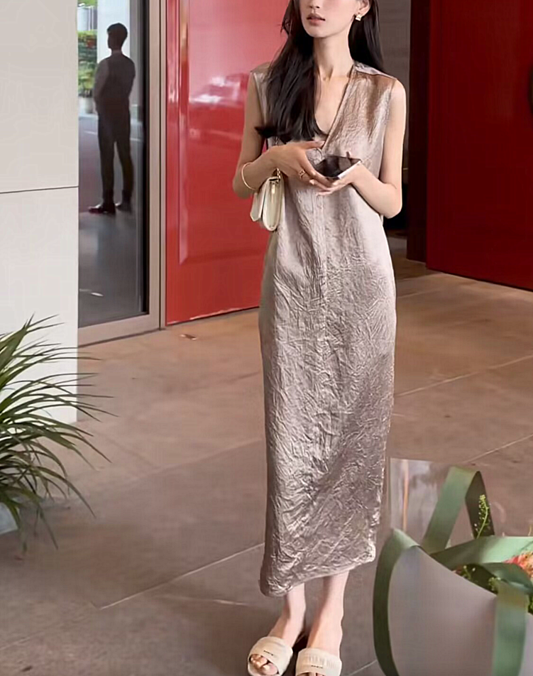 法式醋酸無袖洋裝女夏新款肌理感氣質寬鬆顯瘦V領長版背心裙子
