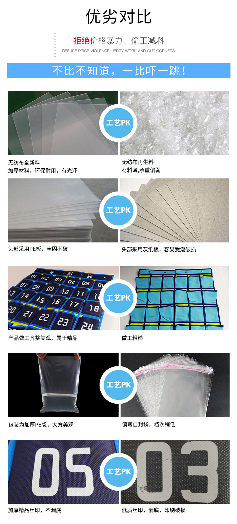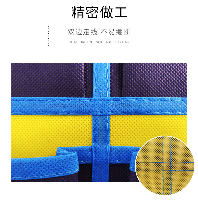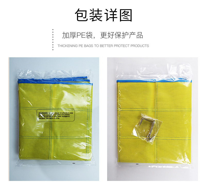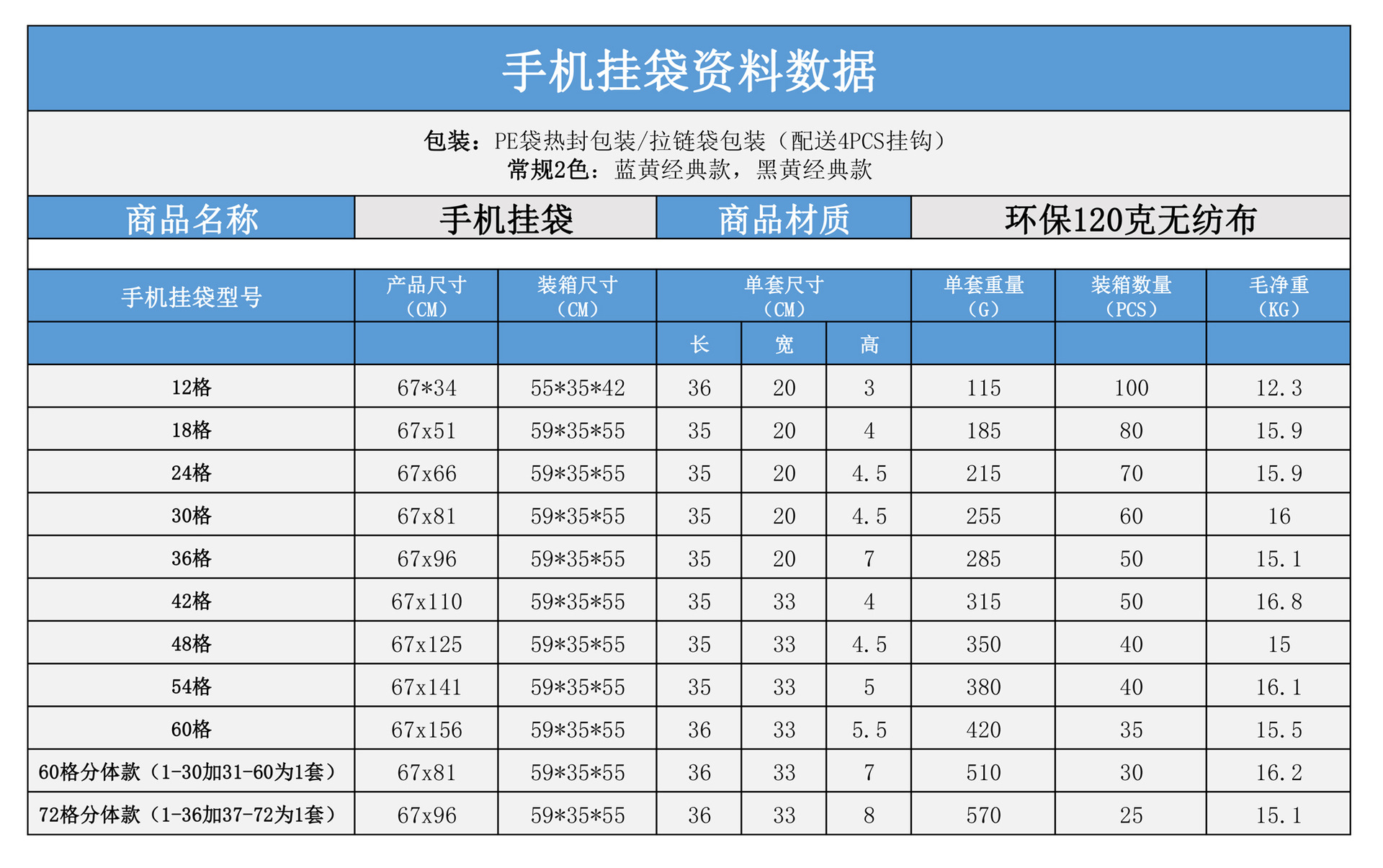 常规现货为蓝黄经典款,其他颜色可定制,起订量详谈。 产品包装:加厚自粘PE袋 产品配置:挂袋+4PCS镀银加强挂钩 (如挂钩配件不要,可以优惠1元,请联系客服改价)   全新120G料 建议拿样对比