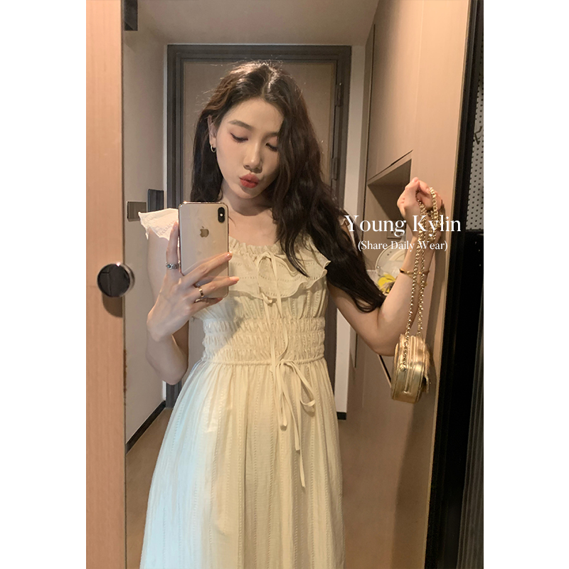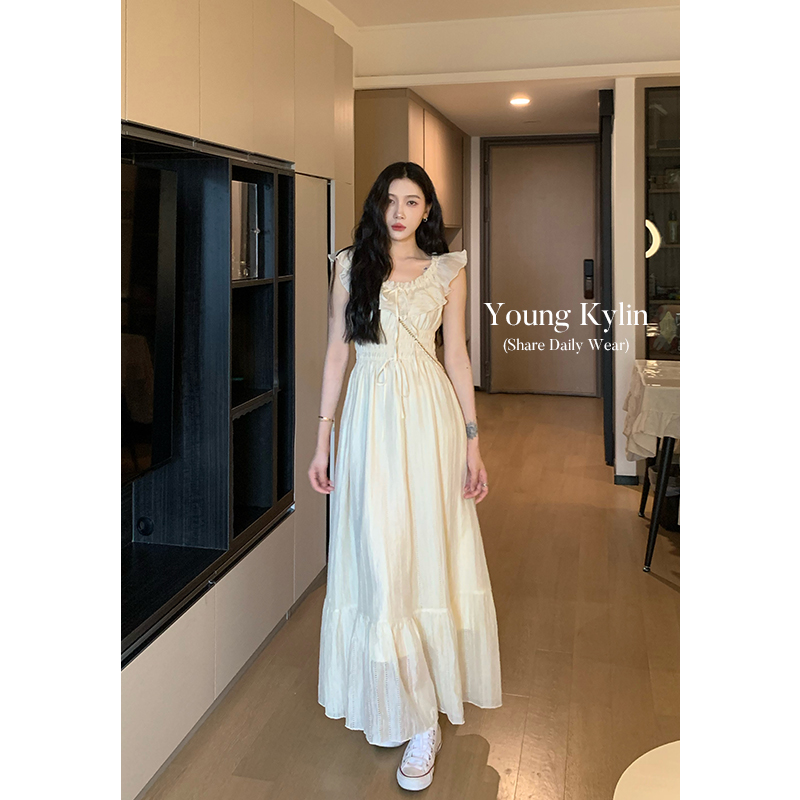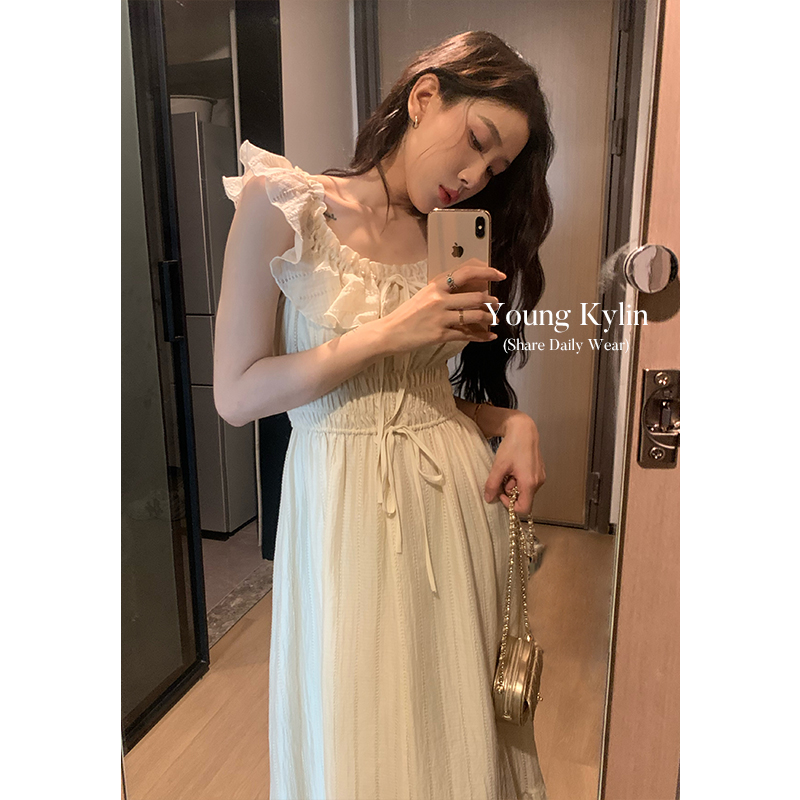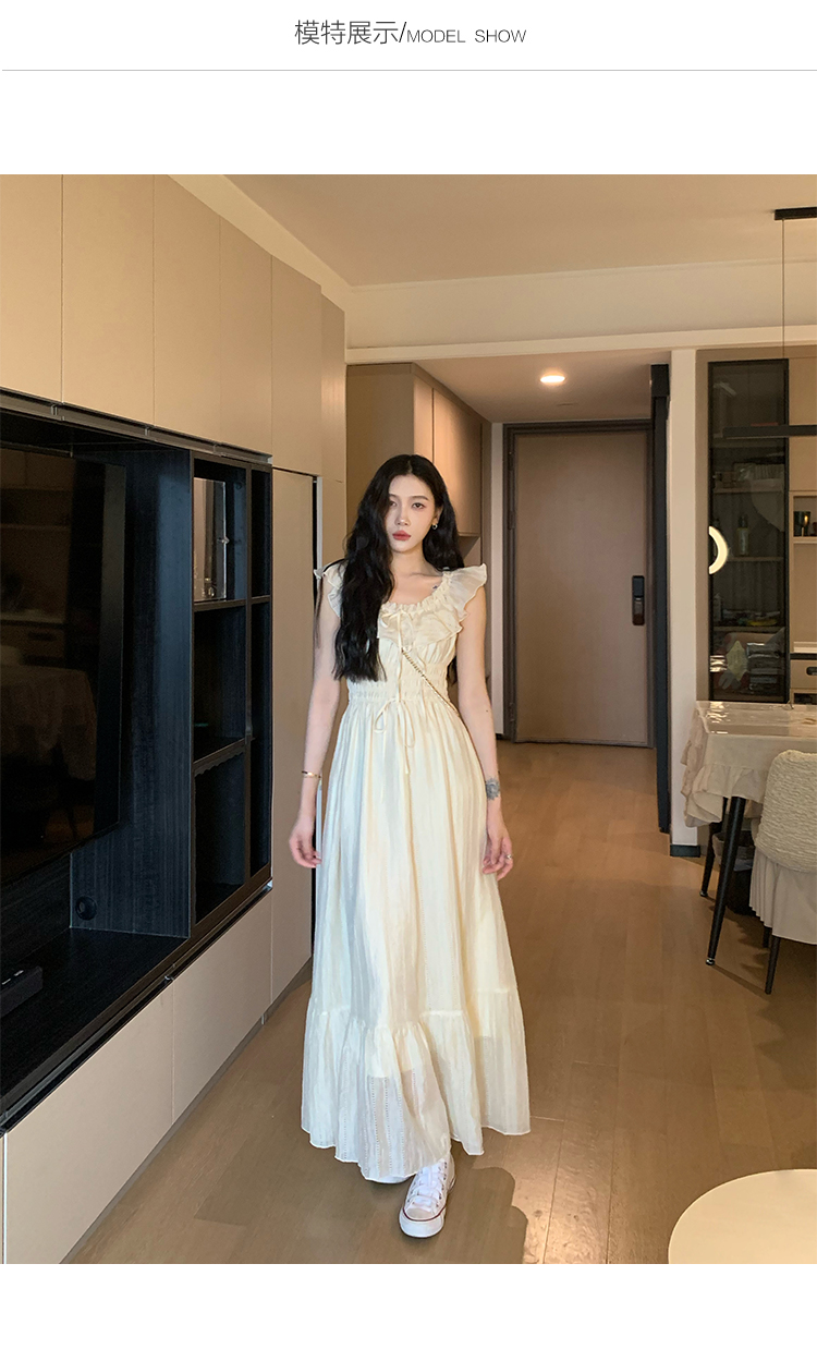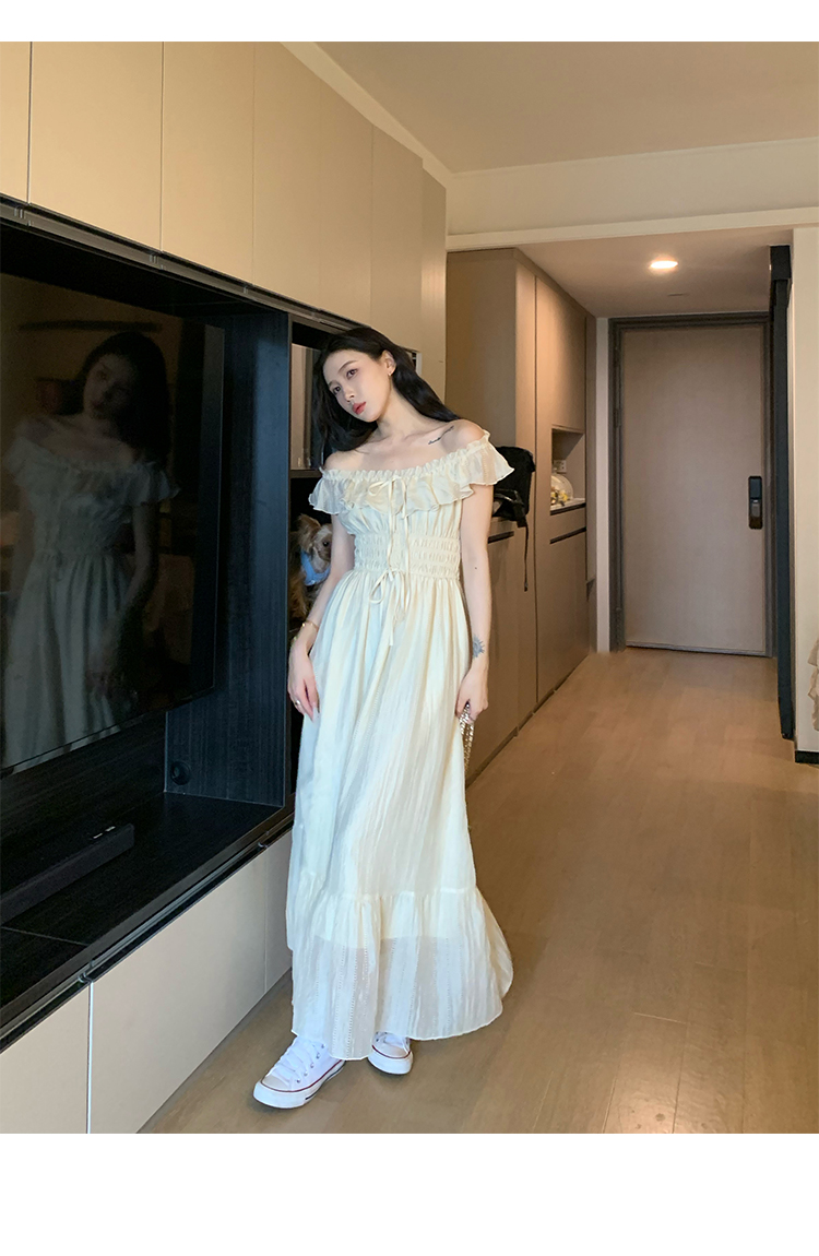 70不是七十一字肩度假洋裝女裝夏季溫柔風荷葉邊仙女裙收腰長裙