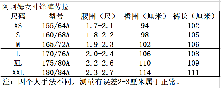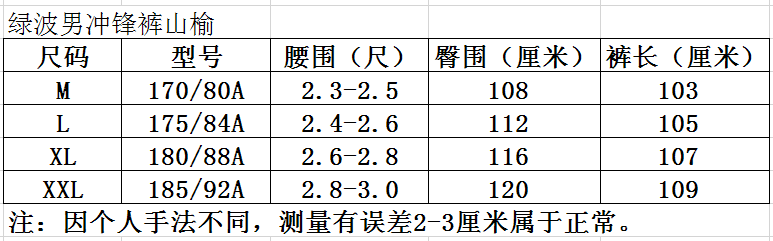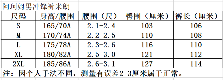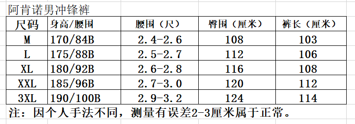 XXL(190/92B)腰围2.9-3.2尺    臀围126厘米   裤长112厘米