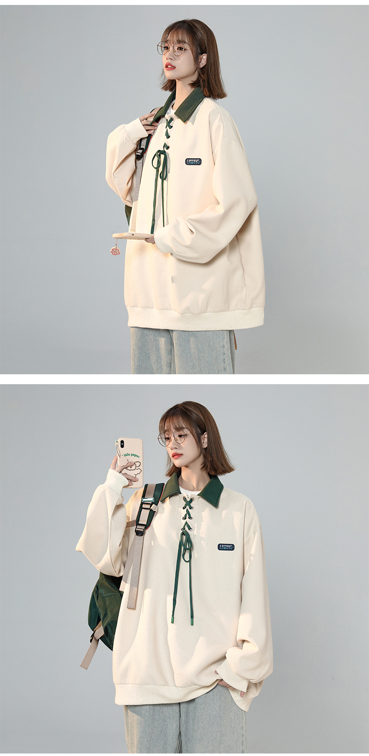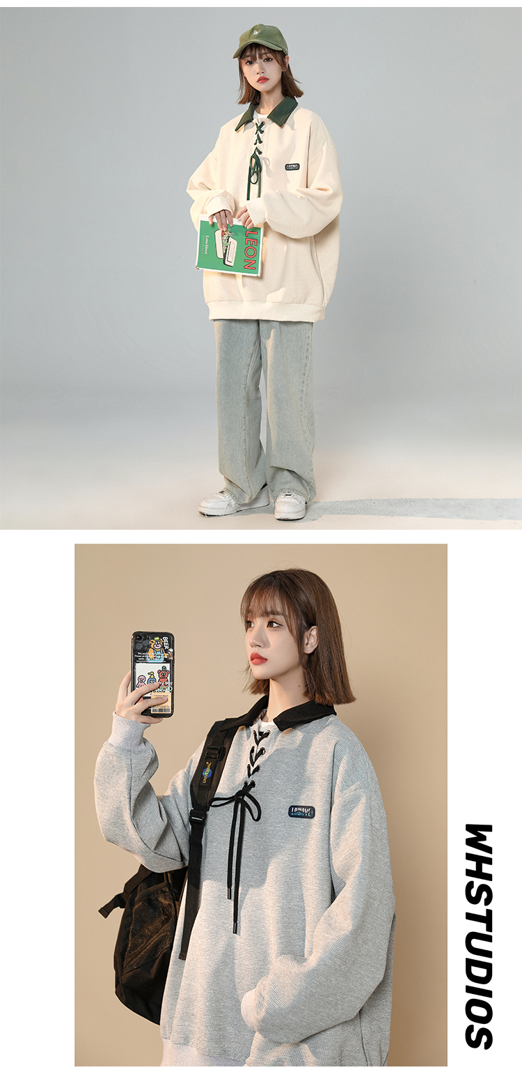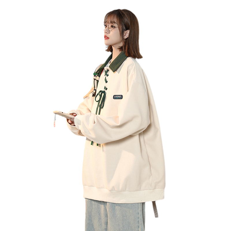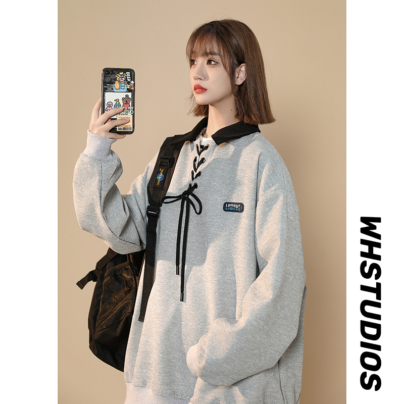 美式復古polo領衛衣女春季設計感小眾日系綁帶上衣2023新正肩外套