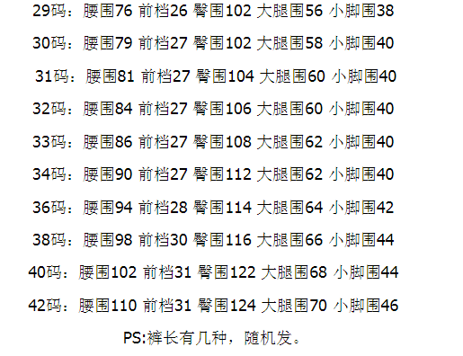 尺碼 29,30,31,32,33,34,36,38,40,42