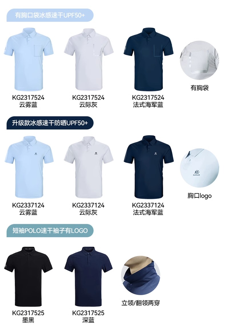 顏色分類 124雲際灰 冰感速乾+胸口logo,124雲霧藍 冰感速乾+胸口logo,124海軍藍 冰感速乾+胸口logo,524海軍藍 冰感速乾+胸口口袋,524雲際灰 冰感速乾+胸口口袋,524雲霧藍 冰感速乾+胸口口袋,525黑色 冰感速乾+立領兩穿,525深藍 冰感速乾+立領兩穿