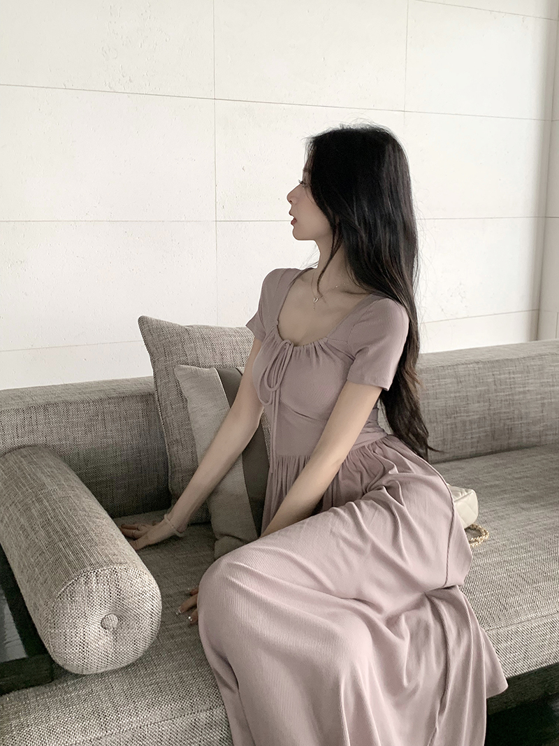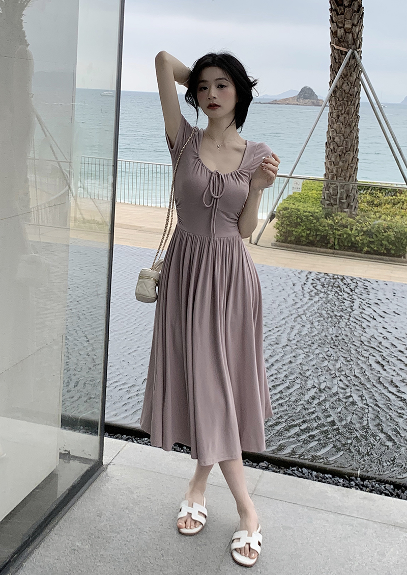 PPHOME柔情女主~法式氣質方領洋裝收腰顯瘦短裙褶皺中長版裙子