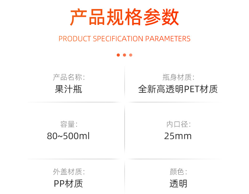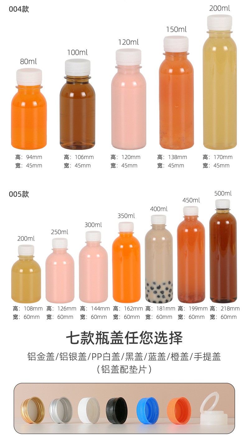 规格 80ML 004款PET果汁瓶,100ML 004款PET果汁瓶,120ML 004款PET果汁瓶,150ML 004款PET果汁瓶,200ML 004款PET果汁瓶,200ML 005款PET果汁瓶,250ML 005款PET果汁瓶,300ML 005款PET果汁瓶,350ML 005款PET果汁瓶,400ML 005款PET果汁瓶,450ML 005款PET果汁瓶,500ML 005款PET果汁瓶