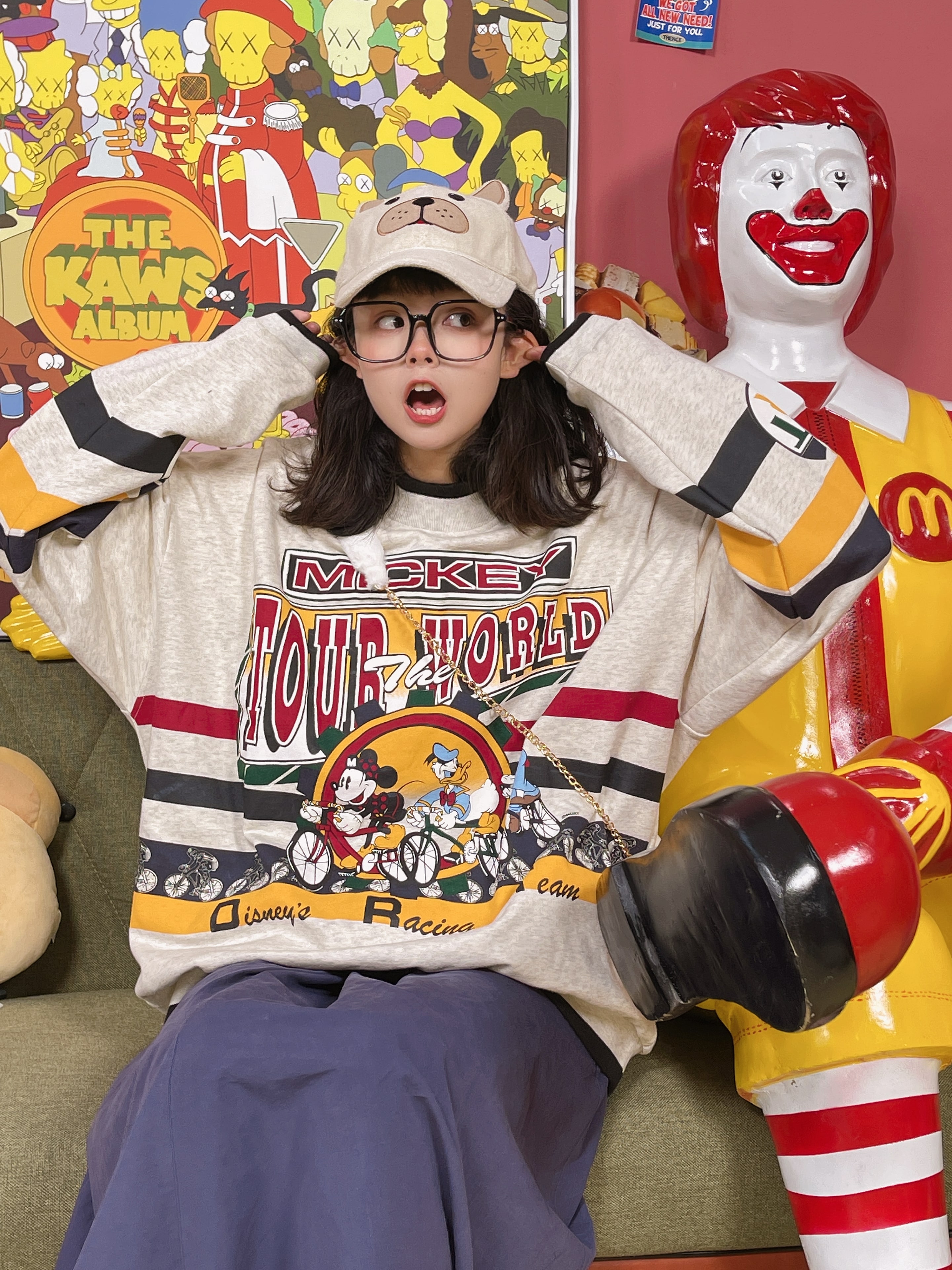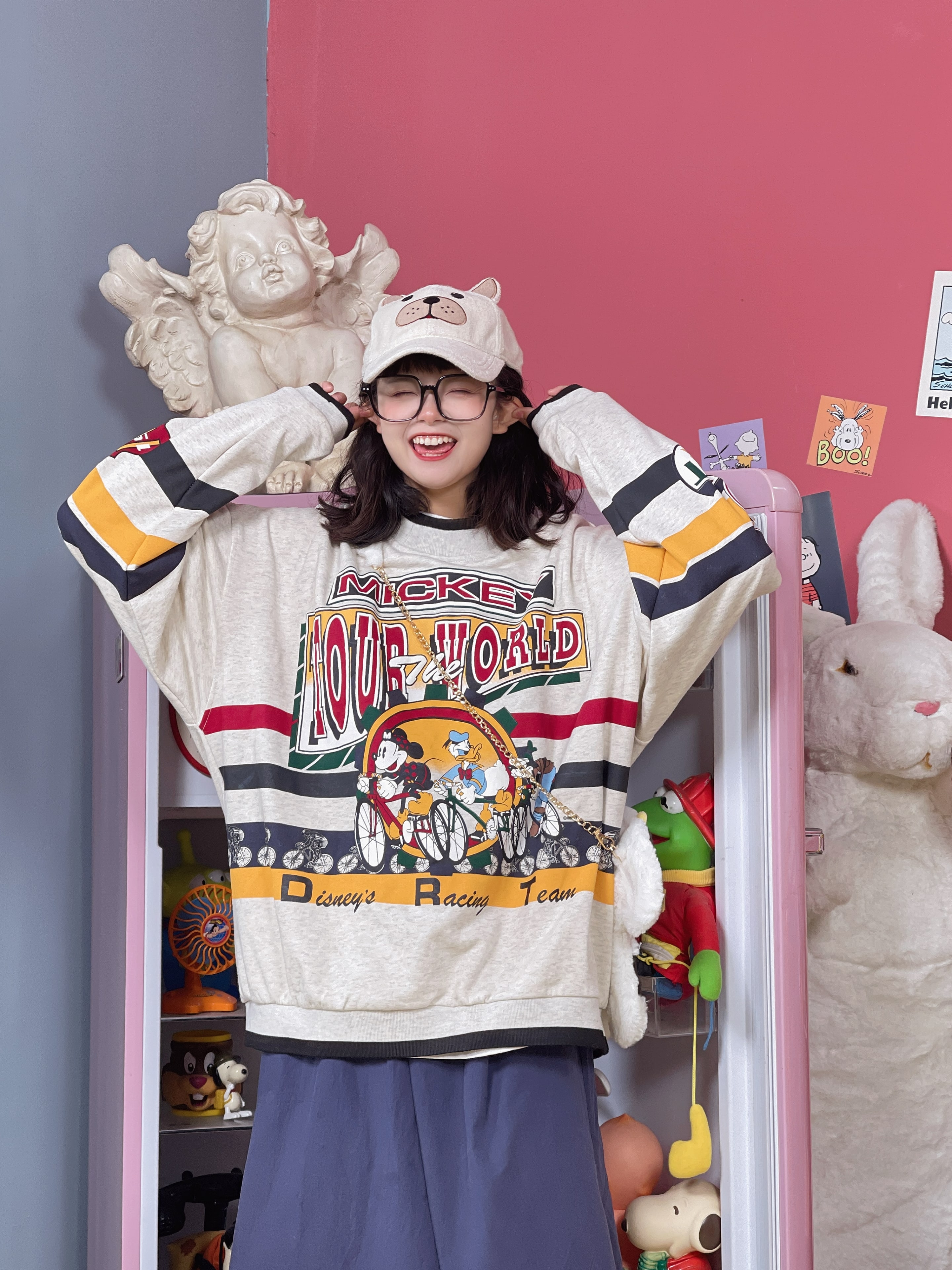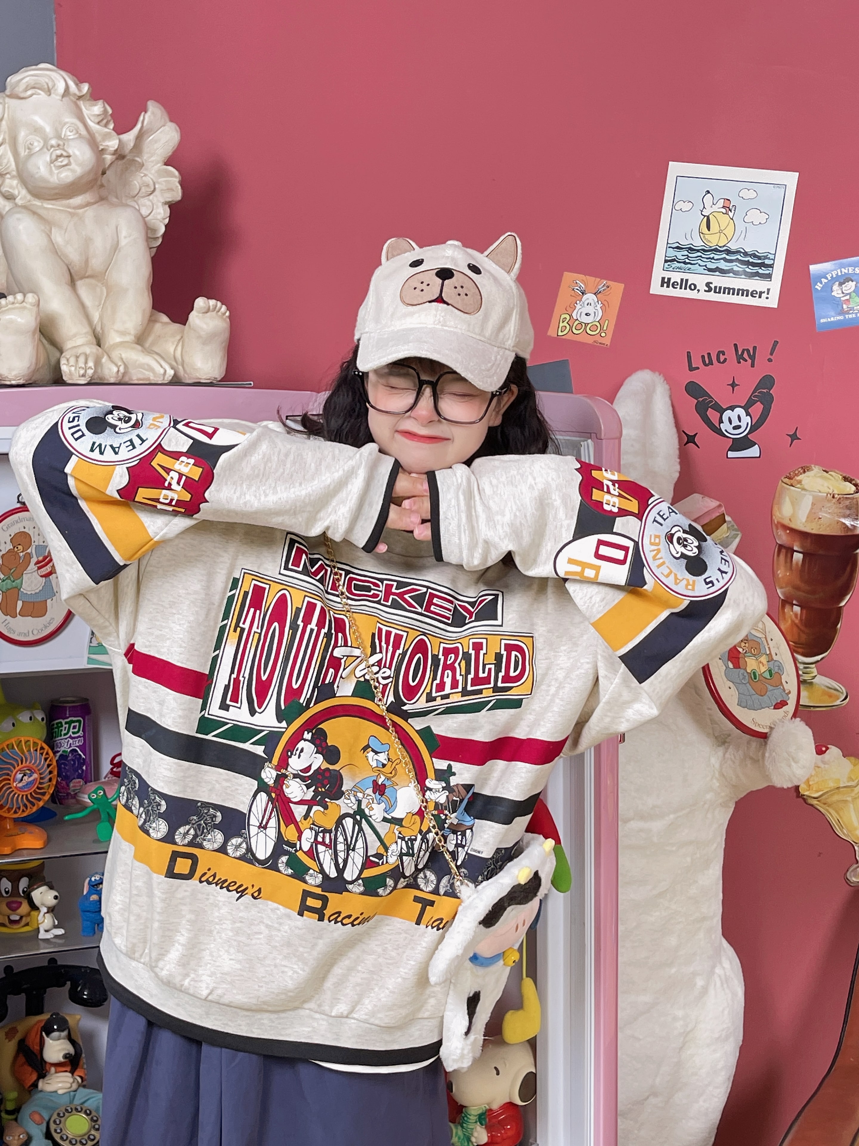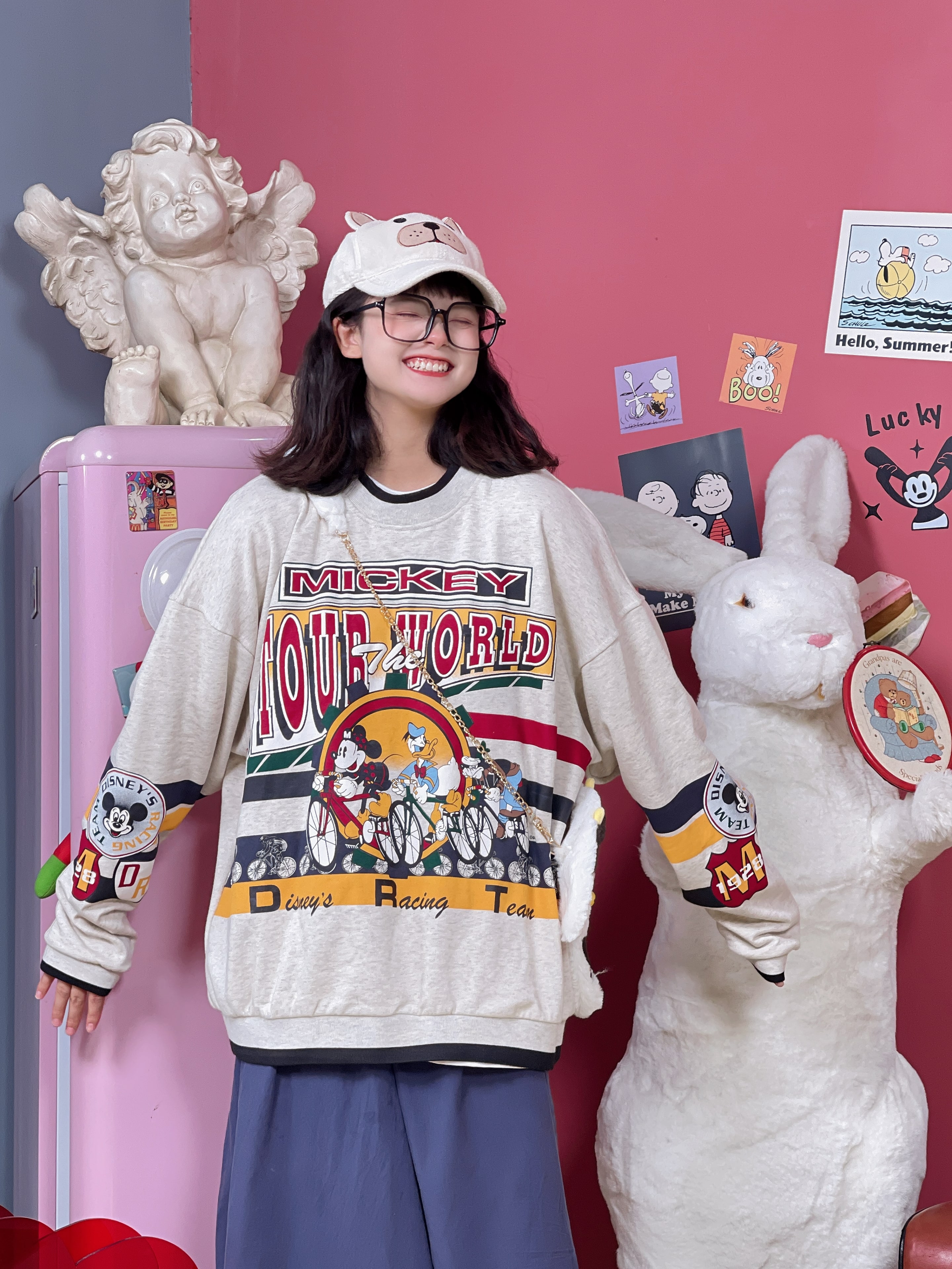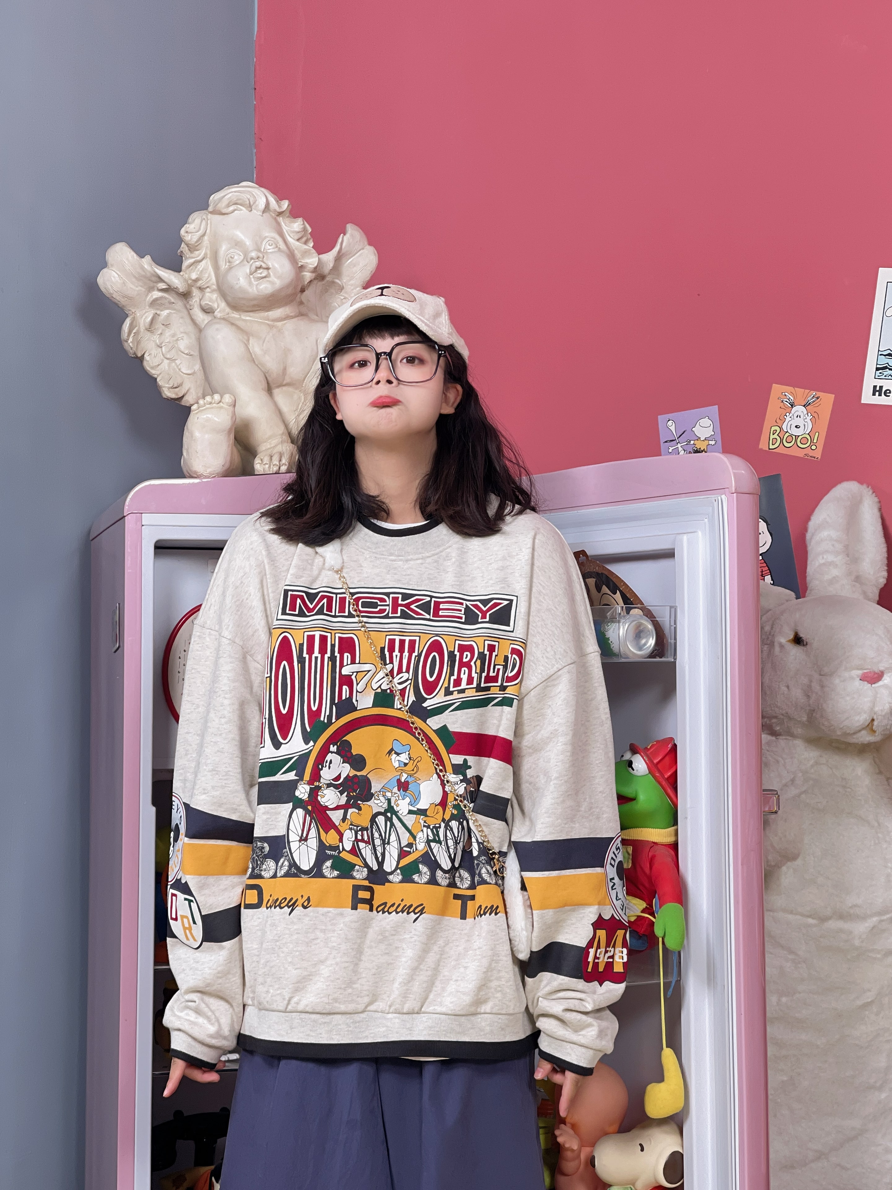 童趣古著日系復古純棉圓領厚棉T2023年春季寬鬆減齡卡通可愛情侶